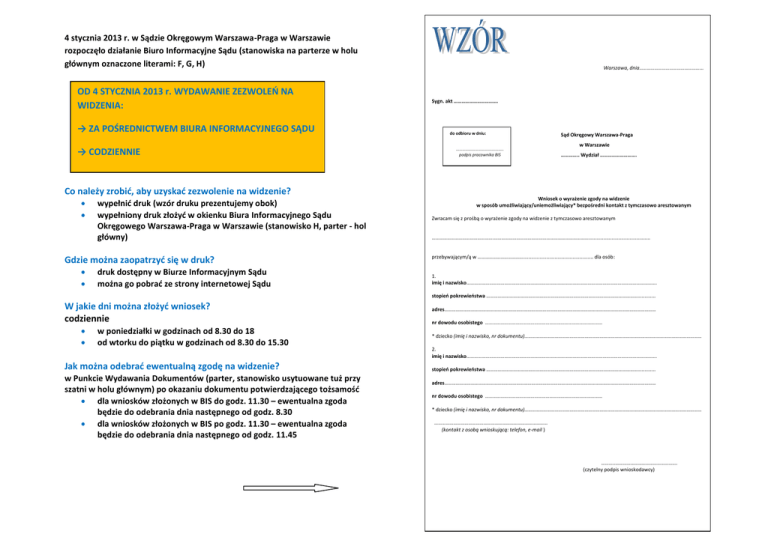 4 stycznia 2013 r. w Sądzie Okręgowym Warszawa-Praga w Warszawie rozpoczęło działanie Biuro Informacyjne Sądu (stanowiska na parterze w holu głównym oznaczone literami: F, G, H) OD 4 STYCZNIA 2013 r. WYDAWANIE ZEZWOLEŃ NA WIDZENIA: → ZA POŚREDNICTWEM BIURA INFORMACYJNEGO SĄDU → CODZIENNIE Warszawa, dnia…………………………………………… Sygn. akt ……………………………. do odbioru w dniu: …………………………….……….. podpis pracownika BIS Sąd Okręgowy Warszawa-Praga w Warszawie ………….. Wydział ………………………. do odbioru w dniu: Co należy zrobić, aby uzyskać zezwolenie na widzenie? wypełnić druk (wzór druku prezentujemy obok) wypełniony druk złożyć w okienku Biura Informacyjnego Sądu Okręgowego Warszawa-Praga w Warszawie (stanowisko H, parter - hol główny) Gdzie można zaopatrzyć się w druk? druk dostępny w Biurze Informacyjnym Sądu można go pobrać ze strony internetowej Sądu …………………………….……….. podpis pracownika BOI Wniosek o wyrażenie zgody na widzenie w sposób umożliwiający/uniemożliwiający* bezpośredni kontakt z tymczasowo aresztowanym Zwracam się z prośbą o wyrażenie zgody na widzenie z tymczasowo aresztowanym …………………………….……… .. ………………………………………….…………………………………………………………………............................................. podpis pracownika BOI przebywającym/ą w ………………………………................................................... dla osób: 1. imię i nazwisko……………………………………………………………………………………………………………………………………. stopień pokrewieństwa …………………………………………………………………………………………………………............. W jakie dni można złożyć wniosek? codziennie w poniedziałki w godzinach od 8.30 do 18 od wtorku do piątku w godzinach od 8.30 do 15.30 Jak można odebrać ewentualną zgodę na widzenie? w Punkcie Wydawania Dokumentów (parter, stanowisko usytuowane tuż przy szatni w holu głównym) po okazaniu dokumentu potwierdzającego tożsamość dla wniosków złożonych w BIS do godz. 11.30 – ewentualna zgoda będzie do odebrania dnia następnego od godz. 8.30 dla wniosków złożonych w BIS po godz. 11.30 – ewentualna zgoda będzie do odebrania dnia następnego od godz. 11.45 adres…………………………………………………………………………………………………………………………………………………… nr dowodu osobistego ………………………………………………………………………………… * dziecko (imię i nazwisko, nr dokumentu)…………………………………………………………………………………………………………………………… 2. imię i nazwisko……………………………………………………………………………………………………………………………………. stopień pokrewieństwa …………………………………………………………………………………………………………............. adres…………………………………………………………………………………………………………………………………………………… nr dowodu osobistego ………………………………………………………………………………… * dziecko (imię i nazwisko, nr dokumentu)…………………………………………………………………………………………………………………………… ……………………………………………………………………………… (kontakt z osobą wnioskującą: telefon, e-mail ) ………..…………………………………………. (czytelny podpis wnioskodawcy) *niepotrzebne skreślić
