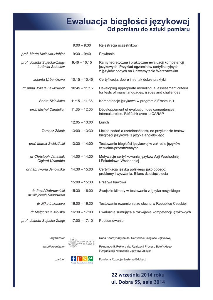 Ewaluacja biegłości językowej Od pomiaru do sztuki pomiaru 9:00 – 9:30 Rejestracja uczestników prof. Marta Kicińska-Habior 9:30 – 9:40 Powitanie prof. Jolanta Sujecka-Zając Ludmiła Sobolew 9:40 – 10:15 Ramy teoretyczne i praktyczne ewaluacji kompetencji językowych. Przykład egzaminów certyfikacyjnych z języków obcych na Uniwersytecie Warszawskim Jolanta Urbanikowa 10:15 – 10:45 Certyfikacja, dobre i nie tak dobre praktyki dr Anna Józefa Lewkowicz 10:45 – 11:15 Developing appropriate monolingual assessment criteria for tests of many languages: issues and challenges Beata Skibińska 11:15 – 11:35 Kompetencje językowe w programie Erasmus + prof. Michel Candelier 11:35 – 12:05 Développement et évaluation des compétences interculturelles. Réfléchir avec le CARAP 12:05 – 13:00 Lunch Tomasz Żółtak 13:00 – 13:30 Liczba zadań a rzetelność testu na przykładzie testów biegłości językowej z języka angielskiego prof. Marek Świdziński 13:30 – 14:00 Testowanie biegłości językowej w zakresie języków wizualno-przestrzennych dr Christoph Janasiak Olgierd Uziembło 14:00 – 14:30 Motywacje certyfikowania języków Azji Wschodniej i Południowo-Wschodniej dr hab. Iwona Janowska 14:30 – 15:00 Certyfikacja języka polskiego jako obcego: problemy i wyzwania. Bilans dziesięciolecia 15:00 – 15:30 Przerwa kawowa dr Józef Dobrowolski dr Wojciech Sosnowski 15:30 – 16:00 Swojskie klimaty w testowaniu z języka rosyjskiego dr Jitka Lukasova 16:00 – 16:30 Testowanie rozumienia ze słuchu w Republice Czeskiej dr Małgorzata Molska 16:30 – 17:00 Ewaluacja sumująca a rozwijanie kompetencji językowych prof. Jolanta Sujecka-Zając 17:00 – 17:10 Podsumowanie organizator Rada Koordynacyjna ds. Certyfikacji Biegłości Językowej współorganizator Pełnomocnik Rektora ds. Realizacji Procesu Bolońskiego i Organizacji Nauczania Języków Obcych partner Fundacja Rozwoju Systemu Edukacji 22 września 2014 roku ul. Dobra 55, sala 3014