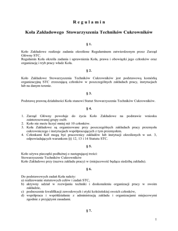 Regulamin Koła Zakładowego Stowarzyszenia Techników Cukrowników § 1. Koło Zakładowe realizuje zadania określone Regulaminem zatwierdzonym przez Zarząd Główny STC. Regulamin Koła określa zadania i uprawnienia Koła, prawa i obowiązki jego członków oraz organizację i tryb pracy władz Koła. § 2. Koło Zakładowe Stowarzyszenia Techników Cukrowników jest podstawową komórką organizacyjną STC zrzeszającą członków w poszczególnych zakładach pracy, instytucjach lub na danym terenie. § 3. Podstawę prawną działalności Koła stanowi Statut Stowarzyszenia Techników Cukrowników. § 4. 1. Zarząd Główny powołuje do życia Koło Zakładowe na podstawie wniosku zainteresowanej grupy osób. 2. Koło nie może liczyć mniej niż 10 członków. 3. Koła Zakładowe są organizowane przy poszczególnych zakładach pracy przemysłu cukrowniczego i instytucjach współpracujących z tym przemysłem. 4. Członkami Kół mogą być pracownicy zakładów lub instytucji określonych w ust. 3, odpowiadających warunkom §§ 12, 13 i 14 Statutu STC. § 5. Koło używa pieczątki podłużnej o następującej treści: Stowarzyszenie Techników Cukrowników Koło Zakładowe przy (nazwa zakładu pracy) w (miejscowość będąca siedzibą zakładu). § 6. Do podstawowych zadań Koła należy: a) realizowanie statutowych celów i zadań STC, b) aktywny udział w rozwijaniu techniki i doskonaleniu organizacji pracy w swoim zakładzie, c) podnoszenie kwalifikacji zawodowych i etyki koleżeńskiej swoich członków, d) współpraca i współdziałanie z administracją zakładu i organizacjami miejscowymi zgodnie z przyjętymi zasadami. § 7. 1 Swoje zadania Koło spełnia w szczególności poprzez: a) współpraca z kierownictwem zakładu oraz udział w pracach dotyczących rozwoju naukowo-technicznego i ekonomicznego, b) integracja zawodowa i społeczna członków STC oraz roztaczanie opieki nad młodymi inżynierami i technikami, a zwłaszcza ułatwianie im adaptacji społeczno-zawodowej w zakładzie, c) podnoszenie kwalifikacji zawodowych członków Koła oraz załogi zakładu pracy, d) organizowanie szkoleń i dyskusji dla członków Koła i załogi, e) krzewienie wśród członków Koła i całej załogi czytelnictwa literatury i prasy fachowej, informacji technicznej oraz sprawowanie opieki nad bibliotekami technicznymi, f) stwarzanie atmosfery aktywności społeczno-zawodowej członków STC, g) nawiązywanie i utrzymywanie kontaktów z uczelniami, instytucjami naukowobadawczymi, biurami projektowo-kosztorysowymi oraz z innymi stowarzyszeniami naukowo-technicznymi, h) organizowanie i popieranie wszelkich form samopomocy koleżeńskiej, i) organizowanie i prowadzenie zebrań i spotkań koleżeńskich, j) stała troska o warunki zatrudnienia i materialne członków Koła oraz sprawowanie opieki nad seniorami, członkami STC i korzystanie z ich doświadczenia zawodowego. § 8. 1. Członkiem Koła może być osoba, spełniająca warunki § 12 Statutu STC, która złoży pisemną deklarację o przystąpieniu do koła, a w przypadku kandydatów określonych w pkt. 2 § 12 Statutu wymagane jest podpisanie deklaracji przez dwóch członków wprowadzających, posiadających co najmniej 3-letni staż członkowski. Kandydatów przyjmuje Zarząd Koła. 2. Członkostwo wygasa w przypadku: a) dobrowolnego wystąpienia z STC zgłoszonego na piśmie,, b) skreślenia z listy STC z powodu nie opłacania składek członkowskich przez okres dłuższy niż 12 miesięcy, po dwukrotnym upomnieniu,, c) wykluczenia z STC za działalność sprzeczną z postanowieniami Statutu.. 3. Tryb ustalający wygaśniecie członkostwa określa § 17 statutu STC oraz postanowienia niniejszego regulaminu. § 9. 1. Każdy członek STC może należeć tylko do jednego Kola STC. Przeniesienie z jednego Koła do drugiego następuje jednocześnie ze zmianą miejsca pracy. Z chwilą przeniesienia członka – Zarząd Koła, które członek opuścił, zawiadamia o tym na piśmie właściwe Koło, podając dokładnie datę przeniesienia i stan opłaconych składek członkowskich. 2. Członkowie przechodzący na emeryturę mają prawo wyboru Kola, do którego chcieliby należeć. § 10. Członek Koła zobowiązany jest do: a) przestrzegania i realizowania postanowień statutu, regulaminów i uchwał władz STC, b) brania czynnego udziału w życiu STC, c) dbania o należyty poziom etyki koleżeńskiej wśród członków Koła, d) stałego podnoszenia kwalifikacji zawodowych, e) regularnego opłacania składek członkowskich. 2 § 11. W stosunku do członków nie przestrzegających któregokolwiek z obowiązków, o których mowa w § 10, Koło może zastosować następujące kary: a) upomnienie udzielone przez Zarząd Koła, b) skreślenie z listy członków, c) wykluczenie, Decyzję o skreśleniu i wykluczeniu podejmuje Zarząd Koła z zachowaniem przepisów § 17 statutu STC. § 12. Członek Koła korzysta z wszelkich praw przewidzianych w Statucie STC dla członków zwyczajnych określonych w § 15 Statutu. § 13. 1. Władzami Koła są: a) Walne Zebranie b) Zarząd Koła 2. Kadencja Zarządu Koła trwa 3 lata. 3. Działalność Koła nadzoruje Zarząd Główny STC. 4. Uchwały władz Koła zapadają zwykłą większością głosów, przy obecności co najmniej połowy liczby członków uprawnionych do głosowania. W razie równej liczby głosów za i przeciw rozstrzyga głos przewodniczącego zebrania. 5. Walne Zebranie Koła powołuje Komisję Rewizyjną Koła. Zakres działania Komisji Rewizyjnej Koła określa regulamin Komisji Rewizyjnej STC. 6. Komisja Rewizyjna STC ma prawo przeprowadzać kontrolę działalności Koła. § 14. 1. Walne Zebranie sprawozdawczo-wyborcze Koła zwołuje Zarząd Koła raz na 3 lata. 2. Zawiadomienie o Walnym Zebraniu wraz z porządkiem obrad winno być podane do wiadomości wszystkich członków Koła co najmniej na 14 dni przed terminem zebrania. § 15. Walne Zebranie i Nadzwyczajne Walne