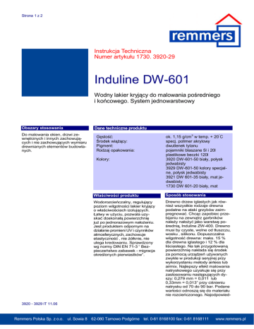 Strona 1 z 2 Instrukcja Techniczna Numer artykułu 1730. 3920-29 Induline DW-601 Wodny lakier kryjący do malowania pośredniego i końcowego. System jednowarstwowy Obszary stosowania Do malowania okien, drzwi zewnętrznych i innych zachowujących i nie zachowujących wymiaru drewnianych elementów budowlanych. Dane techniczne produktu Gęstość: Środek wiążący: Pigment: Rodzaj opakowania: Kolory: ok. 1,15 g/cm3 w temp. + 20°C specj. polimer akrylowy dwutlenek tytanu pojemniki blaszane 5l i 20l plastikowe beczki 120l 3920 DW-601-50 biały, połysk jedwabisty 3929 DW-601-50 kolory specjalne, połysk jedwabisty 3921 DW 601-35 biały, mat jedwabisty 1730 DW 601-20 biały, mat Właściwości produktu Sposób stosowania Wodorozcieńczalny, regulujący poziom wilgotności lakier kryjący o właściwościach izolujących. Łatwy w użyciu, pozwala uzyskać doskonałą powierzchnię już po jednorazowym nałożeniu. Jest produktem odpornym na działanie promieni UV i czynników atmosferycznych, zachowuje elastyczność , nie żółknie, nie ulega kredowaniu. Sprawdzony wg normy DIN EN 71-3 “ Bezpieczeństwo zabawek - migracja określonych pierwiastków”. Drewno drzew iglastych jak również wszystkie rodzaje drewna podatne na ataki grzybów zaimpregnować. Chcąc zapobiec przebijaniu na zewnątrz garbników należy nałożyć jako warstwę pośrednią, Induline ZW-400. Drewno musi by czyste, wolne od tłuszczu, wosku , silikonu. Dopuszczalna wilgotność drewna: maks. 15 % dla drewna iglastego i 12 % dla liściastego. Na tak przygotowaną powierzchnię nakłada się środek za pomocą urządzeń używanych zwykle w produkcji seryjnej przy wykorzystaniu metody airless lub airmix. Najlepszy efekt malowania natryskowego uzyskuje się przy zastosowaniu następujących dyszy: 0,279 mm = 0,011 lub 0,33mm = 0,013” przy ciśnieniu natrysku od 70 do 90 bar. Podane wartości odnoszą się do materiału nie rozcieńczonego. Najodpowied- 3920 - 3929 IT 11.06 Remmers Polska Polska Sp. Sp. zz o.o. o.o. ul. ul. Sowia Sowia 88 62-080 62-080 Tarnowo Tarnowo Podgórne Podgórne tel. tel. 0-61 0-61 8168100 8168100 fax: fax: 0-61 0-61 8168111 8168111 Remmers www.remmers.pl www.remmers.pl Strona 2 z 2 niejsza temperatura materiału to +15 do +20°C. Zaleca się sprawdzenie wzajemnej tolerancji środka z podłożem poprzez wykonanie próbnego malowania. W sprawie zaleceń dotyczących metody nakładania powłok w zależności od rodzaju drewna, dla zastosowań takich, jak okna i drzwi zewnętrzne, proszę skontaktować się z doradcami technicznymi firmy Remmers Polska. Zużycie Ilość nakładanego materiału: 150 - 300 ml/m2. Grubość powłoki mokrej: ok. 150 - 300 μm. Grubość powłoki suchej: 60 - 120 μm. Podane wartości odnoszą się do nierozcieńczonego materiału. Schnięcie Pyłosuchość po: ok. 1 godz. Powierzchniowo sucha: ok.2 godz. Dalsza obróbka po: ok. 4 godz. Wartości sprawdzone praktycznie w temp. +200C i 65% wilgotności względnej powietrza. Niższe temperatury i wyższe wilgotności wydłużają proces wysychania. Rozcieńczanie W razie potrzeby rozcieńczyć wodą (maks. 5%). Trwałość podczas przechowywania być używany w warunkach bezpośredniego oddziaływania promieni słonecznych , w temperaturze poniżej +15°C i powyżej +30°C. Względna wilgotno powietrza może wynosić maks.85 %. Należy zapewnić odpowiednie wietrzenie pomieszczeń, zwłaszcza przy produkcji seryjnej. Stosowane materiały uszczelniające muszą wykazywać tolerancję z powłoką malarską i mogą być nałożone dopiero wtedy, gdy jest ona już dostatecznie sucha Profile uszczelniające zawierające plastyfikatory mają w połączeniu z lakierami zawiesinowymi tendencję do sklejania się. Należy zatem stosować takie profile, które ich nie zawierają. Reklamacje dotyczące koloru będą rozpatrywane tylko wtedy, jeżeli przed rozpoczęciem realizacji obiektu wykonana zostanie próbka i przesłana do nas w celu usunięcia usterek. W innych wypadkach reklamacje dotyczące kolorystyki nie mogą być przez nas niestety uznane. rozpylonej cieczy. Dbać o dobrą wentylacje podczas obróbki i po jej zakończeniu. W przypadku zanieczyszczenia oczu lub skóry natychmiast dokładnie spłukać wodą. Nie dopuścić do przedostania się do kanalizacji, wód powierzchniowych lub gruntu. o recyklingu przekazywać tylko całkowicie opróżnione opakowania. Kod produktu: M-LW 01 Oznaczenie GefStoffV: GGVS/ADR: 1 -/- Skład chemiczny Akryl/poliuretan, dwutlenek tytanu, SiO2, glikole, woda. Narzędzia, czyszczenie Pistolety ręczne, automatyczne urządzenia natryskowe. Narzędzia po użyciu natychmiast przemyć wodą i środkiem myjącym. Brudną ciecz usunąć zgodnie z przepisami. Zawartość lotnych substancji organicznych Przechowywane w zamkniętych oryginalnych opakowaniach, w miejscu suchym, nie narażonym na działanie mrozu nadaje się do użycia przez co najmniej 1 rok. Kolory specjalne - maks. 3 miesiące. Wyznaczona przez UE wartość graniczna dla tego produktu (kat. A/d): 150g/l (2007), 130g/l (2010). Ten produkt zawiera maksymalnie 60 g/l VOC. Wskazówki Bezpieczeństwo / usuwanie Induline DW - 601 nie powinien Chronić przed dziećmi. Nie wdychać Powyższe wskazówki zostały zestawione w naszym dziale produkcji według najnowszego stanu wiedzy i techniki stosowania. Ponieważ rodzaje zastosowań i sposób użycia są poza naszą kontrolą, z treści tej instrukcji nie wynika żadna odpowiedzialność producenta. Wskazówki wykraczające poza zawartość tej instrukcji lub wskazówki różniące się od treści instrukcji wymagają pisemnego potwierdzenia przez zakład macierzysty. W każdym przypadku obowiązują nasze ogólne warunki handlowe. Z wydaniem niniejszej instrukcji technicznej poprzednie tracą swoją ważność. 3920 - 3929 IT 11.06 Remmers Polska Sp. z o.o. ul. Sowia 8 62-080 Tarnowo Podgórne tel. 0-61 8168100 fax: 0-61 8168111 www.remmers.pl