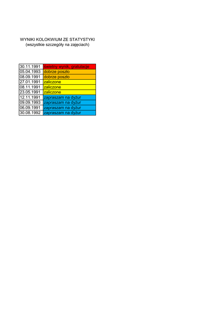 WYNIKI KOLOKWIUM ZE STATYSTYKI (wszystkie szczegóły na zajęciach) 30.11.1991 05.04.1993 08.09.1991 27.01.1991 08.11.1991 23.05.1991 12.11.1991 09.09.1993 06.09.1991 30.08.1992 świetny wynik, gratulacje dobrze poszło dobrze poszło zaliczone zaliczone zaliczone zapraszam na dyżur zapraszam na dyżur zapraszam na dyżur zapraszam na dyżur