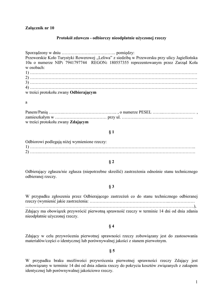 Załącznik nr 10 Protokół zdawczo - odbiorczy nieodpłatnie użyczonej rzeczy Sporządzony w dniu ……………………………….. pomiędzy: Przeworskie Koło Turystyki Rowerowej „Leliwa” z siedzibą w Przeworsku przy ulicy Jagiellońska 10a o numerze NIP: 7941797744 REGON: 180557355 reprezentowanym przez Zarząd Koła w osobach: 1) ……………………………………………………………………………………………………… 2) ……………………………………………………………………………………………………… 3) ……………………………………………………………………………………………………… 4) ……………………………………………………………………………………………………… w treści protokołu zwany Odbierającym a Panem/Panią ……….……………………………….. , o numerze PESEL ……..……..…………… , zamieszkałym w ……………………………… przy ul. ……….…………………………………. w treści protokołu zwany Zdającym §1 Odbiorowi podlegają niżej wymienione rzeczy: 1) …………………………………………………………………………………………………….. 2) …….………………………………………………………………………………………………. §2 Odbierający zgłasza/nie zgłasza (niepotrzebne skreślić) zastrzeżenia odnośnie stanu technicznego odbieranej rzeczy. §3 W przypadku zgłoszenia przez Odbierającego zastrzeżeń co do stanu technicznego odbieranej rzeczy (wymienić jakie zastrzeżenia: ………………………………………………..……………… ……………………………………………………………………………………………………….), Zdający ma obowiązek przywrócić pierwotną sprawność rzeczy w terminie 14 dni od dnia zdania nieodpłatnie użyczonej rzeczy. §4 Zdający w celu przywrócenia pierwotnej sprawności rzeczy zobowiązany jest do zastosowania materiałów/części o identycznej lub porównywalnej jakości z stanem pierwotnym. §5 W przypadku braku możliwości przywrócenia pierwotnej sprawności rzeczy Zdający jest zobowiązany w terminie 14 dni od dnia zdania rzeczy do pokrycia kosztów związanych z zakupem identycznej lub porównywalnej jakościowo rzeczy. 1 §6 Protokół sporządzono w 2 jednobrzmiących egzemplarzach. ……………………… ……………………… ……………………… ……………………… podpisy Zarządu Koła ………………………………………………… podpis osoby pełnoletniej lub prawnego opiekuna osoby niepełnoletniej 2