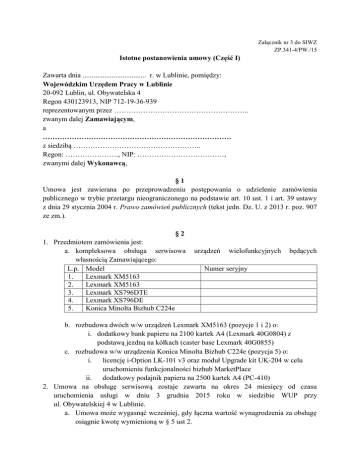 Załącznik nr 3 do SIWZ ZP.341-4/PW./15 Istotne postanowienia umowy (Część I) Zawarta dnia ................................... r. w Lublinie, pomiędzy: Wojewódzkim Urzędem Pracy w Lublinie 20-092 Lublin, ul. Obywatelska 4 Regon 430123913, NIP 712-19-36-939 reprezentowanym przez ……………………………………………….. zwanym dalej Zamawiającym, a …………………………………………………………………… z siedzibą …………………………………………….. Regon: …………………., NIP: ………………………………, zwanymi dalej Wykonawcą, §1 Umowa jest zawierana po przeprowadzeniu postępowania o udzielenie zamówienia publicznego w trybie przetargu nieograniczonego na podstawie art. 10 ust. 1 i art. 39 ustawy z dnia 29 stycznia 2004 r. Prawo zamówień publicznych (tekst jedn. Dz. U. z 2013 r. poz. 907 ze zm.). §2 1. Przedmiotem zamówienia jest: a. kompleksowa obsługa serwisowa własnością Zamawiającego: L.p. Model 1. Lexmark XM5163 2. Lexmark XM5163 3. Lexmark XS796DTE 4. Lexmark XS796DE 5. Konica Minolta Bizhub C224e urządzeń wielofunkcyjnych będących Numer seryjny b. rozbudowa dwóch w/w urządzeń Lexmark XM5163 (pozycje 1 i 2) o: i. dodatkowy bank papieru na 2100 kartek A4 (Lexmark 40G0804) z podstawą jezdną na kółkach (caster base Lexmark 40G0855) c. rozbudowa w/w urządzenia Konica Minolta Bizhub C224e (pozycja 5) o: i. licencję i-Option LK-101 v3 oraz moduł Upgrade kit UK-204 w celu uruchomieniu funkcjonalności bizhub MarketPlace ii. dodatkowy podajnik papieru na 2500 kartek A4 (PC-410) 2. Umowa na obsługę serwisową zostaje zawarta na okres 24 miesięcy od czasu uruchomienia usługi w dniu 3 grudnia 2015 roku w siedzibie WUP przy ul. Obywatelskiej 4 w Lublinie. a. Umowa może wygasnąć wcześniej, gdy łączna wartość wynagrodzenia za obsługę osiągnie kwotę wymienioną w § 5 ust 2. 3. Zamawiający zastrzega sobie prawo do ewentualnego przeniesienia urządzeń (po uprzednim porozumieniu się z Wykonawcą) do Filii WUP (Biała Podlaska, Chełm, Zamość) w trakcie trwania umowy. 4. Rozbudowa urządzeń, o której mowa w ustępie 1, punkty b i c powinna nastąpić do ….. grudnia 2015 roku 1. 2. 3. 4. 5. 6. 7. 8. §3 Wykonawca zobowiązuje się do obsługi serwisowej urządzeń mającej na celu zapewnienie ciągłej sprawności technicznej i gotowości do pracy oraz stałej, wysokiej jakości wydruku/kopii. Obsługa serwisowa w szczególności obejmuje: a. wykonywanie przeglądów technicznych urządzeń zgodnie z wymogami określonymi przez producenta, b. dokonywanie napraw, regulacji oraz kontroli stanu technicznego urządzeń, a także innych czynności niezbędnych do zapewnienia prawidłowego i ciągłego funkcjonowania urządzeń, c. wymiany uszkodzonych części, d. zapewnienia urządzeń zastępczych w przypadku braku możliwości dokonania naprawy w terminie określonym jako czas reakcji serwisowej – patrz ust. 10, e. dostawy części i materiałów eksploatacyjnych (w tym m.in. tonerów czy bębnów) z wyjątkiem papieru, f. systematyczny odbiór od Zamawiającego zużytych materiałów eksploatacyjnych i części zamiennych. Dostarczone przez Wykonawcę części zamienne muszą być oryginalne, tj. pochodzić od producenta urządzenia wielofunkcyjnego. Zamawiający nie dopuszcza zastosowania części zamiennych i materiałów po regeneracji (rozumiane jako dostosowanie produktu do ponownego użycia poprzez napełnienie, naprawienie czy regenerację). Zamawiający dopuszcza jednak materiały fabrycznie nowe, do produkcji których użyto materiałów z odzysku (recyklingu). Używanie dostarczanych przez Wykonawcę materiałów eksploatacyjnych i części zamiennych nie może wpływać negatywnie na pracę samego urządzenia oraz powodować obniżenia jakości wydruku. Jeżeli w trakcie umowy Zamawiający stwierdzi, iż wydajność, jakość lub niezawodność dostarczonych materiałów eksploatacyjnych niekorzystnie odbiega od standardów producenta urządzeń, Wykonawca zobowiązuje się do wymiany materiałów na nowe, wolne od wad, w terminie 1 dnia roboczego od momentu zgłoszenia przez Zamawiającego. Zamawiający będzie składał zgłoszenia serwisowe drogą elektroniczną, telefonicznie bądź faksem w dni robocze od poniedziałku do piątku w godzinach od 7:30 do 15:30. Zamawiający zawiadomi Wykonawcę o konieczności wykonania odpowiednich napraw i konserwacji, o ile taka informacja nie będzie generowana przez urządzenia automatycznie. Obsługa serwisowa będzie wykonywana m.in. w terminach wynikających z instrukcji eksploatacyjnych poszczególnych typów maszyn oraz w przypadku wezwania celem poprawy jakości druku lub awarii (o ile taka informacja nie będzie generowana przez 2 urządzenia automatycznie), nie rzadziej niż raz na półrocze przeprowadzana będzie konserwacja wszystkich urządzeń. 9. Każdorazowa wizyta serwisu będzie odnotowana w książce pracy urządzenia wraz z informacjami o czynnościach przeprowadzonych w ramach wykonywania usługi, będącej przedmiotem umowy. W przypadku braku książki pracy urządzenia Wykonawca jest zobowiązany założyć taka książkę. Książka będzie znajdowała się u Zamawiającego. 10. Czas reakcji serwisowej Wykonawcy wynosi 8 następujących po sobie godzin roboczych (godziny robocze to godziny pracy Zamawiającego) od przyjęcia zawiadomienia. Reakcją serwisową jest naprawa urządzenia lub podstawienie urządzenia zastępczego. Urządzenie zastępcze powinno zostać zainstalowane i skonfigurowane identycznie jak urządzenie, które uległo awarii. a. W przypadku opisanym w § 2 ust. 3 czas reakcji serwisowej dla urządzeń znajdujących się Filiach wynosi 16 godzin roboczych. 11. W przypadku dostarczenia urządzenia zastępczego Wykonawca zobowiązany jest do naprawy niesprawnego urządzenia oraz ponownego zainstalowania i uruchomienia go w ciągu 30 dni od przyjęcia zgłoszenia. 12. Obsług