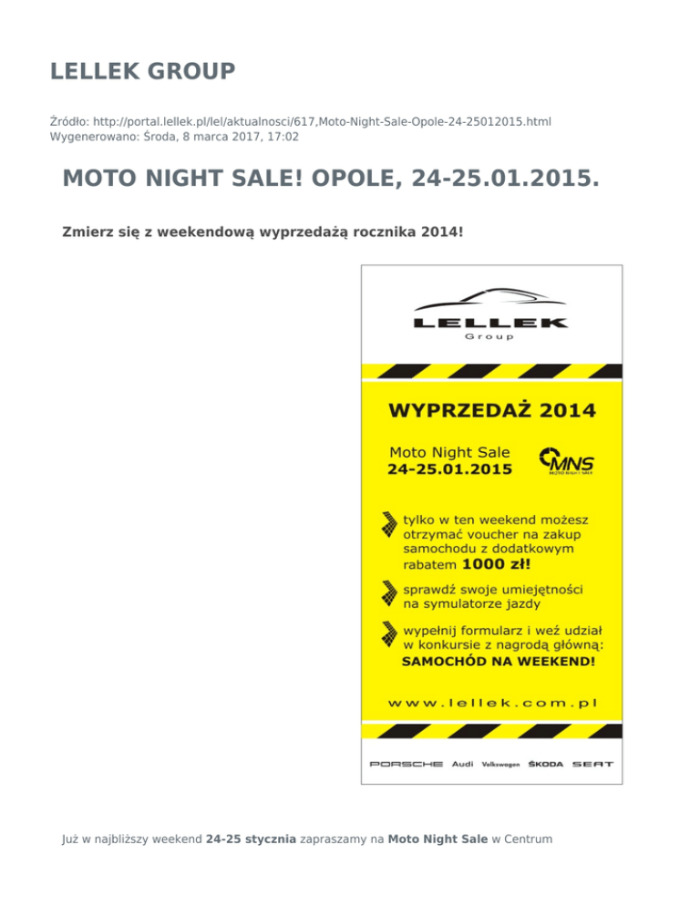 LELLEK GROUP Źródło: http://portal.lellek.pl/lel/aktualnosci/617,Moto-Night-Sale-Opole-24-25012015.html Wygenerowano: Środa, 8 marca 2017, 17:02 MOTO NIGHT SALE! OPOLE, 24-25.01.2015. Zmierz się z weekendową wyprzedażą rocznika 2014! Już w najbliższy weekend 24-25 stycznia zapraszamy na Moto Night Sale w Centrum Wystawienniczo-Kongresowym w Opolu, ul. Wrocławska 158. Czeka Was moc atrakcji, niesamowite promocje i oczywiście piękne samochody! Co dla Was przygotowaliśmy? ● vouchery upoważniające do skorzystania z rabatu 1000 zł brutto na zakup nowego lub używanego samochodu lub zakup oryginalnych akcesoriów przy jednoczesnym zakupie samochodu w siedzibach LELLEK Group w Sławicach - Opolu lub Nysie* ● potężną dawkę emocji podczas wirtualnego wyścigu symulatorami jazdy! ● konkurs z nagrodą główną -> SAMOCHÓD ● ekscytujące jazdy próbne modelami Volkswagen, Skoda, SEAT ● prezentację niesamowitego, napędzanego adrenaliną AUDI NA WEEKEND! TT Zapraszamy! Szczegółowy ROZKŁAD JAZDY wydarzenia wraz z opisem czekających na Was atrakcji znajdziecie na stronie WWW. Nie może Was zabraknąć! * Szczegóły promocji dostępne u doradców handlowych LELLEK Group w czasie trwania Moto Night Sale. Promocja trwa do 28.02.2015 r. Voucher jest jednorazowy i nie podlega wymianie na gotówkę, traci ważnośc wraz z terminem zakończenia promocji. Uczestnik promocji wyraża zgodę na przetwarzanie danych osobowych w zakresie podanym na kuponie do celów związanych z realizacją promocji. Tweetnij