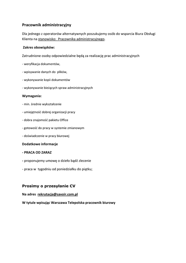 Pracownik administracyjny Dla jednego z operatorów alternatywnych poszukujemy osób do wsparcia Biura Obsługi Klienta na stanowisko: Pracownika administracyjnego. Zakres obowiązków: Zatrudnione osoby odpowiedzialne będą za realizację prac administracyjnych - weryfikacja dokumentów, - wpisywanie danych do plików, - wykonywanie kopii dokumentów - wykonywanie bieżących spraw administracyjnych Wymagania: - min. średnie wykształcenie - umiejętność dobrej organizacji pracy - dobra znajomość pakietu Office - gotowość do pracy w systemie zmianowym - doświadczenie w pracy biurowej Dodatkowe informacje - PRACA OD ZARAZ - proponujemy umowę o dzieło bądź zlecenie - praca w tygodniu od poniedziałku do piątku; Prosimy o przesyłanie CV Na adres [email protected] W tytule wpisując Warszawa Telepolska pracownik biurowy