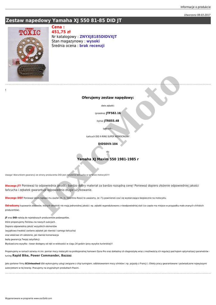 Informacje o produkcie Utworzono 08-03-2017 Zestaw napedowy Yamaha XJ 550 81-85 DID JT Cena : 451,75 zł ot o Nr katalogowy : ZNYXJ8185DIDVXJT Stan magazynowy : wysoki Średnia ocena : brak recenzji ! Oferujemy zestaw napędowy: dwie zębatki: (przednia) JTR855.48 M (tylna) JTF582.16 Łańcuch : Łańcuch DID X-RING SUPER WZMOCNIONY DID50VX-104 c do: xi Yamaha XJ Maxim 550 1981-1985 r Uwaga! Warunkiem gwarancji ze strony producenta DID jest założenie łańcucha w serwisie motocykli!!! Dlaczego JT? Ponieważ to odpowiednia jakość - bardzo dobry materiał za bardzo rozsądną cenę! Ponieważ dopiero złożenie odpowiedniej jakości To łańcucha i zębatek gwarantuje odpowiednio długie użytkowanie. Dlaczego DID? Ponieważ skoro najlepsi mu zaufali (m. in. Valentino Rossi) to uważamy, że i Ty powinieneś czuć się wystarczająco bezpiecznie na motocyklu. Odradzamy kupowanie zestawów, których składniki nie mają jednorodnej jakości: np. zębatki wyprodukowane z nieodpowiedniej stali (co często ma miejsce w przypadku mało znanych chińskich producentów). JT oraz DID należą do największych producentów podzespołów, które proponujemy Państwu na naszych aukcjach. Dopiero odpowiednia jakość wszystkich elementów (wyjątkowa trwałość zarówno zębatek jak również i samego łańcucha) oraz właściwe ich założenie, jak również konserwacja będą gwarancją Twojej satysfakcji. Błyskawiczna wysyłka - towar dostępny od ręki w wiekszości w ciagu 24 godzin (przy wysyłce kurierskiej)!! Proponujemy w ramach serwisu m.inn. pomiar mocy motocykli na profesjonalnej hamowni Dyna Pro oraz dokładną ich diagnostykę wraz z możliwością ich regulacji pod kątem optymalizacji parametrów tuning Rapid Bike, Power Commander, Bazzaz. Jako partener firmy ECUnleashed USA wykonujemy usługi związane z chip tuningiem, odblokowaniem mocy silników ( np. pojazdy z Francji ). Efekty pracy gwarantowane i poświadczone najwyższymi autorytetami w tej branży. Pracujemy na oryginalnym produktach Piasini. Wygenerowano w programie www.oscGold.com