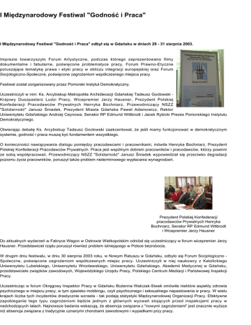 I Międzynarodowy Festiwal "Godność i Praca" I Międzynarodowy Festiwal "Godność i Praca" odbył się w Gdańsku w dniach 29 - 31 sierpnia 2003. Imprezie towarzyszyło Forum Artystyczne, podczas którego zaprezentowano filmy dokumentalne i fabularne, poświęcone problematyce pracy, Forum Prawno-Etyczne poruszające tematykę prawa i etyki pracy w obliczu integracji europejskiej oraz Forum Socjologiczno-Społeczne, poświęcone zagrożeniom współczesnego miejsca pracy. Festiwal został zorganizowany przez Pomorski Instytut Demokratyczny. Uczestniczyli w nim: Ks. Arcybiskup Metropolita Archidiecezji Gdańskiej Tadeusz Gocłowski Krajowy Duszpasterz Ludzi Pracy, Wicepremier Jerzy Hausner, Prezydent Polskiej Konfederacji Pracodawców Prywatnych Henryka Bochniarz, Przewodniczący NSZZ "Solidarność" Janusz Śniadek, Prezydent Miasta Gdańska Paweł Adamowicz, Rektor Uniwersytetu Gdańskiego Andrzej Ceynowa, Senator RP Edmund Wittbrodt i Jacek Rybicki Prezes Pomorskiego Instytutu Demokratycznego. Otwierając debatę Ks. Arcybiskup Tadeusz Gocłowski zaakcentował, że jeśli mamy funkcjonować w demokratycznym systemie, godność i praca muszą być fundamentem wszystkiego. O konieczności nawiązywania dialogu pomiędzy pracodawcami i pracownikami, mówiła Henryka Bochniarz, Prezydent Polskiej Konfederacji Pracodawców Prywatnych. Praca jest wspólnym dobrem pracowników i pracodawców, którzy powinni ze sobą współpracować. Przewodniczący NSZZ "Solidarność" Janusz Śniadek wypowiedział się przeciwko degradacji poziomu życia pracowników, poruszył także problem nieterminowego wypłacania wynagrodzeń. Prezydent Polskiej Konfederacji pracodawców Prywatnych Henryka Bochniarz, Senator RP Edmund Wttbrodt i Wicepremier Jerzy Hausner Do aktualnych wydarzeń w Fabryce Wagon w Ostrowie Wielkopolskim odniósł się uczestniczący w forum wicepremier Jerzy Hausner. Przedstawiciel rządu poruszył również problem istniejącego w Polsce bezrobocia. W drugim dniu festiwalu, w dniu 30 sierpnia 2003 roku, w Nowym Ratuszu w Gdańsku, odbyło się Forum Socjologiczno Społeczne, poświęcone zagrożeniom współczesnych miejsc pracy. Uczestniczyli w niej naukowcy z Katolickiego Uniwersytetu Lubelskiego, Uniwersytetu Wrocławskiego, Uniwersytetu Gdańskiego, Akademii Medycznej w Gdańsku, przedstawiciele związków zawodowych, Wojewódzkiego Urzędu Pracy, Polskiego Centrum Mediacji i Państwowej Inspekcji Pracy. Uczestnicząc w forum Okręgowy Inspektor Pracy w Gdańsku Bożenna Walczak-Siwek omówiła niektóre aspekty zdrowia psychicznego w miejscu pracy, w tym zjawisko mobbingu, czyli psychicznego i seksualnego napastowania w pracy. W wielu krajach liczba tych incydentów drastycznie wzrasta - tak podają statystyki Międzynarodowej Organizacji Pracy. Efektywne zapobieganie tego typu zagrożeniom będzie jednym z głównych wyzwań stojących przed inspekcjami pracy w nadchodzących latach. Najnowsze badania wskazują, że absencja związana z "nowymi zagrożeniami" jest znacznie wyższa niż absencja związana z tradycyjnie uznanymi chorobami zawodowymi i wypadkami przy pracy. W roku 2002 w Okręgowym Inspektoracie Pracy w Gdańsku odnotowano 102 porady i 17 skarg pisemnych dotyczących mobbingu. Ze względu na coraz częstsze opisywanie przez polskich pracowników tego zjawiska, zdaniem Okręgowego Inspektora Pracy w Gdańsku Bożenny Walczak-Siwek występuje pilna konieczność prawnego uregulowania tego zjawiska i zapisania jego konsekwencji prawnych. Wówczas inspektorzy pracy będą mogli skutecznie przeciwdziałać tym zagrożeniom. Opracownie: Magdalena Galon OIP Gdańsk