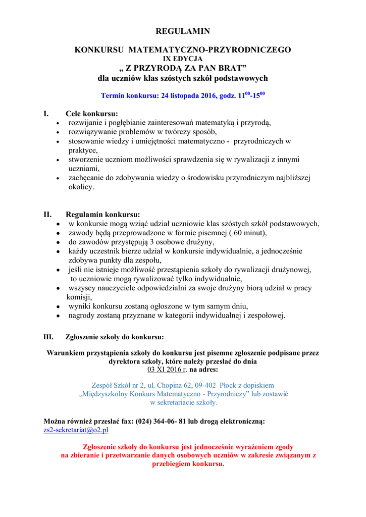 REGULAMIN KONKURSU MATEMATYCZNO-PRZYRODNICZEGO IX EDYCJA „ Z PRZYRODĄ ZA PAN BRAT” dla uczniów klas szóstych szkół podstawowych Termin konkursu: 24 listopada 2016, godz. 1100-1500 I. II. III. Cele konkursu: rozwijanie i pogłębianie zainteresowań matematyką i przyrodą, rozwiązywanie problemów w twórczy sposób, stosowanie wiedzy i umiejętności matematyczno - przyrodniczych w praktyce, stworzenie uczniom możliwości sprawdzenia się w rywalizacji z innymi uczniami, zachęcanie do zdobywania wiedzy o środowisku przyrodniczym najbliższej okolicy. Regulamin konkursu: w konkursie mogą wziąć udział uczniowie klas szóstych szkół podstawowych, zawody będą przeprowadzone w formie pisemnej ( 60 minut), do zawodów przystępują 3 osobowe drużyny, każdy uczestnik bierze udział w konkursie indywidualnie, a jednocześnie zdobywa punkty dla zespołu, jeśli nie istnieje możliwość przestąpienia szkoły do rywalizacji drużynowej, to uczniowie mogą rywalizować tylko indywidualnie, wszyscy nauczyciele odpowiedzialni za swoje drużyny biorą udział w pracy komisji, wyniki konkursu zostaną ogłoszone w tym samym dniu, nagrody zostaną przyznane w kategorii indywidualnej i zespołowej. Zgłoszenie szkoły do konkursu: Warunkiem przystąpienia szkoły do konkursu jest pisemne zgłoszenie podpisane przez dyrektora szkoły, które należy przesłać do dnia 03 XI 2016 r. na adres: Zespół Szkół nr 2, ul. Chopina 62, 09-402 Płock z dopiskiem „Międzyszkolny Konkurs Matematyczno - Przyrodniczy” lub zostawić w sekretariacie szkoły. Można również przesłać fax: (024) 364-06- 81 lub drogą elektroniczną: [email protected] Zgłoszenie szkoły do konkursu jest jednocześnie wyrażeniem zgody na zbieranie i przetwarzanie danych osobowych uczniów w zakresie związanym z przebiegiem konkursu. Zakres wiedzy i umiejętności wymaganych w konkursie: IV. z matematyki Działania na ułamkach zwykłych i dziesiętnych (bez procentów), potęgowanie. Działania na liczbach całkowitych Pola i objętości graniastosłupów. Pola figur płaskich. Odczytywanie tabel, diagramów, wykresów. Jednostki długości, wagi, objętości i ich zamiana. Stosowanie symboli do opisywania sytuacji. Skala. Stosowanie zintegrowanej wiedzy i umiejętności matematycznych do rozwiązywania problemów praktycznych. z przyrody 1. Mapa Polski – krainy geograficzne, rzeki i jeziora. 2. Oświetlenie Ziemi w pierwsze dni kalendarzowych pór roku. 3. Skład, właściwości i zanieczyszczenia powietrza - interpretacja wyników doświadczeń. 4. Rozmnażanie i rozwój człowieka. 5. Pomniki przyrody w Płocku.