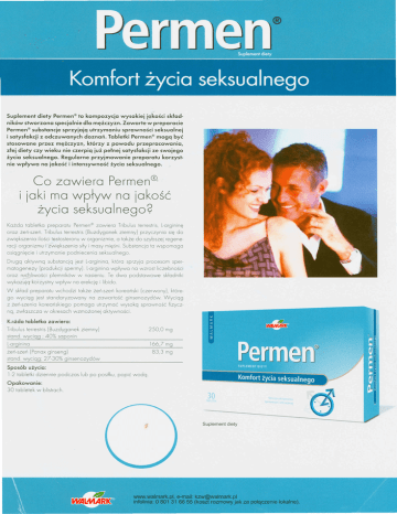 Suplement diety Permen@ to kompozycja ników stworzona specjalnie dla mężczyzn. Permen@ substancje sprzyjają i satysfakcji z odczuwanych stosowane utrzymaniu wysokiej jakości skład- Zawarte w preparacie sprawności seksualnej doznań. Tabletki Permen@ mogą być przez mężczyzn, którzy z powodu przepracowania, złej diety czy wieku nie czerpią już pełnej satysfakcji ze swojego życia seksualnego. nie wpływa Regularne przyjmowanie na jakość i intensywność preparatu korzyst- życia seksualnego. Co zawiera Permen®' jaki ma wpływ na jakość życia seksualnego? Każda tabletka preparatu Permen@zawiera Tribulus terrestris, L-argininę oraz żeń-szeń. Tribulus terrestris (Buzdyganek ziemny) przyczynia się do zwiększenia ilości testosteronu warganizmie, a także do szybszej regene- racp organizmu i zwiększenia siły i masy mięśni. Substancja ta wspomaga osiągnięcie i utrzymanie podniecenia seksualnego. Drugą aktywną substancją jest L-arginina, która sprzyja procesom spermatogenezy (produkCji spermy) L-arginina wpływa na wzrost liczebności oraz ruchliwości plemników w nasieniu. Te dwa podstawowe składniki wykazują korzystny wpływ no erekcję i libido. W skład preparatu wchodzi także żeń-szeń koreański (czerwony), którego wyciąg jest standaryzowony no zowartość z żeń-szenia koreońskiego pomogo ginsenozydów. Wyciąg utrzymoć wysoką sprawność fizycz- ną, zwłoszcza w okresach wzmożonej oktywności. K,]żda tabletka zawiera: Tribulus terrestris (Buzdyganek ziemny) stand. wyciąg; 40% saponin 166,7 mg L-arginino 83,3 mg żeń-szeń (Panax ginseng) stand. wyciąg; 27-30% ginsenozydów Sposób użycia: 1-2 tabletki dziennie podczas lub po posiłku, popić wodą. Opakowanie: Komfort życia seksualnego 30 tobietek w blistroch. wwwwalmark.pl, e-mail: [email protected] infoIinia. 0801 31 66 55 (koszt rozmowy jak za poIączenie lokalne).