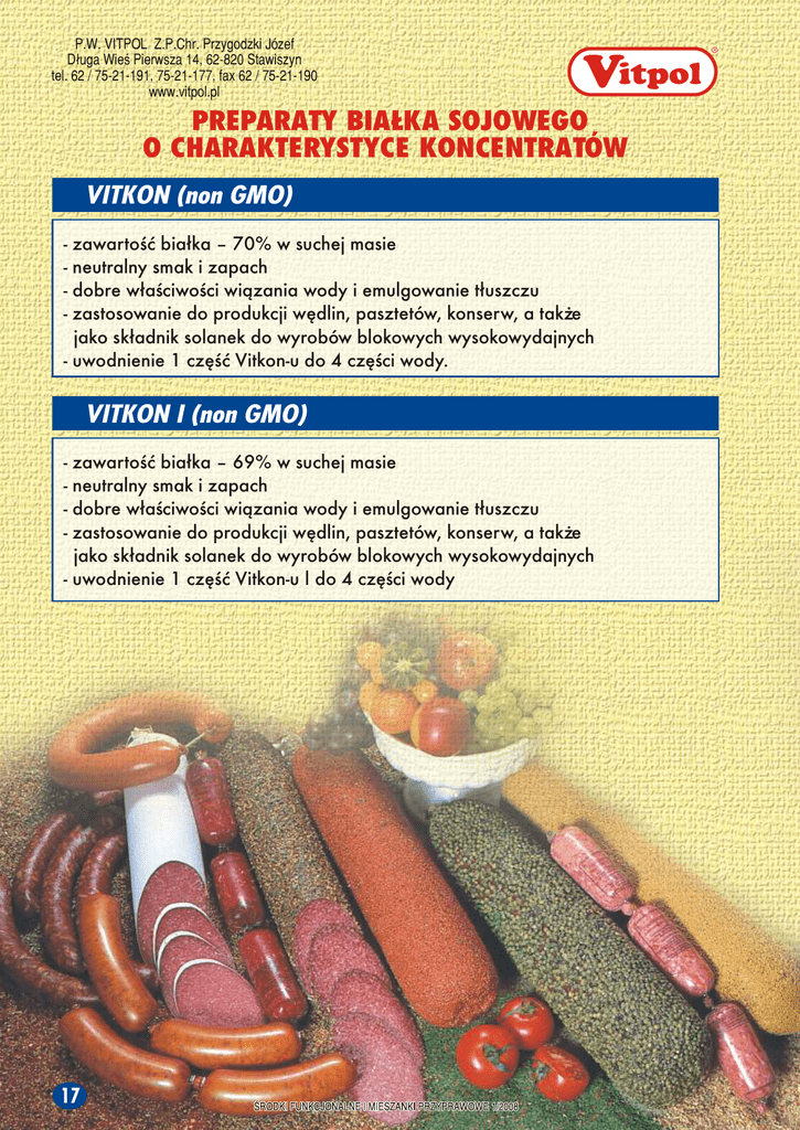 P.W. VITPOL Z.P.Chr. Przygodzki Józef D³uga Wieœ Pierwsza 14, 62-820 Stawiszyn tel. 62 / 75-21-191, 75-21-177, fax 62 / 75-21-190 www.vitpol.pl PREPARATY BIAŁKA SOJOWEGO O CHARAKTERYSTYCE KONCENTRATÓW VITKON (non GMO) - zawartoœæ bia³ka – 70% w suchej masie - neutralny smak i zapach - dobre w³aœciwoœci wi¹zania wody i emulgowanie t³uszczu - zastosowanie do produkcji wêdlin, pasztetów, konserw, a tak¿e jako sk³adnik solanek do wyrobów blokowych wysokowydajnych - uwodnienie 1 czêœæ Vitkon-u do 4 czêœci wody. VITKON I (non GMO) - zawartoœæ bia³ka – 69% w suchej masie - neutralny smak i zapach - dobre w³aœciwoœci wi¹zania wody i emulgowanie t³uszczu - zastosowanie do produkcji wêdlin, pasztetów, konserw, a tak¿e jako sk³adnik solanek do wyrobów blokowych wysokowydajnych - uwodnienie 1 czêœæ Vitkon-u I do 4 czêœci wody 17