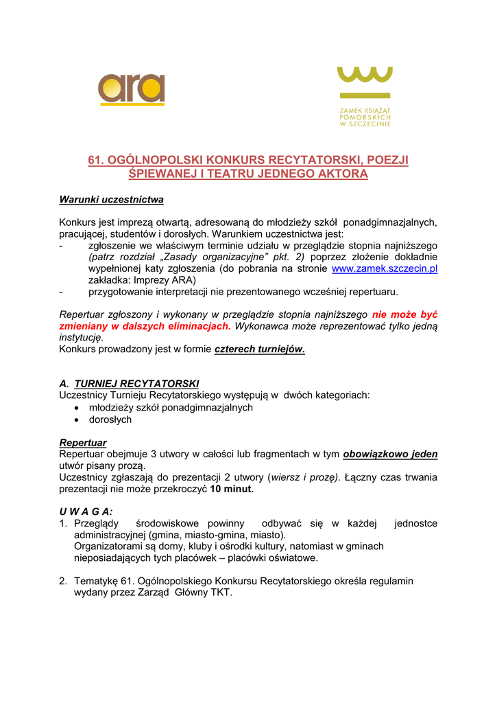 61. OGÓLNOPOLSKI KONKURS RECYTATORSKI, POEZJI ŚPIEWANEJ I TEATRU JEDNEGO AKTORA Warunki uczestnictwa Konkurs jest imprezą otwartą, adresowaną do młodzieży szkół ponadgimnazjalnych, pracującej, studentów i dorosłych. Warunkiem uczestnictwa jest: zgłoszenie we właściwym terminie udziału w przeglądzie stopnia najniższego (patrz rozdział „Zasady organizacyjne” pkt. 2) poprzez złożenie dokładnie wypełnionej katy zgłoszenia (do pobrania na stronie www.zamek.szczecin.pl zakładka: Imprezy ARA) przygotowanie interpretacji nie prezentowanego wcześniej repertuaru. Repertuar zgłoszony i wykonany w przeglądzie stopnia najniższego nie może być zmieniany w dalszych eliminacjach. Wykonawca może reprezentować tylko jedną instytucję. Konkurs prowadzony jest w formie czterech turniejów. A. TURNIEJ RECYTATORSKI Uczestnicy Turnieju Recytatorskiego występują w dwóch kategoriach: młodzieży szkół ponadgimnazjalnych dorosłych Repertuar Repertuar obejmuje 3 utwory w całości lub fragmentach w tym obowiązkowo jeden utwór pisany prozą. Uczestnicy zgłaszają do prezentacji 2 utwory (wiersz i prozę). Łączny czas trwania prezentacji nie może przekroczyć 10 minut. U W A G A: 1. Przeglądy środowiskowe powinny odbywać się w każdej administracyjnej (gmina, miasto-gmina, miasto). Organizatorami są domy, kluby i ośrodki kultury, natomiast w gminach nieposiadających tych placówek – placówki oświatowe. jednostce 2. Tematykę 61. Ogólnopolskiego Konkursu Recytatorskiego określa regulamin wydany przez Zarząd Główny TKT. B. TURNIEJ POEZJI ŚPIEWANEJ 1. Uczestnicy występują bez podziału na kategorie. 2. Wykonawca jest solistą. 3. Repertuar obejmuje: - 3 utwory śpiewane - 1 utwór recytowany. 4. W odniesieniu do repertuaru śpiewanego obowiązują następujące zasady: - wykonywane mogą być wiersze, które zostały opublikowane w książkach lub w prasie literackiej; nie może to być znany tekst ze znaną muzyką, tzw. standard gatunku - uczestnicy mogą wykonać trzeci utwór z tekstem własnym. 5. Do prezentacji uczestnik zgłasza 2 utwory śpiewane, 1 recytowany i ewentualnie trzeci z tekstem własnym. (Do przeglądów wojewódzkich włącznie prezentacja utworu recytowanego jest obowiązkowa). Łączny czas ich wykonania nie może przekroczyć 10 minut. 6. Do akompaniamentu może być stosowany 1 instrument, mały zespół muzyczny (do 3 osób), bądź wcześniej dokonane nagranie (półplayback). 7. Prezentowanie utworu znanego i posiadającego określony kształt wykonawczy dopuszcza się tylko wówczas, gdy uczestnik opracował nową własną interpretację. C. TURNIEJ TEATRÓW JEDNEGO AKTORA - uczestnicy turnieju występują bez podziału na kategorie. - uczestnicy przygotowują spektakl w oparciu o dowolny materiał literacki. Turniej Teatrów Jednego Aktora jest przeglądem dorobku i osiągnięć wykonawców poszukujących indywidualnych form wypowiedzi artystycznej, będących wyrazem osobistego zaangażowania w istotne problemy współczesności, kontynuowaniem sztuki narodowej, ludowej i regionalnej – łącznie ze zwyczajami, obrzędami, podaniami, klechdami – zawierającymi elementy teatru. Czas trwania spektaklu nie może przekroczyć 30 minut. D. WYWIEDZIONE ZE SŁOWA Zasady: 1. Uczestnicy występują bez podziału na kategorie. 2. Repertuar jest dowolny (np. wiersz lub jego fragment, monolog literacki, collage tekstów). 3. Dowolna forma prezentacji (np. teatr jednego wiersza, łączenie słowa mówionego ze śpiewem, dźwiękiem, ruchem, rekwizytem). Czas występu nie może przekroczyć 7 minut. U W A G A: Przekroczenie limitu czasu przez wykonawcę w poszczególnych turniejach może spowodować pominięcie go w ocenie przez Sąd Konkursowy. Do przeglądu finałowego (wojewódzkiego) jury kwalifikuje: 2 uczestników z Turnieju Recytatorskiego, 2 z Poezji Śpiewanej, 1 z Teatru Jednego Aktora i 1 z Turnieju Wywiedzione ze Słowa. Komisja wojewódzka kwalifikuje do dalszych etapów Konkursu laureatów poszczególnych Turniejów w liczbie określonej przez ZG TKT regulaminem. Kryteria oceny: 1. Sądy Konkursowe dokonują oceny wg następujących kryteriów: * dobór repertuaru (wartości artystyczne utworów oraz ich dobór do możliwości wykonawczych uczestnika), * interpretacja utworów, * kultura słowa, * ogólny wyraz artystyczny. W Turnieju Wywiedzione ze słowa Sądy Konkursowe uwzględniają ponadto: * celowość użycia środków pozasłownych (np. kostiumu, dźwięku, elementów scenografii i innych) wspomagających interpretację, * kompozycję sceniczną występu. W Turnieju Teatrów Jednego Aktora Sądy Konkursowe uwzględniają również: * opracowanie dramaturgiczne, * opracowanie reżyserskie, * realizację programu (scenografia, muzyka, kompozycja gestu i ruchu scenicznego). W Turnieju Poezji Śpiewanej Sądy Konkursowe uwzględniają także: * zgodność muzyki z charakterem wiersza, * muzykalność i warunki głosowe wykonawcy, * wartości artystyczne muzyki. 2. Podstawą do sformułowania werdyktu jest wysłuchanie przez każdego członka Sądu Konkursowego – wszystkich uczestników przeglądu. 3. Ostateczny werdykt jest ustalany w drodze wspólnej dyskusji Sądu Konkursowego. W przypadku równego podziału głosów, rozstrzyga głos przewodniczącego. 4. Decyzja Sądu jest ostateczna! 5. Sąd Konkursowy ma obowiązek uzasadnienia werdyktu ogólnego. 6. Uczestnicy mają prawo do zwracania się do Sądu Konkursowego o uzasadnienie oceny swojej prezentacji – w dniach trwania przeglądu. Terminy i miejsce eliminacji - powiatowe – wg terminarza miejskie – 05.03.2016r. – Zamek Książąt Pomorskich w Szczecinie wojewódzkie – 23-24.04.2016r. – Zamek Książąt Pomorskich w Szczecinie Finały Ogólnopolskie: - Turniej Recytatorski i Wywiedzione ze Słowa – Ostrołęka – 17-20.06.2015 r. - Teatr Jednego Aktora – Słupsk – 04-06.06.2015 r. - Poezja Śpiewana – Włocławek – 10-13.06.2015 r. 