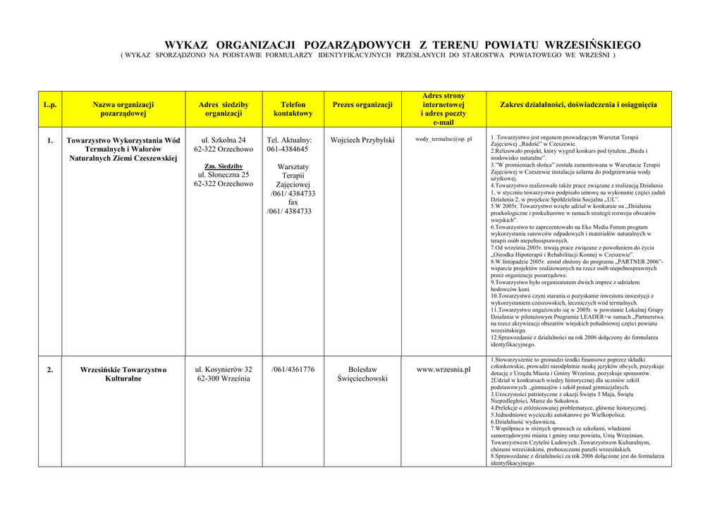 WYKAZ ORGANIZACJI POZARZĄDOWYCH Z TERENU POWIATU WRZESIŃSKIEGO ( WYKAZ SPORZĄDZONO NA PODSTAWIE FORMULARZY IDENTYFIKACYJNYCH PRZESŁANYCH DO STAROSTWA POWIATOWEGO WE WRZEŚNI ) L.p. Nazwa organizacji pozarządowej Adres siedziby organizacji 1. Towarzystwo Wykorzystania Wód Termalnych i Walorów Naturalnych Ziemi Czeszewskiej Prezes organizacji ul. Szkolna 24 62-322 Orzechowo Tel. Aktualny: 061-4384645 Wojciech Przybylski wody_termalne@op. pl Zm. Siedziby Warsztaty Terapii Zajęciowej /061/ 4384733 fax /061/ 4384733 Bolesław Święciechowski www.wrzesnia.pl ul. Słoneczna 25 62-322 Orzechowo 2. Wrzesińskie Towarzystwo Kulturalne Adres strony internetowej i adres poczty e-mail Telefon kontaktowy ul. Kosynierów 32 62-300 Września /061/4361776 Zakres działalności, doświadczenia i osiągnięcia 1. Towarzystwo jest organem prowadzącym Warsztat Terapii Zajęciowej „Radość” w Czeszewie. 2.Relizowało projekt, który wygrał konkurs pod tytułem „Bieda i środowisko naturalne”. 3.”W promieniach słońca” została zamontowana w Warsztacie Terapii Zajęciowej w Czeszewie instalacja solarna do podgrzewania wody użytkowej. 4.Towarzystwo realizowało także prace związane z realizacją Działania 1, w styczniu towarzystwo podpisało umowę na wykonanie części zadań Działania 2, w projekcie Spółdzielnia Socjalna „UL”. 5.W 2005r. Towarzystwo wzięło udział w konkursie na „Działania proekologiczne i prokulturowe w ramach strategii rozwoju obszarów wiejskich”. 6.Towarzystwo to zaprezentowało na Eko Media Forum program wykorzystania surowców odpadowych i materiałów naturalnych w terapii osób niepełnosprawnych. 7.Od września 2005r. trwają prace związane z powołaniem do życia „Ośrodka Hipoterapii i Rehabilitacji Konnej w Czeszewie”. 8.W listopadzie 2005r. został złożony do programu „PARTNER 2006”wsparcie projektów realizowanych na rzecz osób niepełnosprawnych przez organizacje pozarządowe. 9.Towarzystwo było organizatorem dwóch imprez z udziałem hodowców koni. 10.Towarzystwo czyni starania o pozyskanie inwestora inwestycji z wykorzystaniem czeszowskich, leczniczych wód termalnych. 11.Towarzystwo angażowało się w 2005r. w powstanie Lokalnej Grupy Działania w pilotażowym Programie LEADER+w ramach „Partnerstwa na rzecz aktywizacji obszarów wiejskich południowej części powiatu wrzesińskiego. 12.Sprawozdanie z działalności na rok 2006 dołączony do formularza identyfikacyjnego. 1.Stowarzyszenie to gromadzi środki finansowe poprzez składki członkowskie, prowadzi nieodpłatnie naukę języków obcych, pozyskuje dotację z Urzędu Miasta i Gminy Września, pozyskuje sponsorów. 2Udział w konkursach wiedzy historycznej dla uczniów szkół podstawowych .,gimnazjów i szkół ponad gimnazjalnych. 3.Uroczystości patriotyczne z okazji Święta 3 Maja, Święta Niepodległości, Marsz do Sokołowa. 4.Prelekcje o zróżnicowanej problematyce, głównie historycznej. 5.Jednodniowe wycieczki autokarowe po Wielkopolsce. 6.Działalność wydawnicza. 7.Współpraca w różnych sprawach ze szkołami, władzami samorządowymi miasta i gminy oraz powiatu, Unią Wrześnian, Towarzystwem Czytelni Ludowych ,Towarzystwem Kulturalnym, chórami wrzesińskimi, proboszczami parafii wrzesińskich. 8.Sprawozdanie z działalności za rok 2006 dołączone jest do formularza identyfikacyjnego. 3. Towarzystwo Unia Wrześnian ul. Kościuszki 1 62-300 Września 4. Kurkowe Bractwo Strzeleckie ul. Dzieci Wrzesińskich 13 62-300 Września 0503192250 0605998959 /061/4360181 Wojciech Krzysztofiak 5. Stowarzyszenie Pomocy Dar Serca ul. Reymonta 3 62-306 Kołaczkowo 0601576118 Małgorzata Wolf kolaczkowo.wokiss.pl 6. Wrzesińskie Stowarzyszenie Przedsiębiorców i Kupców ul. Słowackiego 11 62-300 Września Adres do korespondencji ul. Culica 1 62-300 Września /061/4365451 /061/4388504 fax /061/4365451 /061/4388900 Piotr Kryszewski [email protected] 7. Stowarzyszenie Bursy Gimnazjalnej ul. Witkowska 1 62-300 Września /061/4360230 fax /061/3401245 Zenon Suchorski 8. Stowarzyszenie Sołtysów Województwa Wielkopolskiego ul. Wrzesińska 19 62-320 Miłosław /061/4382928 0608868230 /061/4383759 fax /061/4382928 /061/4383051 Franciszek Sztuka 9. Stowarzyszenie Oświaty Społecznej w Pyzdrach Ruda Komorska 1 62-310 Pyzdry /063/2768265 fax /063/2768265 Józef Klupa Waldemar Grześkowiak [email protected] 1.Rajd turystyczno-krajoznawczy po Ziemi Wrzesińskiej. 2.Współorganizacja uroczystości 3 Maja. 3.Współorganizacja marszu pod Sokołowem 4.Współorganizacja uroczystości Święta Niepodległości. 1.Celem Kurkowego Bractwa Strzeleckiego jest ćwiczenie członków i sympatyków Bractwa w strzelaniu z broni palnej oraz pielęgnowaniu między innymi świadomości i poczucia obowiązków obywatelskich i państwowych względem RP oraz krzewienie towarzyskości i podtrzymywanie wiekowej tradycji Bractwa. 2.Bractwo organizuje kilka strzelań do tarcz drewnianych specjalnie przygotowanych. 3.Działalność za 2006 r. dołączona jest do formularza identyfikacyjnego. 1.Celem działalności jest organizowanie pomocy, doradztwo i pomoc w załatwianiu spraw osobistych w instytucjach, urzędach, organizowanie różnego rodzaju form wypoczynku i imprez integracyjnych włączanie osób niepełnosprawnych do uczestnictwa w życiu społecznym środowiska poprzez organizowanie wystaw prac plastycznych członków. 1.Spotkania w celu aktywizacji gospodarczej na terenie miasta i gminy Września. 2.Kontakty z inwestorami i przedsiębiorcami innych gmin. 3.Współpraca z władzami samorządowymi w celu uzyskania bieżących informacji na tematy inwestycyjne, gospodarcze i prawne. 4. Spotkania integracyjne w gronie przedsiębiorców i ich rodzin. 1.Zarządza majątkiem prowadząc działalność gospodarczą polegającą na usługach wynajmowania lub dzierżawy nieruchomości o charakterze niemieszkalnym. 2.Przeprowadza remonty i naprawy bieżące bursy. 3.Udziela wszechstronne