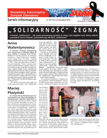 Serwis Informacyjny nr 18 (172) 27 kwietnia 2010 Dział Informacji KK [email protected] nosc.org.pl 80-855 Gdańsk, ul. Wały Piastowskie 24 „SOLIDARNOŚĆ” ŻEGNA 21 kwietnia w kościele Najświętszego Serca Jezusowego w Gdańsku odbyła się msza żałobna w intencji Anny Wantynowicz. W kościele pojawiły się delegacje związkowe i około 50 pocztów sztandarowych z całego kraju. Na czele – sztandar Międzyzakładowego Komitetu Strajkowego z 1980 r., który powstał podczas strajku w Stoczni Gdańskiej. Wartę honorową przy trumnie pełnili żołnierze i górnicy. Mszy św. przewodniczył abp Leszek Sławoj Głódź. Kazanie wygłosił ksiądz biskup archidiecezji gdańskiej Ryszard Kasyna, który powiedział: „To była kobieta nieugięta, dobry człowiek. Przepełniona pasją walki o sprawiedliwość i człowieczeństwo. I nigdy przeciwko komuś. Nie znała słowa donos, intryga, pogarda. Ideałów ‚Solidarności’ broniła na każdym etapie swojego życia”. – W swoim uczciwym życiu nigdy nie oczekiwałaś zaszczytów, choć zasługiwałaś Maciej Płażyński 21 kwietnia Maciej Płażyński, pierwszy niekomunistyczny wojewoda gdański, został pochowany w Bazylice Mariackiej. Na jego pogrzebie pojawiły się tłumy. Żegnali go m.in. premier, marszałkowie sejmu i senatu, ministrowie, parlamentarzyści, związkowcy z pocztami sztandarowymi, działacze samorządowi, przedsiębiorcy i ludzie kultury. Przed mszą Maciej Płażyński został pośmiertnie odznaczony Krzyżem Wielkim Orderu Odrodzenia Polski. Abp. Leszek Sławoj Głódź przypomniał życiorys zmarłego, jego działalność w RMP, NSZ, Solidarności oraz szefowanie spółdzielni Świetlik, która w czasach stanu wojennego zatrudniała wielu opozycjonistów.– Byłeś człowiekiem tradycji, wierności temu co polskie – mówił Głodź. O byłym marszałku Sejmu mówili premier Donald Tusk, marszałek Sejmu Bronisław Komorowski, przewodniczący Ja- Serwis Informacyjny nr 18(172) 27 kwietnia 2010 na nie jak mało kto – Pani Aniu, przyszliśmy tu, żeby pokłonić się przed majestatem śmierci, ale także, aby schylić głowy przed majestatem Twojego życia – zwrócił się do zmarłej Janusz Śniadek. Przewodniczący podkreślił, że dopiero „wielki Polak, śp. Lech Kaczyński” docenił w pełni historyczną rolę Anny Walentynowicz, nadając jej najwyższe polskie odznaczenie – Order Orła Białego. – „Solidarność” tworzą dziś ludzie trochę podobni do Ciebie. Dumni i niepokorni, pochyleni nad człowiekiem, broniący skrzywdzonych ludzi pracy. Wspieraj nas tam teraz w górze, abyśmy dalej realizowali ideały „Solidarności”, którym byłaś tak wierna. – mówił Janusz Śniadek. Na cmentarzu Srebrzysko w Gdańsku odbył się pogrzeb. „Matka Solidarności” spoczęła u boku swego męża. Żegnali ją m.in. przyjaciele z Wolnych Związków Zawodowych, nusz Śniadek oraz abp Mieczysław Mokrzycki, metropolita lwowski. Przy dźwiękach Marsza Żałobnego marynarze przenieśli trumnę przez świątynię, po czym została schowana przy sarkofagu z czarnego granitu. – Maciej Płażyński, chociaż nie pełnił żadnej funkcji związkowej, był człowiekiem „Solidarności”. Ilekroć przyjdziemy tutaj modlić się za ojczyznę, za tych, którzy oddali za tę ojczyznę życie – przyjdziemy także do Ciebie. Byłeś mężem stanu, jakich Polska bardzo politycy, parlamentarzyści i stoczniowcy w charakterystycznych białych i niebieskich kaskach, górnicy. Po salwie honorowej, którą oddała kampania honorowa, przemawiali na grobem Andrzej Gwiazda, Krzysztof Wyszkowski, Zbigniew Romaszewski i Jacek Kurski. – Nie wiem, czy Solidarność miałaby tyle zalet, gdyby nie udział Ani – powiedział Gwiazda. FOT. PAWEŁ GLANERT Anna Walentynowicz FOT. PAWEŁ GLANERT – Człowiek „Solidarności” – tak często powtarzamy ostatnio te słowa nad mogiłami tych, którzy odeszli – powiedział Janusz Śniadek, przewodniczący KK NSZZ „Solidarność” potrzebuje. Twoje odejście jest wielką stratą. Z pamięci o Twoim życiu będziemy czerpać siłę. – mówił w Gdańsku Janusz Śniadek, szef „Solidarności”. Krzysztof Putra 20 kwietnia na białostockim cmentarzu św. Rocha spoczęło ciało wicemarszałka Sejmu Krzysztofa Putry. Uroczystości pogrzebowe rozpoczęła Msza św. żałobna w miejscowej katedrze. Przewodniczył jej ks. abp Edward Ozorowski, metropolita białostocki. W uroczystościach pogrzebowych wziął udział Janusz Śniadek, przewodniczący KK NSZZ „S”, Józef Mozolewski, szef Regionu Podlaskiego, przedstawiciele Komisji Zakładowych oraz około 50 pocztów sztandarowych z „Solidarności”. W wygłoszonej homilii biskup łomżyński Stanisław Stefanek podkreślił, że osoby poległe 10 kwietnia są „męczennikami, którzy szli za wołaniem historii, aby tę historię dopełnić”. – Bo ta historia Katynia jest przerwana, zakryta. Pan prezydent Lech Kaczyński i wszyscy inni polecieli razem, aby tę historię dopisać... Polecieli, by złożyć hołd pomordowanym, którym nie urządzano pogrzebów, nie modlono się nad ich mogiłami, gdy padali w piach – podkreślił ks. bp Stefanek. Pasterz Kościoła łomżyńskiego zauważył, że śmierć pasażerów samolotu, który uległ Przemysław Gosiewski – Słyszysz mnie Przemku! Stałeś się męczennikiem! Twoja ofiara nie pójdzie na marne – mówił ksiądz Infułat Józef Wójcik z Suchedniowa na mszy przed pogrzebem posła Przemysława Gosiewskiego 22 kwietnia w kościele pod wezwaniem Wszystkich Świętych w Warszawie. Na pożegnanie świętokrzyskiego posła przyjechali m.in. Maciej Jankowski, wiceprzewodniczący Komisji Krajowej „S”, Andrzej Kropiwnicki, przewodniczący Regionu Mazowsze NSZZ „Solidarność”, Grzegorz Iwanicki, sekretarz Regionu Mazowsze, a Władysław Stasiak Władysław Stasiak, szef Kancelarii Prezydenta, spoczął na warszawskich Powązkach. ą 