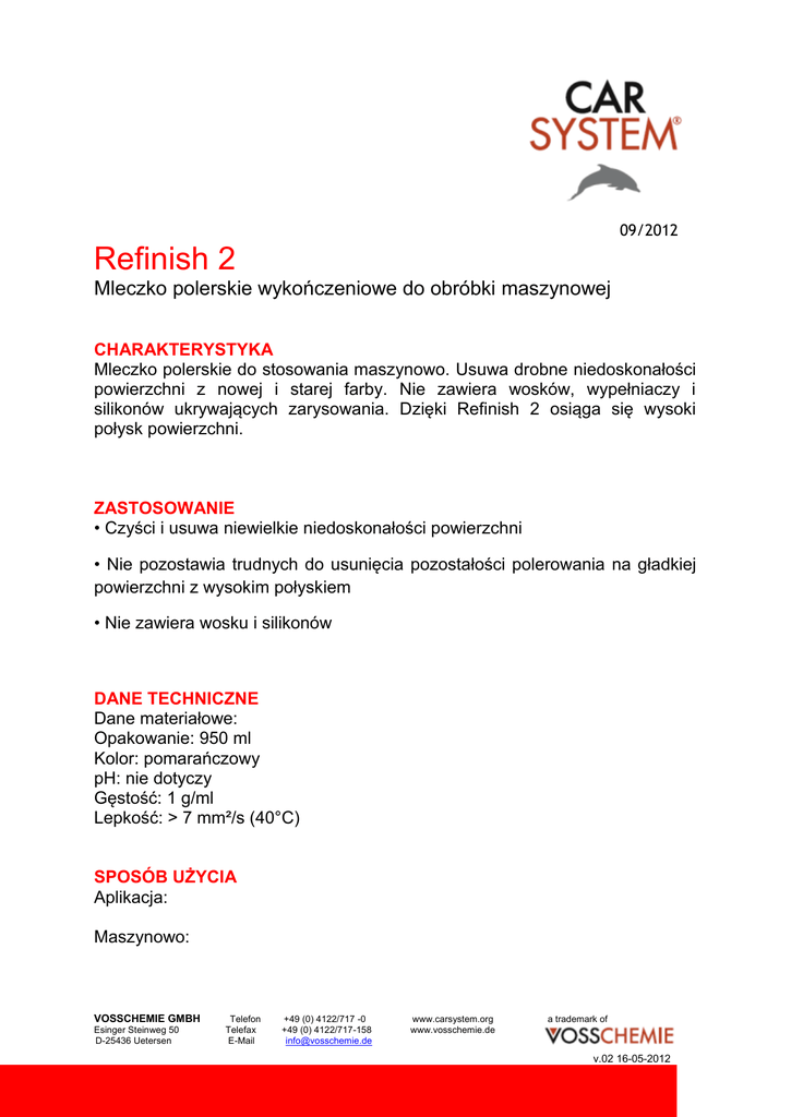 09/2012 Refinish 2 Mleczko polerskie wykończeniowe do obróbki maszynowej CHARAKTERYSTYKA Mleczko polerskie do stosowania maszynowo. Usuwa drobne niedoskonałości powierzchni z nowej i starej farby. Nie zawiera wosków, wypełniaczy i silikonów ukrywających zarysowania. Dzięki Refinish 2 osiąga się wysoki połysk powierzchni. ZASTOSOWANIE • Czyści i usuwa niewielkie niedoskonałości powierzchni • Nie pozostawia trudnych do usunięcia pozostałości polerowania na gładkiej powierzchni z wysokim połyskiem • Nie zawiera wosku i silikonów DANE TECHNICZNE Dane materiałowe: Opakowanie: 950 ml Kolor: pomarańczowy pH: nie dotyczy Gęstość: 1 g/ml Lepkość: > 7 mm²/s (40°C) SPOSÓB UŻYCIA Aplikacja: Maszynowo: VOSSCHEMIE GMBH Esinger Steinweg 50 D-25436 Uetersen Telefon Telefax E-Mail +49 (0) 4122/717 -0 +49 (0) 4122/717-158 [email protected] www.carsystem.org www.vosschemie.de a trademark of v.02 16-05-2012 09/2012 Ustaw prędkość maszyny na 1500 - 2400 obrotów na minutę i użyj bardzo miękkiej gąbki polerskiej (CS Finish Foam biała lub CS Finish Back Pad). Nanieś mleczko Refinish 1 na polerowaną powierzchnię i za pomocą gąbki polerskiej rozprowadź pozostawiając cienką warstwę. Poleruj powierzchnię na wysoki połysk stopniowo zmniejszając nacisk na powierzchnię. Kontynuuj polerowanie powierzchni bez naciskania na nią do czasu aż powierzchnia będzie całkowicie wypolerowana. Użyj ściereczki pyłochłonnej do usunięcia pozostałości pasty. Aby uzyskać lepsze rezultaty: Ustaw prędkość maszyny na ok. 1800 obrotów na minutę i użyj gąbki polerskiej. Ważne: Gąbka polerska powinna być czysta w celu uniknięcia smug. Przed rozpoczęciem polerowania dokładnie umyj samochód, upewniając się że nie ma żadnego kurzu lub pozostałości pasty ściernej. Używaj pasty oszczędnie – nie nakładaj za dużo! Jeśli farba jest miękka i delikatna, albo powierzchnia przegrzewa się nadmiernie podczas polerowania, możesz nanieść mgłę wody na powierzchnię. Pomoże to ograniczyć tarcie, szczególnie gdy gąbka jest nowa. Jednak nie używaj więcej wody niż jest to konieczne. Nie dodawaj wody, gdy gąbka jest nią przesiąknięta. INFORMACJE UZUPEŁNIAJĄCE Wyżej wymienione dane techniczne i informacje, szczególnie zalecenia dotyczące zastosowania i aplikacji naszych produktów oparte są na naszej aktualnej wiedzy przy zastosowaniu produktu w warunkach normalnych. W praktyce, materiały, podłoże i warunki zewnętrzne są tak różne, dlatego niema gwarancji odnośnie osiągniętych rezultatów pracy. Użytkownik jest zobowiązany sprawdzić dopuszczalność rozwiązań w określonych warunkach. Powyższe informacje nie mogą stanowić podstawy do roszczeń. Producent ponosi odpowiedzialność z tytułu niepełnych lub też niewłaściwych danych przedstawionych w swoich materiałach informacyjnych wyłącznie w przypadku rażącego zawinienia (działania umyślnego lub rażącego niedbalstwa). W tym przypadku, Użytkownik zobowiązany jest VOSSCHEMIE GMBH Esinger Steinweg 50 D-25436 Uetersen Telefon Telefax E-Mail +49 (0) 4122/717 -0 +49 (0) 4122/717-158 [email protected] www.carsystem.org www.vosschemie.de a trademark of v.02 16-05-2012 09/2012 udokumentować, że poinformował nas pisemnie o wszystkich nieprawidłowościach. Prawo patentowe osób trzecich, warunki sprzedaży i dostawy oraz zalecenia zawarte w kacie technicznej muszą być przestrzegane. Ważne informacje dotyczące bezpieczeństwa oraz wskazówki dotyczące usuwania odpadów znajdują się w karcie charakterystyki. VOSSCHEMIE GMBH Esinger Steinweg 50 D-25436 Uetersen Telefon Telefax E-Mail +49 (0) 4122/717 -0 +49 (0) 4122/717-158 [email protected] www.carsystem.org www.vosschemie.de a trademark of v.02 16-05-2012
