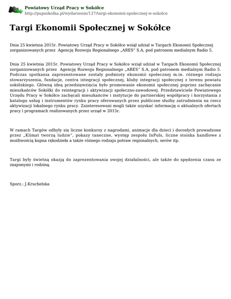 Powiatowy Urząd Pracy w Sokółce http://pupsokolka.pl/wydarzenie/127/targi-ekonomii-spolecznej-w-sokolce Targi Ekonomii Społecznej w Sokółce Dnia 25 kwietnia 2015r. Powiatowy Urząd Pracy w Sokółce wziął udział w Targach Ekonomii Społecznej zorganizowanych przez Agencję Rozwoju Regionalnego „ARES” S.A, pod patronem medialnym Radio 5. Dnia 25 kwietnia 2015r. Powiatowy Urząd Pracy w Sokółce wziął udział w Targach Ekonomii Społecznej zorganizowanych przez Agencję Rozwoju Regionalnego „ARES” S.A, pod patronem medialnym Radio 5. Podczas spotkania zaprezentowane zostały podmioty ekonomii społecznej m.in. różnego rodzaju stowarzyszenia, fundacje, centra integracji społecznej, kluby integracji społecznej z terenu powiatu sokólskiego. Główną ideą przedsięwzięcia było promowanie ekonomii społecznej poprzez zachęcanie mieszkańców Sokółki do reintegracji i aktywizacji społeczno-zawodowej. Przedstawiciele Powiatowego Urzędu Pracy w Sokółce zachęcali mieszkańców i instytucje do partnerskiej współpracy i korzystania z katalogu usług i instrumentów rynku pracy oferowanych przez publiczne służby zatrudnienia na rzecz aktywizacji lokalnego rynku pracy. Zainteresowani mogli także uzyskać informację o aktualnych ofertach pracy i programach realizowanych przez urząd w 2015r. W ramach Targów odbyły się liczne konkursy z nagrodami, animacje dla dzieci i dorosłych prowadzone przez „Klimat tworzą ludzie”, pokazy taneczne, występ zespołu InPuls, liczne stoiska handlowe z możliwością kupna rękodzieła a także różnego rodzaju potraw regionalnych, serów itp. Targi były świetną okazją do zaprezentowania swojej działalności, ale także do spędzenia czasu ze znajomymi i rodziną. Sporz.: J.Kruchelska