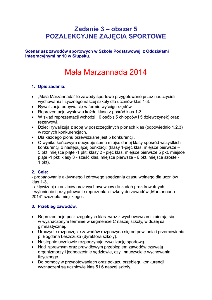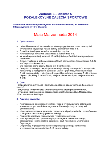 Zadanie 3 – obszar 5 POZALEKCYJNE ZAJĘCIA SPORTOWE Scenariusz zawodów sportowych w Szkole Podstawowej z Oddziałami Integracyjnymi nr 10 w Słupsku. Mała Marzannada 2014 1. Opis zadania. „Mała Marzannada” to zawody sportowe przygotowane przez nauczycieli wychowania fizycznego naszej szkoły dla uczniów klas 1-3. Rywalizacja odbywa się w formie wyścigu rzędów. Reprezentacje wystawia każda klasa z pośród klas 1-3. W skład reprezentacji wchodzi 10 osób ( 5 chłopców i 5 dziewczynek) oraz rezerwowi. Dzieci rywalizują z sobą w poszczególnych pionach klas (odpowiednio 1,2,3) w różnych konkurencjach. Dla każdego pionu przewidziane jest 5 konkurencji. O wyniku końcowym decyduje suma miejsc danej klasy spośród wszystkich konkurencji o następującej punktacji: (klasy 1-pięć klas, miejsce pierwsze – 5 pkt, miejsce piąte -1 pkt; klasy 2 - pięć klas, miejsce pierwsze 5 pkt, miejsce piąte -1 pkt; klasy 3 - sześć klas, miejsce pierwsze - 6 pkt, miejsce szóste 1 pkt). 2. Cele: - propagowanie aktywnego i zdrowego spędzania czasu wolnego dla uczniów klas 1-3, - aktywizacja rodziców oraz wychowawców do zadań prozdrowotnych, - wyłonienie i przygotowanie reprezentacji szkoły do zawodów „Marzannada 2014” szczebla miejskiego . 3. Przebieg zawodów. Reprezentacje poszczególnych klas wraz z wychowawcami zbierają się w wyznaczonym terminie w segmencie C naszej szkoły, w dużej sali gimnastycznej. Uroczyste rozpoczęcie zawodów rozpoczyna się od powitania i przemówienia p. Bogdana Leszczuka (dyrektora szkoły). Następnie uczniowie rozpoczynają rywalizację sportową. Nad sprawnym oraz prawidłowym przebiegiem zawodów czuwają organizatorzy i jednocześnie sędziowie, czyli nauczyciele wychowania fizycznego. Do pomocy w przygotowaniach oraz pokazu przebiegu konkurencji wyznaczeni są uczniowie klas 5 i 6 naszej szkoły. Wykaz konkurencji dla poszczególnych klas: klasy 1: 1) sztafeta- bieg do półmetka i z powrotem z przekazaniem pałeczki sztafetowej 2) „młody hokeista” - slalom z kijem do unihokeja i woreczkiem 3) zamiana piłek - bieg do półmetka z piłką lekarska(1 kg), powrót z piłką do siatkówki 4) przełożenie szarfy- bieg do półmetka z przełożeniem szarfy w połowie dystansu, powrót sprintem 5) „cyferki” - bieg do półmetka, gdzie znajduje się kartka z cyframi od 1-10, powrót sprintem klasy 2: 1) sztafeta - przebieg jak w klasach pierwszych 2) kozłowanie piłki - kozłowanie piłki do koszykówki do półmetka i z powrotem 3) zamiana piłek - bieg do półmetka z piłkami do siatkówki, powrót z piłkami do koszykówki 4) czworakowanie - bieg do półmetka na czworaka, powrót sprintem 5) odkładanie kółka - bieg do półmetka z kółkiem ringo, powrót bez kółka, następna osoba wybiega bez kółka, a przybiega z kółkiem klasy 3: 1) sztafeta- przebieg jak w klasach 1,2 2) „ciężarówka” - przenoszenie piłki lekarskiej (1kg) na brzuchu „raczkiem przodem” do półmetka, powrót sprintem 3) przełożenie dwóch szarf - przełożenie dwóch szarf w drodze do półmetka, powrót sprintem 4) kozłowanie piłki - kozłowanie piłki do siatkówki do półmetka i z powrotem slalomem 5) „literki” - ułożenie hasła „marzannada” z literek, które trzeba przynieść z półmetka Po zakończeniu rywalizacji odbywa się ogłoszenie wyników, uroczyste wręczenie nagród dla uczestników oraz zakończenie i podsumowanie naszych zmagań. 4. Opis przebiegu zawodów. Zawody „Małej Marzannady 2014” odbyły się w naszej szkole w następujących terminach: 1) Klasy 1-13.02 2014 (czwartek) w godz.14.30-15.30. 2) Klasy 2-20.02.2014 (czwartek) w godz.14.30-15.30. 3) Klasy 3-27.02.2014 (czwartek) w godz.14.30-15.30. Wyniki rywalizacji (zwycięzcy): 1) Klasy 1- kl.1E 2) Klasy 2- kl.2B 3) Klasy 3- kl. 3E Opracował i zrealizował: mgr Grzegorz Michoński