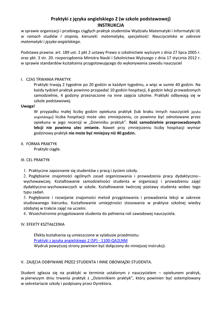 Praktyki z języka angielskiego 2 (w szkole podstawowej) INSTRUKCJA w sprawie organizacji i przebiegu ciągłych praktyk studentów Wydziału Matematyki i Informatyki UŁ w ramach studiów I stopnia, kierunek: matematyka, specjalność: Nauczycielska w zakresie matematyki i języka angielskiego. Podstawa prawna: art. 189 ust. 2 pkt 2 ustawy Prawo o szkolnictwie wyższym z dnia 27 lipca 2005 r. oraz pkt. 3 str. 20. rozporządzenia Ministra Nauki i Szkolnictwa Wyższego z dnia 17 stycznia 2012 r. w sprawie standardów kształcenia przygotowującego do wykonywania zawodu nauczyciel I. CZAS TRWANIA PRAKTYK Praktyki trwają 2 tygodnie po 20 godzin w każdym tygodniu, a więc w sumie 40 godzin. Na każdy tydzień praktyk powinno przypadać 10 godzin hospitacji, 6 godzin lekcji prowadzonych samodzielnie, 4 godziny przeznaczone na inne zajęcia szkolne. Praktyki odbywają się w szkole podstawowej. Uwaga! W przypadku małej liczby godzin opiekuna praktyk (lub braku innych nauczycieli języka angielskiego) liczba hospitacji może ulec zmniejszeniu, co powinno być odnotowane przez opiekuna w jego recenzji w „Dzienniku praktyk”. Ilość samodzielnie przeprowadzonych lekcji nie powinna ulec zmianie. Nawet przy zmniejszeniu liczby hospitacji wymiar godzinowy praktyk nie może być mniejszy niż 40 godzin. II. FORMA PRAKTYK Praktyki ciągłe. III. CEL PRAKTYK 1. Praktyczne zapoznanie się studentów z pracą i życiem szkoły. 2. Pogłębianie znajomości ogólnych zasad organizowania i prowadzenia pracy dydaktyczno-wychowawczej. Kształtowanie samodzielności studenta w organizacji i prowadzeniu zajęć dydaktyczno-wychowawczych w szkole. Kształtowanie twórczej postawy studenta wobec tego typu zadań. 3. Pogłębianie i rozwijanie znajomości metod przygotowania i prowadzenia lekcji w zakresie studiowanego kierunku. Kształtowanie umiejętności stosowania w praktyce szkolnej wiedzy zdobytej w trakcie zajęć na uczelni. 4. Wszechstronne przygotowanie studenta do pełnienia roli zawodowej nauczyciela. IV. EFEKTY KSZTAŁCENIA Efekty kształcenia są umieszczone w sylabusie przedmiotu: Praktyki z języka angielskiego 2 (SP) - 1100-QA2LNM Wydruk powyższej strony powinien być dołączony do niniejszej instrukcji. V. ZAJĘCIA ODBYWANE PRZEZ STUDENTA I INNE OBOWIĄZKI STUDENTA. Student zgłasza się na praktyki w terminie ustalonym z nauczycielem – opiekunem praktyk, w pierwszym dniu trwania praktyk z „Dziennikiem praktyk”, który powinien być ostemplowany w sekretariacie szkoły i podpisany przez Dyrektora. Student powinien zapoznać się z organizacją i funkcjonowaniem szkoły w które odbywa praktyki. W szczególności powinien zapoznać się z przepisami BHP obowiązującymi w szkole, a także ze statutem szkoły oraz szkolnym systemem oceniania. 1. Na początku praktyk student ustala wspólnie z nauczycielem-opiekunem plan praktyk. Plan ten powinien uwzględniać wszystkie formy pracy dydaktyczno-wychowawczej. W szczególności student jest obowiązany do sporządzenia wraz z opiekunem wykazu terminów lekcji prowadzonych przez siebie w ciągu całych praktyk. Powinien on zawierać również daty i godziny rozpoczęcia poszczególnych lekcji. W połowie pierwszego tygodnia praktyk wykaz ten (potwierdzony przez szkołę) student powinien dostarczyć do pokoju A 226 Wydziału Matematyki i Informatyki UŁ przy ul. Banacha 22. Niedostarczenie wykazu w terminie może mieć negatywny wpływ na uzyskanie zaliczenia praktyk. 2. Studenci powinni być dyspozycyjni przez cały dzień (tzn. w godz. 8-15) i przebywać na terenie szkoły co najmniej 4 godziny dziennie. W tym czasie powinni uczestniczyć w zajęciach wymienionych poniżej. W uzasadnionych przypadkach, za zgodą opiekuna praktyk, mogą mieć miejsce pewne odstępstwa od tej reguły. 3. Po zakończeniu praktyk studenci dokonują bilansu godzinowego praktyk na ostatniej stronie „Dziennika praktyk” w formie: Bilans godzinowy praktyk Liczba lekcji przeprowadzonych Liczba lekcji hospitowanych Liczba godzin przeznaczonych na inne zajęcia szkolne Razem Student jest zobowiązany do dostarczenia „Dziennika praktyk” w ciągu 7 dni od chwili zakończenia praktyk do, wyznaczonego przez Dziekana, opiekuna praktyk pedagogicznych. Rodzaje aktywności studenta w czasie trwania praktyk. 1. Hospitowanie lekcji prowadzonych przez nauczyciela-opiekuna praktyk (ewentualnie innych nauczycieli) w zakresie studiowanego przedmiotu. Każda hospitacja winna być odnotowana w „Dzienniku praktyk”. Nauczyciel-opiekun praktyk powinien pokazać studentowi różne typy lekcji i różne metody pracy. 2. Samodzielne prowadzenie lekcji. Praktykant powinien rozpocząć tego typu zajęcia pod koniec pierwszego tygodnia praktyk. Zajęcia te powinny być rozplanowane równomiernie i trwać aż do ostatniego dnia praktyk. Na zakończenie powinno się odbyć podsumowanie praktyk przez nauczyciela-opiekuna i przez studentów, odbywających praktyki na terenie szkoły. Każda samodzielnie przeprowadzona lekcja powinna być odnotowana w „Dzienniku praktyk”. Do każdej samodzielnie przeprowadzonej lekcji student przygotowuje w porozumieniu z nauczycielem-opiekunem odpowiedni konspekt. Konspekt winien zawierać: - temat lekcji, - cele lekcji, - metody nauczania stosowane na lekcji, - formy pracy stosowane na lekcji, - środki dydaktyczne, - przebieg lekcji. Niedopuszczalne jest prowadzenie lekcji bez konspektu. Wykrycie tego rodzaju nieprawidłowości przez osobę hospitującą lekcję z ramienia UŁ może być przyczyną niezaliczenia praktyk. Student jest zobowiązany przechowywać wszystkie konspekty aż do momentu otrzymania zaliczenia praktyk. Każda przeprowadzona lekcja powinna być omówiona przez nauczyciela-opiekuna praktyk. 3. Inne zajęcia szkolne. Poza hospitacjami i prowadzeniem lekcji studenci powinni aktywnie uczestniczyć w „życiu szkoły”, a więc w różnych imprezach szkolnych (konkursach, zabawach, wycieczkach itp.). Mogą także sprawdz