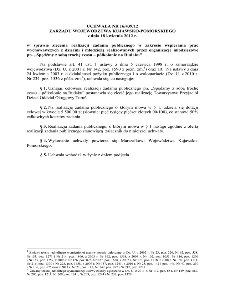 UCHWAŁA NR 16/439/12 ZARZĄDU WOJEWÓDZTWA KUJAWSKO-POMORSKIEGO z dnia 18 kwietnia 2012 r. w sprawie zlecenia realizacji zadania publicznego w zakresie wspierania prac wychowawczych z dziećmi i młodzieŜą realizowanych przez organizacje młodzieŜowe pn. „Spędźmy z sobą trochę czasu – półkolonie na Rudaku” Na podstawie art. 41 ust. 1 ustawy z dnia 5 czerwca 1998 r. o samorządzie województwa (Dz. U. z 2001 r. Nr 142, poz. 1590 z późn. zm.1) oraz art. 19a ustawy z dnia 24 kwietnia 2003 r. o działalności poŜytku publicznego i o wolontariacie (Dz. U. z 2010 r. Nr 234, poz. 1536 z późn. zm.2), uchwala się, co następuje: § 1. Uznając celowość realizacji zadania publicznego pn. „Spędźmy z sobą trochę czasu – półkolonie na Rudaku” postanawia się zlecić jego realizację Towarzystwu Przyjaciół Dzieci Oddział Okręgowy Toruń. § 2. Na realizację zadania publicznego o którym mowa w § 1, udziela się dotacji celowej w kwocie 5 500,00 zł (słownie: pięć tysięcy pięćset złotych 00/100), co stanowi 50% całkowitych kosztów zadania. § 3. Realizacja zadania publicznego, o którym mowa w § 1 nastąpi zgodnie z ofertą realizacji zadania publicznego stanowiącą załącznik do niniejszej uchwały. § 4. Wykonanie uchwały powierza się Marszałkowi Województwa KujawskoPomorskiego. § 5. Uchwała wchodzi w Ŝycie z dniem podjęcia. 1 Zmiany tekstu jednolitego wymienionej ustawy zostały ogłoszone w Dz. U. z 2002 r. Nr 23, poz. 220, Nr 62, poz. 558, Nr 153, poz. 1271 i Nr 214, poz. 1806, z 2003 r. Nr 162, poz. 1568, z 2004 r. Nr 102, poz. 1055, Nr 116, poz. 1206 i Nr 167, poz. 1759, z 2006 r. Nr 126, poz. 875, Nr 227, poz. 1658, z 2007 r. Nr 173, poz. 1218, z 2008 r. Nr 180, poz. 1111, Nr 216, poz. 1370 i Nr 223, poz. 1458, z 2009 r. Nr 157, poz. 1241, z 2010 r. Nr 28, poz. 142 i poz. 146, Nr 40, poz. 230 i Nr 106, poz. 675 oraz z 2011 r. Nr 21, poz. 113, Nr 149, poz. 887 i Nr 217, poz. 1281. 2 Zmiany tekstu jednolitego wymienionej ustawy zostały ogłoszone w Dz. U. z 2011 r. Nr 112, poz. 654, Nr 149, poz. 887, Nr 205, poz. 1211, Nr 208, poz. 1241, Nr 209, poz. 1244 i Nr 232, poz. 1378. UZASADNIENIE 1. Przedmiot regulacji: Zlecenie realizacji zadania publicznego w zakresie wspierania prac wychowawczych z dziećmi i młodzieŜą realizowanych przez organizacje młodzieŜowe pn. „Spędźmy z sobą trochę czasu – półkolonie na Rudaku”. 2. Omówienie podstawy prawnej: 1) ustawa o samorządzie województwa z dnia 5 czerwca 1998 r. – art. 41 ust.1 (Dz. U. z 2001 r. Nr 142, poz. 1590 z późn. zm.), który stanowi, Ŝe Zarząd województwa wykonuje zadania naleŜące do samorządu województwa, nie zastrzeŜone na rzecz sejmiku województwa i wojewódzkich samorządowych jednostek organizacyjnych; 2) ustawa o działalności poŜytku publicznego i o wolontariacie z dnia 24 kwietnia 2003 r. – art. 19a (Dz. U. z 2010 r. Nr 234, poz. 1536 z późn. zm.), który wyznacza warunki i sposób zlecania realizacji zadania publicznego w trybie z pominięciem otwartego konkursu ofert. 3. Konsultacje wymagane przepisami prawa (łącznie z przepisami wewnętrznymi): Projekt uchwały nie podlega konsultacjom. 4. Uzasadnienie merytoryczne: W dniu 9 marca 2012 r. Towarzystwo Przyjaciół Dzieci Oddział Okręgowy Toruń przedłoŜyło w trybie uproszczonym ofertę realizacji zadania publicznego w zakresie wspierania prac wychowawczych z dziećmi i młodzieŜą realizowanych przez organizacje młodzieŜowe pn. „Spędźmy z sobą trochę czasu – półkolonie na Rudaku” w formie wsparcia realizacji zadania. Zadanie spełnia łącznie dwa wymagane kryteria: wnioskowana kwota dotacji nie przekracza 10 000,00 zł (wynosi 5 500,00 zł) oraz okres realizacji zadania nie przekracza 90 dni (wynosi 61 dni). Wspomniana oferta została zgodnie z wymogami ustawy umieszczona na stronie internetowej Urzędu (zakładka „Organizacje Pozarządowe”), w BIP oraz na tablicy ogłoszeń w terminie od 15.03.2012 r. do 22.03.2012 r. celem przedkładania ewentualnych uwag. W obowiązującym terminie nie zostały wniesione Ŝadne uwagi. Celem projektu jest organizacja dwutygodniowych półkolonii, w trakcie których odbywać się będą zajęcia rekreacyjne i kulturalne oraz terapeutyczne. W zadaniu udział weźmie 30 dzieci pochodzących z rodzin wielodzietnych, niepełnych lub niewydolnych wychowawczo. 5. Ocena skutków regulacji: Źródłem finansowania dotacji są wydatki zaplanowane w budŜecie Województwa KujawskoPomorskiego uchwalonym na rok 2012, zadanie: „Granty – wspieranie prac wychowawczych z dziećmi i młodzieŜą realizowanych przez organizacje młodzieŜowe”, Dział 852, rozdział 85295, paragraf 2360 – dotacja celowa z budŜetu na finansowanie lub dofinansowanie zadań zleconych do realizacji pozostałym jednostkom nie zaliczanym do sektora finansów publicznych.