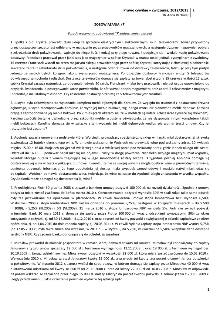 Prawo cywilne – ćwiczenia; 2012/2013 1 Dr Anna Rachwał ZOBOWIĄZANIA: (7) Zasady wykonania zobowiązań *Przedawnienie roszczeń 1. Spółka z o.o. Kryształ prowadzi duży sklep ze sprzętem elektrycznym i elektronicznym, m.in. telewizorami. Towar przywożony przez dostawców sprzętu jest odbierany w magazynie przez pracowników magazynowych, a następnie dyżurny magazynier pobiera z sekretariatu druk pokwitowania, wpisuje do niego ilość i rodzaj przyjętego towaru, i podpisuje się i wydaje kopię pokwitowania dostawcy. Franciszek pracował przez jakiś czas jako magazynier w spółce Kryształ, w marcu został jednak dyscyplinarnie zwolniony. 15 czerwca Franciszek wszedł na teren magazynu sklepu prowadzonego przez spółkę Kryształ, korzystając z chwilowej nieobecności sekretarki zabrał z sekretariatu druk pokwitowania, a następnie odebrał towar od dostawcy telewizorów, fałszując przy tym podpis jednego ze swoich byłych kolegów jako przyjmującego magazyniera. Po odjeździe dostawcy Franciszek włożył 5 telewizorów do własnego samochodu i odjechał. Dostawca telewizorów domaga się zapłaty za towar dostarczony 15 czerwca w ilości 25 sztuk; spółka Kryształ zarzuca natomiast, że otrzymała jedynie 20 sztuk, Franciszek – jako były pracownik - nie był osobą upoważnioną do przyjęcia świadczenia, a postępowanie karne potwierdziło, że sfałszował podpis magazyniera oraz zabrał 5 telewizorów z magazynu i sprzedał je nieustalonym osobom. Czy roszczenie dostawcy o zapłatę za 5 telewizorów jest zasadne? 2. Justyna była zobowiązana do wykonania kompletu mebli dębowych dla Karoliny. Ze względu na trudności z dostawcami drewna dębowego, Justyna zaproponowała Karolinie, że wyda jej meble bukowe, wg innego wzoru niż planowane meble dębowe. Karolina przyjęła zaproponowane jej meble bukowe. Po 2 miesiącach okazało się, że w meblach są kołatki (chrząszcze żywiące się drewnem). Karolina zwróciła Justynie uszkodzone przez szkodniki meble, a Justyna oświadczyła, że nie dysponuje innym kompletem takich mebli bukowych. Karolina domaga się w związku z tym wydania jej mebli dębowych według pierwotnej treści umowy. Czy jej roszczenie jest zasadne? 3. Apolonia zawarła umowę, na podstawie której Wojciech, prowadzący specjalistyczny sklep winiarski, miał dostarczyć jej skrzynkę zawierającą 12 butelek określonego wina. W umowie wskazano, że Wojciech ma przywieźć wino pod wskazany adres, 10 kwietnia między 15.00 a 16.00. Wojciech przyjechał właściwego dnia o właściwej porze pod wskazany adres, gdzie jednak nikogo nie zastał. Odczekał do 16.15 i – ponieważ nadal nikt się nie pojawił – ruszył w drogę powrotną. Niedaleko swojego magazynu miał wypadek, wskutek którego butelki z winem znajdujące się w jego samochodzie zostały rozbite. 3 tygodnie później Apolonia domaga się dostarczenia jej wina w ilości wynikającej z umowy i twierdzi, że nie ze swojej winy nie mogła odebrać wina w pierwotnym terminie, ponieważ otrzymała informację, że tego popołudnia jej siostra miała wypadek samochodowy i musiała natychmiast udać się do szpitala. Wojciech odmawia dostarczenia wina, twierdząc, że wino należące do Apolonii uległo zniszczeniu w wyniku wypadku. Czy Apolonia może domagać się dostarczenia jej wina? 4. Przedsiębiorca Piotr 30 grudnia 2008 r. zawarł z bankiem umowę pożyczki 100 000 zł. na rozwój działalności. Zgodnie z umową pożyczka miała zostać zwrócona do końca marca 2010 r. Oprocentowanie pożyczki wynosiło 30% w skali roku; takie same odsetki były też przewidziane dla opóźnienia w płatnościach. W chwili zawierania umowy stopa lombardowa NBP wynosiła 6,50%. W styczniu 2009 r. stopa lombardowa NBP została obniżona do poziomu 5,75%,, następnie w kolejnych miesiącach – do 5.50% (II.2009), - 5,25% (III.2009) i 5% (VI.2009). 31 marca 2010 r. stopa lombardowa NBP wynosiła 5%. Piotr nie zwrócił pożyczki w terminie. Bank 20 maja 2011 r. domaga się zapłaty przez Piotra 100 000 zł. wraz z odsetkami wynoszącymi 30% za okres korzystania z pożyczki, tj. od 30.12.2008 – 31.12.2010 r. oraz odsetek od kwoty pożyczki powiększonej o odsetki kapitałowe za okres opóźnienia, tj. od 1.04.2010 do dnia żądania zapłaty, tj. 20.05.2011 r. W chwili żądania zapłaty stopa lombardowa NBP wynosi 5,75% (od 12.05.2011 r.; była także zmieniana wcześniej w 2011 r. – w styczniu, na 5,25%, w kwietniu na 5,50%; wszystkie dane dostępne ze strony NBP). Czy żądania banku odnoszące się do odsetek są zasadne? 5. Mirosław prowadził działalność gospodarczą w ramach której nabywał towary od Janusza. Mirosław był zobowiązany do zapłaty Januszowi z tytułu umów sprzedaży 12 000 zł z terminem wymagalności 12.11.2008 r. oraz 18 000 zł. z terminem wymagalności 20.10.2009 r. Janusz udzielił również Mirosławowi pożyczki w wysokości 22 000 zł, która miała zostać zwrócona do 15.03.2010 r. We wrześniu 2010 r. Mirosław wręczył Januszowi kwotę 15 000 zł., a przyjęcie tej kwoty „na poczet długów” Janusz potwierdził w pokwitowaniu. W styczniu 2012 r. Janusz wniósł do sądu pozew, w którym domaga się zapłaty przez Mirosława 40 000 zł wraz z ustawowymi odsetkami od kwoty 18 000 zł od 21.10.2008 r. oraz od kwoty 22 000 zł od 16.03.2008 r. Mirosław w odpowiedzi na pozew wskazał, że zapłacone przez niego 15 000 zł. należy zaliczyć na poczet zwrotu pożyczki, a zobowiązania z 2008 i 2009 r. uległy przedawnieniu. Jakie orzeczenie powinien wydać w tej sytuacji sąd? 1 Prawo cywilne – ćwiczenia; 2012/2013 2 Dr Anna Rachwał 6. Przedsiębiorca A sprzedał innemu przedsiębiorcy B w ramach prowadzonej przez siebie działalności określony towar. Minęły ponad dwa lata od zawarcia umowy. Strony mogły spełnić świadczenia niezwłocznie po jej zawarciu. A w końcu postanowił spełnić świadczenie i poinformował B o tym, że