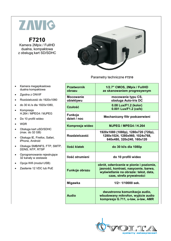 F7210 Kamera 2Mpix / FullHD dualna, kompaktowa z obsługą kart SD/SDHC Parametry techniczne F7210 • Kamera megapikselowa dualna kompaktowa • Zgodna z ONVIF • Rozdzielczość do 1920x1080 • do 30 kl./s dla 1920x1080, • Kompresja H.264 / MPEG4 / MJPEG • Do 10 profili wideo • WDR • Obsługa kart uSD/SDHC (max. do 32 GB) Przetwornik obrazu 1/2.7" CMOS, 2Mpix / FullHD ze skanowaniem progresywnym Mocowanie obiektywu mocowanie typu CS, obsługa Auto-Iris DC 0.08 Lux/F1.2 (kolor) 0.001 Lux/F1.2 (cz/b) Czułość Funkcja dzień / noc Kompresja wideo Rozdzielczość Mechaniczny filtr podczerwieni MJPEG / MPEG4 / H.264 1920x1080 (1080p), 1280x720 (720p), 1280x1024, 1280x960, 1024x768, 640x480, 320x240, 160x120 • Obsługa IE, Firefox, Safari, iPhone, Android • Obsługa SMB/NFS, FTP, SMTP, DDNS, NTP, RTSP Ilość klatek • Oprogramowanie rejestrujące 32 kanały w zestawie Ilość strumieni do 10 profili wideo • Opcja Wifi (moduł USB) • Zasilanie 12 VDC lub PoE Funkcje obrazu obrót, odwrócenie w pionie i poziomie, jasność, kontrast, nasycenie, barwa, wyświetlanie na obrazie: tekst, data, czas, strefa prywatności Migawka Audio do 30 kl/s dla 1080p 1/2~ 1/10000 sek. dwustronna komunikacja audio, wbudowany mikrofon, wyjście audio kompresja G.711, u-law, a-law, AMR Zabezpieczenie hasła uŜytkowników, HTTPS, filtr adresów IP wejścia alarmowe 2 (5V / 12 V DC) wyjścia alarmowe 2 (max. 30W) Ilość połączeń jednoczesnych Zdarzenia alarmowe Reakcja na alarm Złącza Zasilanie Temperatura pracy 10 jednoczesnych połączeń (unicast) bez ograniczeń (multicast) wejście alarmowe, detekcja ruchu, harmonogram, detekcja audio zapis na dysk sieciowy (SMB/NFS), zapis na kartę SD, wysłanie wiadomości email (SMTP), wysyłanie plików na serwer FTP, powiadomienie na serwer HTTP aktywacja wyjścia alarmowego RJ-45 (Ethernet 10/100 Base-T), RCA (wyjście analogowe wideo), złącze blokowe RS-422/RS-485, gniazdo czytnika kart uSD/SDHC, złącze blokowe zasilania (12VDC), przycisk Reset (ustawienia fabryczne), gniazdo Jack 3.5 mm (wejście audio) gniazdo Jack 3.5 mm (wyjście audio) złącze blokowe (we / wy alarmowe) gniazdo USB (opcjonalny moduł wifi) 12 VDC, 1A (zasilacz w zestawie) lub PoE (IEEE 802.3af) -10℃ ℃ ~ +50℃ ℃ Dołączone oprogramowanie Intelligent IP Installer (wyszukanie urządzenia, konfiguracja), CamGraba32 Surveillance Software (rejestracja do 32 kamer IP) Min. wymagania dla komputera klienckiego (przeglądarka www) Pentium 4 2.8 GHz (lub odpowiednik) karta graficzna min. 256MB, 2 GB pamięci RAM Windows 2000/2003/XP/Vista/7 Mac OS Leopard 10.5 (Safari) Protokoły sieciowe Bonjour, TCP/IP, DHCP, PPPoE, ARP, ICMP, FTP, SMTP, DNS, NTP, UPnP, RTSP, RTP, RTCP, HTTP, TCP, UDP, 3GPP/ISMA RTSP Akcesoria w zestawie uchwyt montaŜowy, przejściówka RCA > BNC, złącza blokowe, zasilacz 12 VDC Wymiary Waga 115 x 64 x 56 mm 0,317 kg (bez zasilacza)