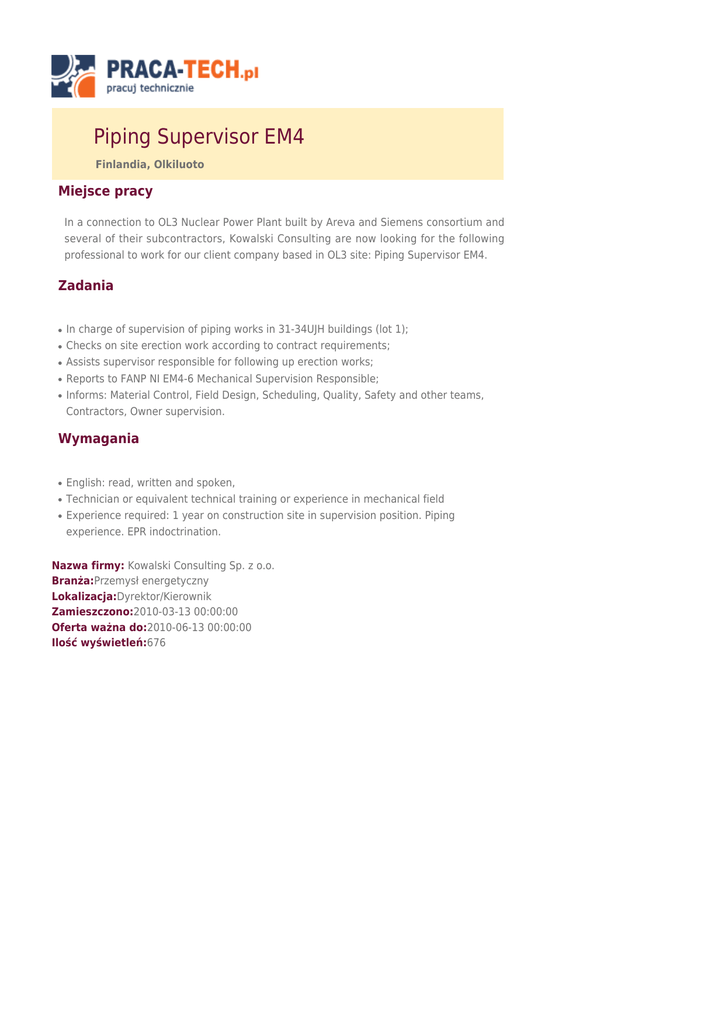 Piping Supervisor EM4 Finlandia, Olkiluoto Miejsce pracy In a connection to OL3 Nuclear Power Plant built by Areva and Siemens consortium and several of their subcontractors, Kowalski Consulting are now looking for the following professional to work for our client company based in OL3 site: Piping Supervisor EM4. Zadania ● ● ● ● ● In charge of supervision of piping works in 31-34UJH buildings (lot 1); Checks on site erection work according to contract requirements; Assists supervisor responsible for following up erection works; Reports to FANP NI EM4-6 Mechanical Supervision Responsible; Informs: Material Control, Field Design, Scheduling, Quality, Safety and other teams, Contractors, Owner supervision. Wymagania ● ● ● English: read, written and spoken, Technician or equivalent technical training or experience in mechanical field Experience required: 1 year on construction site in supervision position. Piping experience. EPR indoctrination. Nazwa firmy: Kowalski Consulting Sp. z o.o. Branża:Przemysł energetyczny Lokalizacja:Dyrektor/Kierownik Zamieszczono:2010-03-13 00:00:00 Oferta ważna do:2010-06-13 00:00:00 Ilość wyświetleń:676