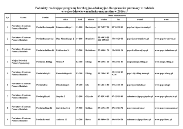 Podmioty realizujące programy korekcyjno-edukacyjne dla sprawców przemocy w rodzinie w województwie warmińsko-mazurskim w 2016 r.* Dane teleadresowe Lp. Nazwa Powiat ulica kod miasto telefon fax e-mail www 1 Powiatowe Centrum Pomocy Rodzinie Powiat bartoszycki Limanowskiego 11 11-200 Bartoszyce 89 762 97 50 89 762 90 05 [email protected] - 2 Powiatowe Centrum Pomocy Rodzinie Powiat braniewski Plac Piłsudskiego 2 14-500 Braniewo 55 644 29 55 666 035 085 55 644 29 55 [email protected] www.pcprbraniewo.pl 3 Powiatowe Centrum Pomocy Rodzinie Powiat działdowski Lidzbarska 31 13-200 Działdowo 23 698 01 30 23 698 01 30 [email protected] www.pcpr.dzialdowo.pl 4 Miejski Ośrodek Pomocy Społecznej Powiat m. Elbląg Winna 9 82-300 Elbląg 55 625 61 00 55 625 61 03 [email protected] www.mops.elblag.pl 5 Powiatowe Centrum Pomocy Rodzinie Powiat elbląski Komeńskiego 40 82-300 Elbląg 55 233 62 82 55 233 62 82 w. 16 [email protected] www.pcpr.elblag.pl 6 Powiatowe Centrum Pomocy Rodzinie Powiat ełcki Piłsudskiego 5 19-300 Ełk 87 621 15 50 87 621 15 50 [email protected] www.pcpr.elk.pl 7 Powiatowe Centrum Pomocy Rodzinie Powiat giżycki Smętka 5 11-500 Giżycko 87 429 10 89 87 429 10 89 [email protected] www.pcpr-gizycko.lo.pl 8 Powiatowe Centrum Pomocy Rodzinie Powiat gołdapski Jaćwieska 14A 19-500 Gołdap 87 615 24 73 87 615 24 72 [email protected] www.pcprgoldap.com.pl 9 Powiatowe Centrum Pomocy Rodzinie Powiat iławski Andersa 12 14-200 Iława 89 649 04 50 89 649 04 50 [email protected] www.pcprilawa.pl 10 Powiatowe Centrum Pomocy Rodzinie Powiat kętrzyński Pocztowa 9 11-400 Kętrzyn 89 751 09 00 89 751 09 00 [email protected] www.pcprketrzyn.pl 11 Powiatowe Centrum Pomocy Rodzinie Powiat lidzbarski Dworcowa 4 11-130 Orneta 55 242 43 58 55 242 43 59 [email protected] www.pcprorneta.pl 12 Powiatowe Centrum Pomocy Rodzinie Powiat mrągowski Warszawska 53 11-700 Mrągowo 89 743 33 60 89 743 33 70 [email protected] www.pcpr.powiat.mrago wo.pl 13 Powiatowe Centrum Pomocy Rodzinie Powiat nidzicki Traugutta 13 13-100 Nidzica 89 625 44 28 89 625 44 28 [email protected] www.pcprnidzica.pl 14 Powiatowe Centrum Pomocy Rodzinie Powiat nowomiejski Grunwaldzka 3 13-300 Nowe Miasto Lubawskie 56 474 31 96 56 474 31 96 [email protected] www.ebip.org.pl/pcprcentrump omocy 15 Powiatowe Centrum Pomocy Rodzinie Powiat olecki Gołdapska 23 19-400 Olecko 87 520 34 30 87 520 47 20 [email protected] www.pcpr.olecko.pl 16 Miejski Zespół Profilaktyki i Terapii Uzależnień Powiat m. Olsztyn Wojska Polskiego 8 10-225 Olsztyn 89 535 77 78 89 535 77 80 [email protected] www.mzpitu.pl 17 Miejski Ośrodek Pomocy Społecznej Powiat m. Olsztyn Marszałka Józefa Piłsudskiego 61A 10-449 Olsztyn 89 534 04 14 89 534 05 38 [email protected] mopsolsztyn.bip.gov.pl 18 Powiatowe Centrum Pomocy Rodzinie Powiat olsztyński Bałtycka 65 10-175 Olsztyn 89 544 38 00 89 544 38 11 [email protected] www.pcprpowiatolsztynski.pl 19 Fundacja Centrum Rozwoju Rodziny "PROGRESJA" z siedzibą w Ostródzie Powiat ostródzki Osiedle Młodych 2 Lok. 46 14-100 Ostróda 509 138 052 - [email protected] - 20 Powiatowe Centrum Pomocy Rodzinie Powiat szczycieński Konopnickiej 70 12-100 Szczytno 89 624 97 10 89 624 97 10 [email protected] www.pcprszczytno.pl 21 Powiatowe Centrum Pomocy Rodzinie Powiat piski Piaskowa 2 12-200 Pisz 87 424 11 38 87 424 11 39 [email protected] - 22 Powiatowe Centrum Pomocy Rodzinie Powiat węgorzewski Gen. J. Bema 16A 11-600 Węgorzew o 87 427 06 45 87 427 06 43 [email protected], www.wegorzewo.naszep pcpr.wegorzewo_ania@wp. cpr.pl pl *dane wg stanu na m-c marzec 2016 r.
