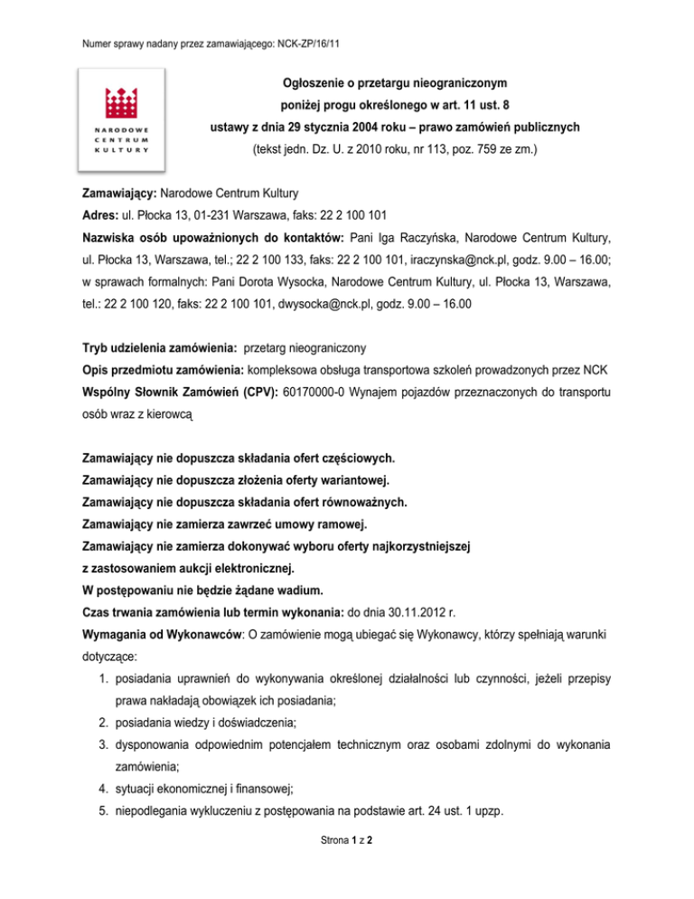 Numer sprawy nadany przez zamawiającego: NCK-ZP/16/11 Ogłoszenie o przetargu nieograniczonym poniżej progu określonego w art. 11 ust. 8 ustawy z dnia 29 stycznia 2004 roku – prawo zamówień publicznych (tekst jedn. Dz. U. z 2010 roku, nr 113, poz. 759 ze zm.) Zamawiający: Narodowe Centrum Kultury Adres: ul. Płocka 13, 01-231 Warszawa, faks: 22 2 100 101 Nazwiska osób upoważnionych do kontaktów: Pani Iga Raczyńska, Narodowe Centrum Kultury, ul. Płocka 13, Warszawa, tel.; 22 2 100 133, faks: 22 2 100 101, [email protected], godz. 9.00 – 16.00; w sprawach formalnych: Pani Dorota Wysocka, Narodowe Centrum Kultury, ul. Płocka 13, Warszawa, tel.: 22 2 100 120, faks: 22 2 100 101, [email protected], godz. 9.00 – 16.00 Tryb udzielenia zamówienia: przetarg nieograniczony Opis przedmiotu zamówienia: kompleksowa obsługa transportowa szkoleń prowadzonych przez NCK Wspólny Słownik Zamówień (CPV): 60170000-0 Wynajem pojazdów przeznaczonych do transportu osób wraz z kierowcą Zamawiający nie dopuszcza składania ofert częściowych. Zamawiający nie dopuszcza złożenia oferty wariantowej. Zamawiający nie dopuszcza składania ofert równoważnych. Zamawiający nie zamierza zawrzeć umowy ramowej. Zamawiający nie zamierza dokonywać wyboru oferty najkorzystniejszej z zastosowaniem aukcji elektronicznej. W postępowaniu nie będzie żądane wadium. Czas trwania zamówienia lub termin wykonania: do dnia 30.11.2012 r. Wymagania od Wykonawców: O zamówienie mogą ubiegać się Wykonawcy, którzy spełniają warunki dotyczące: 1. posiadania uprawnień do wykonywania określonej działalności lub czynności, jeżeli przepisy prawa nakładają obowiązek ich posiadania; 2. posiadania wiedzy i doświadczenia; 3. dysponowania odpowiednim potencjałem technicznym oraz osobami zdolnymi do wykonania zamówienia; 4. sytuacji ekonomicznej i finansowej; 5. niepodlegania wykluczeniu z postępowania na podstawie art. 24 ust. 1 upzp. Strona 1 z 2 Numer sprawy nadany przez zamawiającego: NCK-ZP/16/11 Opis sposobu dokonania oceny spełniania warunków udziału w postępowaniu: Ocena spełniania warunków udziału w postępowaniu zostanie dokonana na podstawie dokumentów złożonych przez Wykonawcę oraz Oświadczenia stanowiącego załącznik nr 2 do SIWZ. Ocena spełniania warunków udziału w postępowaniu zostanie dokonana metodą: spełnia – nie spełnia. Kryteria oceny ofert: Kryterium Znaczenie w % Cena brutto z podatkiem VAT za 1 km świadczenia usługi transportowej 100% Razem 100 % Termin składania ofert: 16.02.2012 r. do godziny 12.00 w Narodowym Centrum Kultury, ul. Płocka 13, 01–231 Warszawa, w recepcji. Termin związania z ofertą: 30 dni, licząc od upływu terminu składania ofert. Określenie sposobu uzyskania specyfikacji istotnych warunków zamówienia oraz adres strony internetowej, na której została zamieszczona Specyfikacja Istotnych Warunków Zamówienia: Specyfikacja istotnych warunków zamówienia jest dostępna w siedzibie Zamawiającego w Narodowym Centrum Kultury, ul. Płocka 13, 01 – 231 Warszawa. Specyfikacja Istotnych Warunków Zamówienia została zamieszczona na stronie internetowej Zamawiającego www.nck.pl Data wywieszenia: 08.02.2011 r. Krzysztof Dudek Dyrektor Narodowego Centrum Kultury Strona 2 z 2