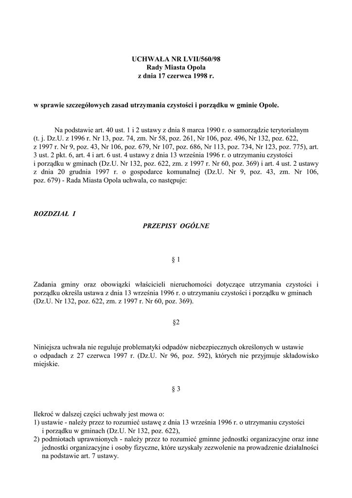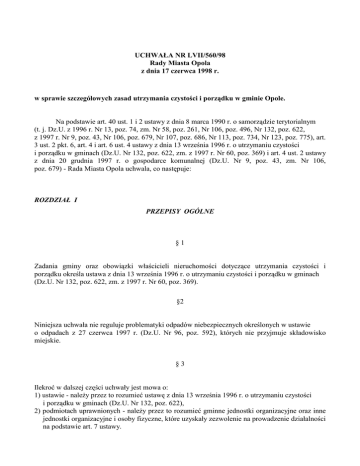 UCHWAŁA NR LVII/560/98 Rady Miasta Opola z dnia 17 czerwca 1998 r. w sprawie szczegółowych zasad utrzymania czystości i porządku w gminie Opole. Na podstawie art. 40 ust. 1 i 2 ustawy z dnia 8 marca 1990 r. o samorządzie terytorialnym (t. j. Dz.U. z 1996 r. Nr 13, poz. 74, zm. Nr 58, poz. 261, Nr 106, poz. 496, Nr 132, poz. 622, z 1997 r. Nr 9, poz. 43, Nr 106, poz. 679, Nr 107, poz. 686, Nr 113, poz. 734, Nr 123, poz. 775), art. 3 ust. 2 pkt. 6, art. 4 i art. 6 ust. 4 ustawy z dnia 13 września 1996 r. o utrzymaniu czystości i porządku w gminach (Dz.U. Nr 132, poz. 622, zm. z 1997 r. Nr 60, poz. 369) i art. 4 ust. 2 ustawy z dnia 20 grudnia 1997 r. o gospodarce komunalnej (Dz.U. Nr 9, poz. 43, zm. Nr 106, poz. 679) - Rada Miasta Opola uchwala, co następuje: ROZDZIAŁ I PRZEPISY OGÓLNE §1 Zadania gminy oraz obowiązki właścicieli nieruchomości dotyczące utrzymania czystości i porządku określa ustawa z dnia 13 września 1996 r. o utrzymaniu czystości i porządku w gminach (Dz.U. Nr 132, poz. 622, zm. z 1997 r. Nr 60, poz. 369). §2 Niniejsza uchwała nie reguluje problematyki odpadów niebezpiecznych określonych w ustawie o odpadach z 27 czerwca 1997 r. (Dz.U. Nr 96, poz. 592), których nie przyjmuje składowisko miejskie. §3 Ilekroć w dalszej części uchwały jest mowa o: 1) ustawie - naleŜy przez to rozumieć ustawę z dnia 13 września 1996 r. o utrzymaniu czystości i porządku w gminach (Dz.U. Nr 132, poz. 622), 2) podmiotach uprawnionych - naleŜy przez to rozumieć gminne jednostki organizacyjne oraz inne jednostki organizacyjne i osoby fizyczne, które uzyskały zezwolenie na prowadzenie działalności na podstawie art. 7 ustawy. 2 ROZDZIAŁ II ZADANIA GMINY §4 Gmina ma ustawowy obowiązek zapewnienia czystości i porządku na swoim terenie, a takŜe stworzenie niezbędnych warunków do ich utrzymania. §5 Jednostki organizacyjne, gospodarujące nieruchomościami będącymi własnością gminy realizują utrzymanie czystości i porządku poprzez podmioty uprawnione. §6 Jednostką zapewniającą składowanie i unieszkodliwianie odpadów komunalnych jest Zakład Komunalny Spółka z o.o. z siedzibą przy ul. Podmiejskiej 69 w Opolu, który: 1. eksploatuje składowisko odpadów komunalnych przy ul. Podmiejskiej 69, 2. organizuje selektywną zbiórkę, segregację i składowanie odpadów przydatnych do wykorzystania, 3. współdziała z jednostkami organizacyjnymi i osobami podejmującymi zbieranie i zagospodarowanie odpadów przydatnych, 4. współdziała z właściwymi jednostkami organizacyjnymi i osobami w organizowaniu gospodarki odpadami niebezpiecznymi. §7 1. Jednostką zapewniającą utrzymanie czystości i porządku w pasie drogowym dróg publicznych na terenie miasta Opola jest Miejski Zarząd Dróg w Opolu Aleja. Przyjaźni 9, którego obowiązkami są: 1. oczyszczanie pasa drogowego dróg publicznych (z wyjątkiem chodników połoŜonych wzdłuŜ nieruchomości) obejmujące: usuwanie śniegu, lodu, liści, błota i innych zanieczyszczeń, 2. usuwanie wraków samochodowych porzuconych w obrębie pasa drogowego, w przypadku braku moŜliwości ustalenia właściciela wraku, 3. ustawianie i opróŜnianie koszy ulicznych na odpady, na ciągach pieszych, w rejonach intensywnego ruchu pieszego. Kosze na odpady winny być rozmieszczone odpowiednio do natęŜenia ruchu pieszego, nie rzadziej jednak niŜ 150m, 4. koszenie traw na poboczach dróg i rowach przydroŜnych co najmniej 2 razy w roku, 5. wysprzątanie wszystkich dróg o nawierzchni utwardzonej po akcji zimowej do końca kwietnia danego roku. 3 2. Jednostką zajmującą się utrzymaniem czystości i porządku na przystankach autobusowych jest Miejski Zakład Komunikacyjny Spółka z o.o. w Opolu, ul. Luboszycka 19, który: 1. zapewnia oczyszczanie terenu przystanków autobusowych (zatoki, chodniki, skarpy, kosze na śmieci, itp.) na długości zatok autobusowych, a w przypadku ich braku na długości 15 m z kaŜdej strony znaku informacyjnego “przystanek autobusowy”, 2. wyposaŜa przystanki autobusowe w kosze na śmieci. 3. Częstotliwość oczyszczania pasów drogowych oraz wykonywania innych czynności porządkowych winny być dostosowane do potrzeb i określone w umowie z podmiotem uprawnionym. §8 Działania z zakresu zimowego utrzymania dróg podporządkowane są Komitetowi do spraw akcji zimowej, powołanemu przez prezydenta miasta Opola. Komitet pracuje w oparciu o plan akcji zimowej. §9 Uprawniony podmiot jest zobowiązany do nieodpłatnego odbioru odpadów komunalnych wielkogabarytowych (stare meble, sprzęty domowe, itp.) wg harmonogramu podanego do wiadomości mieszkańcom. Częstotliwość wywozu tych odpadów nie moŜe być mniejsza niŜ raz na pół roku. § 10 Zarząd Miasta dokonuje przeglądów stanu czystości i porządku w nieruchomościach i wzywa ich właścicieli do usuwania zaniedbań i uchybień w utrzymaniu porządku i czystości. Przeglądy odbywają się nie rzadziej niŜ raz w roku. § 11 Zarząd Miasta podejmie działania dla zorganizowania selektywnej zbiórki odpadów uŜytecznych na terenie Opola oraz ich zagospodarowania. Sposób realizacji oraz harmonogram działań zostanie przedstawiony Radzie Miasta do końca 1998r. 4 ROZDZIAŁ III OBOWIĄZKI WŁAŚCICIELI NIERUCHOMOŚCI I ZASADY ROZLICZANIA ŚWIADCZONYCH USŁUG USUWANIA I UNIESZKODLIWIANIA ODPADÓW KOMUNALNYCH § 12 1. 2. 3. KaŜdy właściciel nieruchomości powinien wyposaŜyć nieruchomość w urządzenia słuŜące do gromadzenia odpadów komunalnych stałych oraz w urządzenia słuŜące do odprowadzania odpadów ciekłych. Lokalizacja urządzeń musi być zgodna z obowiązującymi przepisami. Właściciel nieruchomości odpowiada za stan sanitarny i techniczny tych urządzeń. § 13 1. 2. 3. Odpady stałe i ciekłe powinny być gromadzone i usuwane oddzielnie. Odpady komunalne powinny być usuwane przez podmioty uprawnione. Usuwanie odpadów powinno być dokumentowane umową i dowodami opłat za us