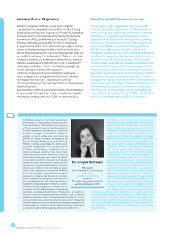 Instrukcja Ruchu i Eksploatacji Operation and Maintenance Instructions Wind Energy Sector associates high hopes with z projektem Europejskiej Instrukcji Ruchu i Eksploatacji Instructions project regarding connection of energy producers. The project of the European System - connection of energy producers (IRE) published as a part of the Third Liberalization Package affords ENTSO-E an opportunity to draft a document containing guidelines for a Pan-European model that will allow for developing harmonized grid connection would certainly facilitate an increase in effectiveness allow onshore and offshore wind energy investors to take better advantage of the existing support systems. stipulated in over 30 different National Operation and The new draft of Instructions will be submitted for draft is to be presented to ACER in June 2012. EUROS is one of the few independent developers and manufacturers of rotor blades for wind turbines. We have been manufacturing w Polsce prowadzimy od ponad dwunastu lat. number of employees at our two production sites in Ustron and Warszowice will reach approximately 500 and our blades are already - Argentina. Poland is not one of those places lowanych polskich farm wiatrowych jest dla stalowane w niemieckich morskich turbinach Katarzyna Schwarz acquiring a share in the market of the newly installed Polish wind farms constitutes an important strategic goal for us. In 2003 we also started manufacturing prototypes of rotor blades for offshore turbines installed in German offshore wind turbines at Bremerhaven. For the world. We continue to work on subsequent prototypes of blades for offshore projects and - - Finance & Controlling EUROS Entwicklungsgesellschaft für Windkraftanlagen mbH wana w mniejszym stopniu lokalnym rynkiem zbytu. Znacznie - Energetyka wiatrowa w Polsce / Wind energy in Poland of an offshore turbine blade by the end of 2012. Launching serial production of such blades will create a need to open a manufacturing site on the coast. The local sales market has been and still is the less important factor contributing to the decision to base our operations in Poland. Apart from experience acquired from the glider production technology. We have been able to directly apply their unique know-how and experience in the process of manufacturing rotor blades for wind farms.