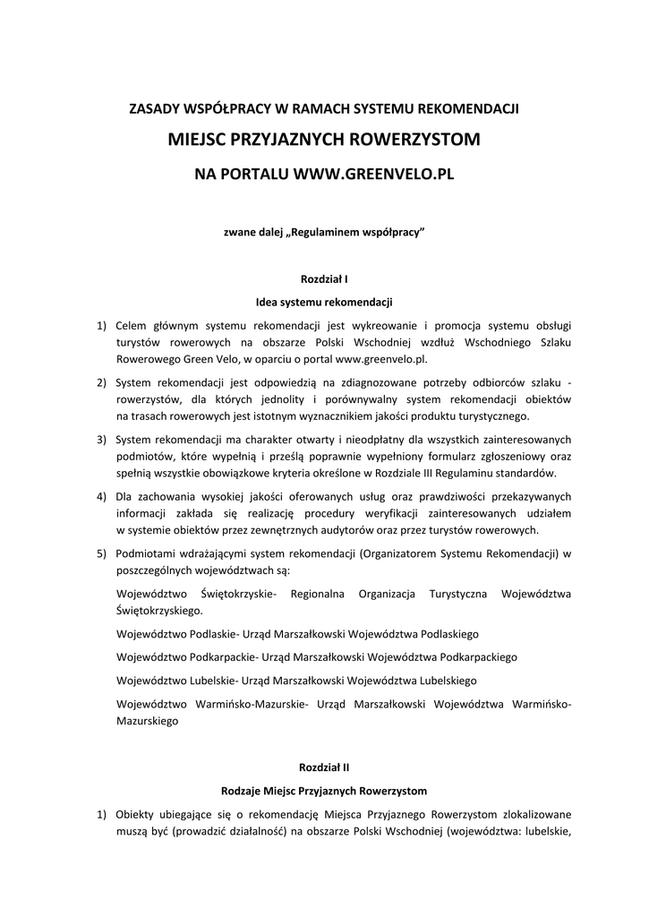 ZASADY WSPÓŁPRACY W RAMACH SYSTEMU REKOMENDACJI MIEJSC PRZYJAZNYCH ROWERZYSTOM NA PORTALU WWW.GREENVELO.PL zwane dalej „Regulaminem współpracy” Rozdział I Idea systemu rekomendacji 1) Celem głównym systemu rekomendacji jest wykreowanie i promocja systemu obsługi turystów rowerowych na obszarze Polski Wschodniej wzdłuż Wschodniego Szlaku Rowerowego Green Velo, w oparciu o portal www.greenvelo.pl. 2) System rekomendacji jest odpowiedzią na zdiagnozowane potrzeby odbiorców szlaku rowerzystów, dla których jednolity i porównywalny system rekomendacji obiektów na trasach rowerowych jest istotnym wyznacznikiem jakości produktu turystycznego. 3) System rekomendacji ma charakter otwarty i nieodpłatny dla wszystkich zainteresowanych podmiotów, które wypełnią i prześlą poprawnie wypełniony formularz zgłoszeniowy oraz spełnią wszystkie obowiązkowe kryteria określone w Rozdziale III Regulaminu standardów. 4) Dla zachowania wysokiej jakości oferowanych usług oraz prawdziwości przekazywanych informacji zakłada się realizację procedury weryfikacji zainteresowanych udziałem w systemie obiektów przez zewnętrznych audytorów oraz przez turystów rowerowych. 5) Podmiotami wdrażającymi system rekomendacji (Organizatorem Systemu Rekomendacji) w poszczególnych województwach są: Województwo ŚwiętokrzyskieŚwiętokrzyskiego. Regionalna Organizacja Turystyczna Województwa Województwo Podlaskie- Urząd Marszałkowski Województwa Podlaskiego Województwo Podkarpackie- Urząd Marszałkowski Województwa Podkarpackiego Województwo Lubelskie- Urząd Marszałkowski Województwa Lubelskiego Województwo Warmińsko-Mazurskie- Urząd Marszałkowski Województwa WarmińskoMazurskiego Rozdział II Rodzaje Miejsc Przyjaznych Rowerzystom 1) Obiekty ubiegające się o rekomendację Miejsca Przyjaznego Rowerzystom zlokalizowane muszą być (prowadzić działalność) na obszarze Polski Wschodniej (województwa: lubelskie, podlaskie, świętokrzyskie, podkarpackie, warmińsko-mazurskie), oraz położone w tzw. korytarzu trasy Wschodniego Szlaku Rowerowego Green Velo. 2) Obszar, na którym wdrażany jest system rekomendacji, przedstawiony został w formie graficznej na mapach, stanowiących załączniki nr 1a-1e do niniejszego dokumentu. Wykaz gmin, objętych systemem rekomendacji, stanowi załącznik nr 2a do niniejszego dokumentu. 3) Rekomendacja obejmuje obiekty świadczące usługi na rzecz rowerzystów, podzielone na pięć następujących kategorii ogólnych: a) OBIEKTY NOCLEGOWE (obiekty świadczące usługi krótkotrwałego wynajmu miejsc noclegowych, zarówno całoroczne, jak i sezonowe); b) ATRAKCJE TURYSTYCZNE, do których wstęp jest odpłatny lub nieodpłatny, ale posiadają swojego zarządcę, np. parki rozrywki, muzea, skanseny, niektóre parki narodowe; c) OBIEKTY GASTRONOMICZNE (np. restauracje, bary); d) INFORMACJE TURYSTYCZNE; e) POZOSTAŁE OBIEKTY USŁUGOWE (stacje paliw, sklepy wielobranżowe, serwisy rowerowe, wypożyczalnie rowerów i sprzętu turystycznego); Rozdział III Standardy Miejsca Przyjaznego Rowerzystom 1. Niniejszy rozdział określa standardy, brane pod uwagę przy klasyfikowaniu obiektu jako Miejsca Przyjaznego Rowerzystom. 2. Standardy wynikają z oczekiwań turystów rowerowych, typu rekomendowanego obiektu oraz przyjętej transparentnej i nieodpłatnej formuły systemu nadawania rekomendacji. Przyjęcie tych standardów zapewnia jednocześnie wysoką jakość oferty obiektów rekomendowanych jako Miejsca Przyjazne Rowerzystom. Dotyczą one elementów oferty niezbędnych z punktu widzenia turysty rowerowego, jakie posiadać powinien obiekt "przyjazny rowerzystom". 3. Standardy mają służyć przede wszystkim promocji dobrych praktyk w zakresie obsługi turystów rowerowych na Wschodnim Szlaku Rowerowym Green Velo. 4. Zaproponowane w niniejszym Regulaminie kryteria służą wyłącznie do charakterystyki zakresu usług, oferowanych przez Miejsca Przyjazne Rowerzystom. Organizator Systemu Rekomendacji zapewnia umieszczenie na portalu www.greenvelo.pl oraz w dedykowanej aplikacji mobilnej wszystkich, zgłoszonych poprawnie pod względem formalnym obiektów, które spełniły w danej kategorii, kryteria obowiązkowe opisane w punkcie poniżej. 5. "Miejsca Przyjazne Rowerzystom" w kategorii: "OBIEKTY NOCLEGOWE" zapewniać powinny następujące, podstawowe świadczenia na rzecz rowerzystów: a1) możliwość skorzystania przez turystę z pobytu na jedną dobę- kryterium obowiązkowe. a2) możliwość bezpiecznego i nieodpłatnego przechowania obowiązkowe. rowerów- kryterium a3) nieodpłatne udostępnianie narzędzi do podstawowych napraw rowerów- kryterium obowiązkowe. a4) posiadanie aktualnej informacji o pobliskich punktach serwisowych i sklepach rowerowych lub sprzedaż części zamiennych do rowerów - kryterium obowiązkowe. 6. "Miejsca Przyjazne Rowerzystom" w kategorii: "ATRAKCJE TURYSTYCZNE" zapewniać powinny następujące, podstawowe świadczenia na rzecz rowerzystów: b1) bezpieczny, nieodpłatny parking rowerowy- kryterium obowiązkowe. b2) bezpieczne, nieodpłatne przechowywanie sprzętu i wyposażenia rowerowego oraz bagażu rowerzysty- kryterium obowiązkowe. (kryterium to nie dotyczy „ATRAKCJI TURYSTYCZNEJ”, po której można poruszać się z rowerem) b3) posiadanie aktualnej informacji o pobliskich punktach serwisowych i sklepach rowerowych lub sprzedaż części zamiennych do rowerów - kryterium obowiązkowe. 7. "Miejsca Przyjazne Rowerzystom" w kategoriach: "OBIEKTY GASTRONOMICZNE", „INFORMACJE TURYSTYCZNE" i w kategorii: "POZOSTAŁE OBIEKTY USŁUGOWE" zadeklarować powinny następujące, podstawowe świadczenia na rzecz rowerzystów: c1) bezpieczny, nieodpłatny parking rowerowy- kryterium obowiązkowe c2) posiadanie aktualnej informacji o pobliskich punktach serwisowych i sklepach rowerowych lub sprzedaż części zamiennych do rowerów - kryterium obowiązkowe. C3) nieodpłatne udostępnianie narzędzi do p