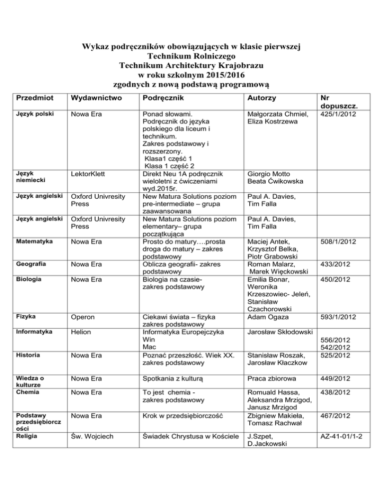 Wykaz podręczników obowiązujących w klasie pierwszej Technikum Rolniczego Technikum Architektury Krajobrazu w roku szkolnym 2015/2016 zgodnych z nową podstawą programową Przedmiot Wydawnictwo Podręcznik Autorzy Nr dopuszcz. Język polski Nowa Era Małgorzata Chmiel, Eliza Kostrzewa 425/1/2012 Język niemiecki LektorKlett Język angielski Oxford Univresity Press Język angielski Oxford Univresity Press Matematyka Nowa Era Geografia Nowa Era Biologia Nowa Era Ponad słowami. Podręcznik do języka polskiego dla liceum i technikum. Zakres podstawowy i rozszerzony. Klasa1 część 1 Klasa 1 część 2 Direkt Neu 1A podręcznik wieloletni z ćwiczeniami wyd.2015r. New Matura Solutions poziom pre-intermediate – grupa zaawansowana New Matura Solutions poziom elementary– grupa początkująca Prosto do matury….prosta droga do matury – zakres podstawowy Oblicza geografii- zakres podstawowy Biologia na czasiezakres podstawowy Fizyka Operon Informatyka Helion Ciekawi świata – fizyka zakres podstawowy Informatyka Europejczyka Win Mac Poznać przeszłość. Wiek XX. zakres podstawowy Giorgio Motto Beata Ćwikowska Paul A. Davies, Tim Falla Paul A. Davies, Tim Falla Maciej Antek, Krzysztof Belka, Piotr Grabowski Roman Malarz, Marek Więckowski Emilia Bonar, Weronika Krzeszowiec- Jeleń, Stanisław Czachorowski Adam Ogaza 508/1/2012 433/2012 450/2012 593/1/2012 Jarosław Skłodowski Stanisław Roszak, Jarosław Kłaczkow 556/2012 542/2012 525/2012 Historia Nowa Era Wiedza o kulturze Chemia Nowa Era Spotkania z kulturą Praca zbiorowa 449/2012 Nowa Era To jest chemia zakres podstawowy 438/2012 Podstawy przedsiębiorcz ości Religia Nowa Era Krok w przedsiębiorczość Romuald Hassa, Aleksandra Mrzigod, Janusz Mrzigod Zbigniew Makieła, Tomasz Rachwał Św. Wojciech Świadek Chrystusa w Kościele J.Szpet, D.Jackowski AZ-41-01/1-2 467/2012 Wykaz podręczników obowiązujących w klasie drugiej Technikum Rolniczego Technikum Architektury Krajobrazu w roku szkolnym 2015/2016 zgodnych z nową podstawą programową Przedmiot Wydawnictwo Podręcznik Autorzy Nr dopuszcz. Język polski Nowa Era Ponad słowami. Podręcznik do języka polskiego dla liceum i technikum. Zakres podstawowy i rozszerzony. Klasa 2 część 1 Równy Anna 425/3/2013 Direkt Neu 1B i 2A podręcznik z ćwiczeniami New Matura Solutions poziom pre-intermediate – grupa zaawansowana New Matura Solutions poziom elementary– grupa początkująca Prosto do matury….prosta droga do matury 2– zakres podstawowy Prosto do matury….prosta droga do matury – zakres rozszerzony Podręcznik cz.I „Moduły, parametry, wektory” Giorgio Motto Beata Ćwikowska Paul A. Davies, Tim Falla Maciej Antek, Krzysztof Belka, Piotr Grabowski 508/1/2012 564/1/2012 AZ-42-01/10 PO-1/12 Chmiel Małgorzata Język niemiecki Język angielski LektorKlett Język angielski Oxford Univresity Press Matematyka Nowa Era Matematyka Nowa Era Biologia Nowa Era Biologia na czasie 1 -zakres rozszerzony Edukacja dla bezpieczeństwa Nowa Era Żyję i działam bezpiecznie Marek Guzik Ewa Jastrzębska Renata Matuszewska Ewa PyłkaGutowska Władysław Zamachowski Jarosław Słoma Religia Św. Wojciech Świadek Chrystusa w Kościele - Moje miejsce w świecie J.Szpet, D.Jackowiak Oxford Univresity Press 333/1/2011/z1 Paul A. Davies, Tim Falla 426/2012 Wykaz podręczników obowiązujących w klasie trzeciej Technikum Rolniczego Technikum Architektury Krajobrazu w roku szkolnym 2015/2016 zgodnych z nową podstawą programową Przedmiot Wydawnictwo Podręcznik Autorzy Nr dopuszcz. Język polski Nowa Era Ponad słowami. Podręcznik do języka polskiego dla liceum i technikum. Zakres podstawowy i rozszerzony. Klasa 2 część 2 A.Równy 425/3/2013 Direkt Neu 2A i 2B podręcznik z ćwiczeniami Oxford Solutions poziom intermediate Giorgio Motto Beata Ćwikowska Paul A Davies, Tim Falla, Joanna Sosnowska Marta Rosińska, Lynda Edwards Maciej Antek, Krzysztof Belka, Piotr Grabowski Język niemiecki LektorKlett Język angielski Oxford Język angielski Macmillan Matura 2015. Repetytorium. Matematyka Nowa Era Matematyka Nowa Era Prosto do matury….prosta droga do matury 3 – zakres podstawowy Prosto do matury….prosta droga do matury – zakres rozszerzony Podręcznik cz.II „Trygonometria” Biologia Nowa Era Biologia na czasie 2 -zakres rozszerzony Historia i społeczeństwo Nowa Era Poznać przeszłość Ojczysty Panteon i ojczyste spory M.Chmiel E.MirkowskaTreugutt F.Dubert, S.Krawczyk, R.Kozik, A.Kula Iwona Janicka 333/1/2011/z1 508/1/2012 659/1/2013 Wykaz podręczników obowiązujących w klasie czwartej Technikum Rolniczego Technikum Architektury Krajobrazu w roku szkolnym 2015/2016 zgodnych z nową podstawą programową Przedmiot Wydawnictwo Podręcznik Autorzy Nr dopuszcz. Język polski Nowa Era Ponad słowami. Podręcznik do języka polskiego dla liceum i technikum. Zakres podstawowy i rozszerzony. Klasa 2 część 2 A.Równy , M.Chmiel R.Pruszczyński 425/5/2015 Język niemiecki LektorKlett Macmillan Matematyka Nowa Era Giorgio Motto Beata Ćwikowska Marta Rosińska, Lynda Edwards Maciej Antek, Krzysztof Belka, Piotr Grabowski 333/1/2011/z1 Język angielski Direkt Neu 2A i 2B podręcznik z ćwiczeniami Matura 2015. Repetytorium. Matematyka Nowa Era Biologia Nowa Era Biologia na czasie 3 -zakres rozszerzony Franciszek Dubert, Marek Jurgowiak, Maria MarkoWorłowska, Władysław Zamachowski 564/3/2014 Historia i społeczeństwo Nowa Era Poznać przeszłość Jarosław Centek 659/3/2014 Karol Kłodziński, Tomasz Krzemiński 659/4/2015 Prosto do matury….prosta droga do matury 3 – zakres podstawowy Prosto do matury….prosta droga do matury – zakres rozszerzony Podręcznik cz.II „Trygonometria” Wojna i wojskowość Europa i świat 508/3/2014