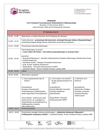 PROGRAM Form Inicjatyw Pozarządowych Województwa Podkarpackiego Rzeszów, 27-28 czerwca 2014 r. hotel Zimowit, Aleja Armii Krajowej 4b, Rzeszów 27 czerwca (piątek) 10:30 - 11:00 Rejestracja w Hotelu Zimowit, Armii Krajowej 4b, Rzeszów 11:00 - 11:15 Częśd plenarna – prezentacja idei tworzenia „Strategii Rozwoju Sektora Obywatelskiego”, prezentacja Regionalnego Panelu Ekspertów, prezentacja programu 11:15 - 12:00 Prezentacja materiału filmowego. Panel dyskusyjny na temat: „Trzeci sektor dla Polski – rola sektora pozarządowego w rozwoju kraju” 13:30 - 14:30 paneliści: - Krzysztof Więckiewicz - Dyrektor Departamentu Pożytku Publicznego, Ministerstwo Pracy i Polityki Społecznej - Stanisław Sienko - Zastępca Prezydenta Rzeszowa - prof. dr hab. Józefina Hrynkiewicz - Kinga Bielec - Prezeska Stowarzyszenia JARTE - Stanisław Baska - Prezes Fundacji Fundusz Lokalny SMK Obiad 14:30 -16:00 Warsztaty w grupach: 12:00 - 13:30 16:00 - 16:15 16:15 - 16:45 1. Czym jest/powinien byd III sektor? 2. Co III sektor ma zmienid? W jaki sposób powinien to robid? 3. Wartości w III sektorze. prowadzenie: Grzegorz Nowakowski, Przewodniczący Podkarpackiej Rady Organizacji Pozarządowych prowadzenie: Kamila Michalik, Prezeska Fundacji Akademia Obywatelska prowadzenie: Aleksandra Chodasz, trenerka i prezeska Fundacji Rozwoju "Dobre Życie" Anna Pakuła - Sacharczuk, była pełnomocnik ds. współpracy z organizacjami pozarządowymi w Podkarpackim Urzędzie Marszałkowskim Przerwa kawowa Kinga Bielec, Prezeska Stowarzyszenia JARTE Prezentacja nowego funduszu grantowego – „Akademia Aktywnych Obywateli – Podkarpackie Inicjatywy Lokalne” – Stanisław Baska, Prezes Fundacji Fundusz Lokalny SMK 16:45 - 18:00 18:00 Hyde Park – różności dotyczące III sektora, m.in. Stoisko poświęcone nowemu funduszowi grantowemu dla woj. podkarpackiego "Akademia Aktywnych Obywateli - Podkarpackie Inicjatywy Lokalne" "Wolontariat - NGO - CITY NGO" - prezentacja projektu, w tym miasteczka NGO na Cieszanów Rock Festiwal w sierpniu 2014 r. - Marcin Kurnik, Stowarzyszenie Wsparcie "Nowe technologie w organizacjach" - przydatne narzędzia, portale, strony Elżbieta Świętek, Stowarzyszenie Inicjatyw Lokalnych KUŹNIA …. i inne Kolacja 28 czerwca (sobota) 9:00 - 9:45 Przedstawienie wyników prac grup na forum „Dostęp do mediów publicznych - niewykorzystana szansa” - przedstawienie wniosków Regionalnego Panelu Ekspertów, dyskusja 9:45 - 10:45 10:45 - 11:00 paneliści: - przedstawiciel Polskiego Radia Rzeszów - przedstawiciel TVP Rzeszów - Pan Rafał Ciupioski - Prezes Zarządu Fundacji Podkarpackie Hospicjum dla Dzieci Przerwa kawowa Praca w grupach warsztatowych w kontekście zagadnieo: 11:00 - 12:00 Ludzie w organizacjach, Współpraca wewnątrz sektora Finanse organizacji Wizerunek organizacji i III sektora Warsztaty dla organizacji pozarządowych w zakresie kontaktów z mediami - „Nie bój się dziennikarza” 12:15 - 13:30 13:30 - 13:45 prowadzenie: - Bernadeta Szczypta, Wojciech Wójcik - dziennikarze Polskiego Radia Rzeszów, redaktorzy portalu www.podkarpackie-pozarzadowe.pl - Barbara Pawlak - dziennikarka TVP Rzeszów Przerwa kawowa 13:45 - 14:15 Prezentacja akcji „Masz głos – masz wybór” - Barbara Kobus, prezeska zarządu Stowarzyszenia "Projekt Europa" 14:15 - 14:45 Dyskusja podsumowująca. Prezentacja wyników prac grup. Zaproszenie na VII Ogólnopolskie Forum Inicjatyw Pozarządowych, Warszawa 14-15 września 2014 r. 14:45 - 15:30 Obiad Organizator w woj. podkarpackim: Patronat medialny: