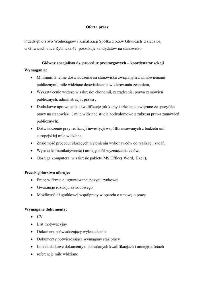 Oferta pracy Przedsiębiorstwo Wodociągów i Kanalizacji Spółka z o.o.w Gliwicach z siedzibą w Gliwicach ulica Rybnicka 47 poszukuje kandydatów na stanowisko Główny specjalista ds. procedur przetargowych – koordynator sekcji Wymagania: Minimum 5 letnie doświadczenie na stanowisku związanym z zamówieniami publicznymi, mile widziane doświadczenie w kierowaniu zespołem, Wykształcenie wyższe w zakresie: ekonomii, zarządzania, prawa zamówień publicznych, administracji , prawa , Dodatkowe uprawnienia i kwalifikacje jak kursy i szkolenia związane ze specyfiką pracy na stanowisku ( mile widziane studia podyplomowe z zakresu prawa zamówień publicznych), Doświadczenie przy realizacji inwestycji współfinansowanych z budżetu unii europejskiej mile widziane, Znajomość procedur służących wyłonieniu wykonawców do realizacji zadań, Wysoka komunikatywność i umiejętność wyznaczania celów, Obsługa komputera w zakresie pakietu MS Office( Word, Exel ), Przedsiębiorstwo oferuje: Pracę w firmie o ugruntowanej pozycji rynkowej Gwarancję rozwoju zawodowego Możliwość długofalowej współpracy w oparciu o umowę o pracę Wymagane dokumenty: CV List motywacyjny Dokument poświadczający wykształcenie Dokumenty potwierdzające wymagany staż pracy Inne dodatkowe dokumenty o posiadanych kwalifikacjach i umiejętnościach referencje mile widziane Osoby zainteresowane prosimy o składanie aplikacji drogą pocztową na adres Przedsiębiorstwo Wodociągów i Kanalizacji Spółka z.o.o w Gliwicach ulica Rybnicka 47 , osobiście pod wyżej wymieniony adres w Dziale Kadr, Płac i Spraw Socjalnych pokój 301 lub drogą mailową na adres [email protected] .pl