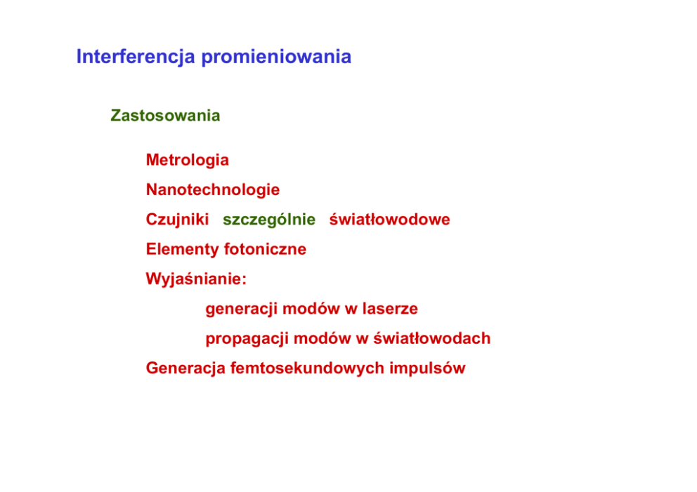 Interferencja promieniowania Zastosowania Metrologia Nanotechnologie Czujniki szczególnie światłowodowe Elementy fotoniczne Wyjaśnianie: generacji modów w laserze propagacji modów w światłowodach Generacja femtosekundowych impulsów Interferencja promieniowania A1 Dwa punktowe źródła Dwie fale z punktów An, n = 1, 2 r1 V1 = V01 exp(iωt ) P V2 = V02 exp(iωt ) r2 V0n – amplituda zespolona uwzględniająca początkową fazę ϕn A2 V0 n = V0 n exp(iϕn ) Pole w punkcie P po przejściu dróg rn VP (t ) = V1 exp(ikr1 ) + V2 exp(ikr2 ) = [V01 exp(ikr1 ) + V02 exp(ikr2 )]exp(iωt ) Intensywność → I P = V01V01∗ + V02 V02∗ + I P = VP (t )VP∗ (t ) + V01V02∗ exp[ik (r1 − r2 )] + V01∗ V02 exp[− ik (r1 − r2 )] Interferencja promieniowania cd I P = V01V01∗ + V02 V02∗ + + V01V02∗ exp[ik (r1 − r2 )] + V01∗ V02 exp[− ik (r1 − r2 )] V01V01∗ = I 01 I0n jest intensywnością promieniowania w punkcie P pochodzącego od punktu An n=1,2 V02 V02∗ = I 02 V01V02∗ = V01 V02 exp[i(ϕ1 − ϕ2 )] = I 01I 02 exp(iΔϕ) ∗ 01 ( V V02 = V01V więc ) ∗ ∗ 02 Δϕ = ϕ1 − ϕ 2 = I 01I 02 exp(− iΔϕ) I P = I 01 + I 02 + I 01I 02 [exp(ix ) + exp(− ix )] gdzie I P = I 01 + I 02 + 2 I 01I 02 cos x x = k (r1 − r2 ) + Δϕ gdyż exp(ix ) + exp(− ix ) = 2 cos x Interferencja promieniowania cd A1 r1 P r2 A2 i ostatecznie wynik interferencji dla 2 punktowych źródeł I P = I 01 + I 02 + 2 I 01I 02 cos [k (r1 − r2 ) + Δϕ] Δϕ = ϕ1 - ϕ2 różnica faz początkowych obydwu interferujących fal Fale monochromatyczne emitowane przez 2 atomy Przypadkowe i niezależne emisje fotonów dla obu źródeł Fazy początkowe ϕ1(t) i ϕ2(t) są przypadkowymi i szybkozmiennymi funkcjami czasu t Różnica faz Δϕ(t) jest taką samą funkcją, a więc IP (t ) = I01 + I02 + 2 I01I02 cos [k (r1 − r2 ) + Δϕ(t )] Rejestrujemy średnią wartość w czasie Δt znacznie dłuższym od okresu przypadkowych zmian IP = gdzie I n = 1 I 0 n (t ) dt n = 1,2 ∫ Δt Δt 1 I P (t ) dt = I1 + I 2 ∫ Δt Δt gdyż uśrednienie cos daje wartość zerową W optycznym paśmie interferencji promieniowania z dwóch niezależnych źródeł nie można zarejestrować Fale są niekoherentne (niespójne) Fala monochromatyczna emitowana przez punktowe źródło A1 zwierciadło A0 – źródło pierwotne A1 i A2 – źródła wtórne A0 ≡ A2 P A1P = r1 A 2 P = r2 dzielnik Teraz różnica faz początkowych Δϕ = 0 Dla różnych położeń punktów P stacjonarny rozkład intensywności I P = I 01 + I 02 + 2 I 01I 02 cos [k (r1 − r2 )] Fala monochromatyczna emitowana przez punktowe źródło cd Długość fali λ w ośrodku o współczynniku załamania n v – prędkość fali T – okres λ = vT Oznaczając przez λ0 długość fali w próżni, wtedy cT λ 0 λ= = n n Oznaczenie oraz Δr = r1 − r2 2π 2πn k= = λ0 λ m= n Δr λ0 rząd interferencji Równanie interferencyjne ⎛ n Δr ⎞ ⎟⎟ = I 01 + I 02 + 2 I 01I 02 cos(2πm ) I P = I 01 + I 02 + 2 I 01I 02 cos⎜⎜ 2π λ0 ⎠ ⎝ Iloczyn nr jest drogą optyczną, a więc nΔr - różnicą dróg optycznych Fala monochromatyczna emitowana przez punktowe źródło cd I P max = I 01 + I 02 + 2 I 01I 02 Prążek jasny gdy cos = 1 → Kontrast C = i wtedy λ0 2K lub m = 0, ± 1, ± 2, .. 2 I P min = I 01 + I 02 − 2 I 01I 02 Prążek ciemny gdy cos = -1 n Δr = → n Δr = I P max − I P min I P max + I P min λ0 (2K + 1) lub m = ±0.5, ± 1.5, ± 2.5 .. 2 maksymalny C = 1 gdy I P = 4I 0 cos 2 (πm ) I 01 = I 02 = I 0 I P min = 0 I P max = 4I 0 Interferencja fal emitowanych przez atom A1 Atom nie promieniuje światłem monochromatycznym x r1 P r 1 = r2 r2 A2 λ2 π λ1 IP W płaszczyźnie π dla różnych długości fal λ , a więc i kołowej liczby falowej k , rozkład będzie różny, gdyż I P (k ) = I 01 + I 02 + 2 I 01I 02 cos(kΔr ) λ2 > λ1 Tylko w punkcie P dla Δr = 0 mamy prążek jasny dla każdego λ Δr = 0 Obraz dla 2 długości fal x interferencja.exe Interferencja w świetle białym x 0 Interferencja fal emitowanych przez źródło punktowe Źródło promieniuje w przedziale Δλ ∈ (λ1, λ2) i Δk ∈ (k1, k2) A1 x r1 I P (k ) = I 01 + I 02 + 2 I 01I 02 cos(kΔr ) P r 1 = r2 r2 A2 π Odbiornik rejestruje sumę intensywności dla każdego k I PC = ∫ I P (k )dk Δk W punkcie Δr = 0 → I PC = max Wraz ze wzrostem odległości od punktu, dla którego r1 = r2 → rośnie Δr oscylują wartości cos(kΔr) między +1 a -1 różnie dla różnych k Kontrast prążków zmniejsza się Istnieje graniczna odległość xg poza którą kontrast zaniknie Interferencja fal emitowanych przez atom przykład Wraz ze wzrostem Δk maleje obszar prążków z wysokim kontrastem Warunek wysokiego kontrastu C ≥ 0.9 promieniowanie quasikoherentne 0.65 λ2 Δrg = ≈ Δk 10 Δλ Aby uzyskać prążki przy dużej różnicy dróg trzeba stosować źródła quasimonochromatyczne Przełomowa rola laserów α h 2α Interferencja promieni odbitych od dwóch powierzchni Równanie ciemnego prążka dla małych kątów α lub dużych promieni R 2 h = λ(K + 0.5 ) K = 0, ± 1, ± 2,.. R h Obraz prążków Prążki (Isaac’a) Newton’a (1642-1727) Interferometry powierzchnia sprawdzana sprawdzian Ob Program automatycznie wyznacza kształt powierzchni sprawdzanej z dokładnością rzędu λ/50 dzielnik laser kamera CCD Interferometr (Hypolite’a) Fizeau (czytaj fizo) (1819-1896) Interferometry Element badany kamera CCD Laser z układem optycznym Kanał odniesienia Interferometr (L) Mach’a- (L) Zehnder’a Przykłady Wpływ konwekcji powietrza Konwekcja powietrza w płomieniu świecy Struga powietrza Prążki Newtona i płytka w świetle białym → Płytka o zmiennej grubości Mucha na wodzie Literatura uzupełniająca E.Hecht, A.Zajac: Optics. Addison-Wesley Publ. Co., Reading Mass. 1974, rozdział 9 R.Jóźwicki: Podstawy inżynierii fotonicznej. Ofic,Wyd. PW, Warszawa 2006 B.E.A.Saleh, M.C.Teich : Fundamentals of Photonics, John Wiley & 