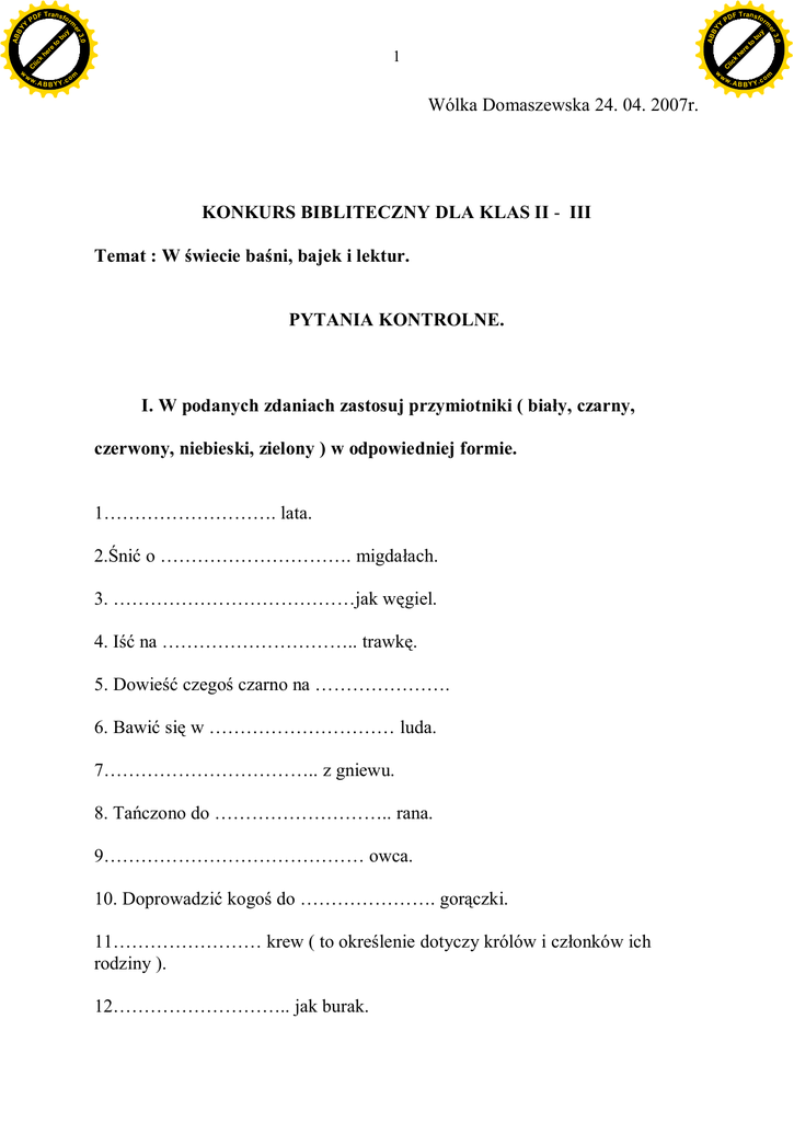 A B B Y Y.c Y F T ra n sf o to bu y rm re he k C lic he k lic C w. om w w w w PD ABB 1 re to Y 3.0 3.0 bu y rm er Y F T ra n sf o ABB PD er Y Wólka Domaszewska 24. 04. 2007r. KONKURS BIBLITECZNY DLA KLAS II - III Temat : W świecie baśni, bajek i lektur. PYTANIA KONTROLNE. I. W podanych zdaniach zastosuj przymiotniki ( biały, czarny, czerwony, niebieski, zielony ) w odpowiedniej formie. 1………………………. lata. 2.Śnić o …………………………. migdałach. 3. …………………………………jak węgiel. 4. Iść na ………………………….. trawkę. 5. Dowieść czegoś czarno na …………………. 6. Bawić się w ………………………… luda. 7…………………………….. z gniewu. 8. Tańczono do ……………………….. rana. 9…………………………………… owca. 10. Doprowadzić kogoś do …………………. gorączki. 11…………………… krew ( to określenie dotyczy królów i członków ich rodziny ). 12……………………….. jak burak. w. A B B Y Y.c om A B B Y Y.c Y F T ra n sf o to bu y rm re he k C lic he k lic C w. om w w w w PD ABB 2 re to Y 3.0 3.0 bu y rm er Y F T ra n sf o ABB PD er Y 13 Nie mieć …………………….. pojęcia. 14………………………….. strona czegoś. 15……………………………. robota. 16…………………………….. szaleństwo. 17……………………………… charakter. 18……………………………….. jak snieg. 19. Odłożyć coś na ………………….. godzinę. 20………………………………….. rozpacz. II. Rozwiąż krzyżówkę: 1. X X 2. X 3. 4. 5. Podaj tytuły bajek, o których jest mowa. 1. Brat, Baba Jaga, Siostra, piec, skarby. 2. Leniwe córki, macocha, pracowita sierota, pantofelek, książę. 3. Biedny szewczyk , napotkane zwierzęta, uwięziona królewna, wiedźmy. 4. Królewna, zła macocha, krasnoludki, zatrute jabłko, książę. 5. Rodzina niedźwiadków, dziewczynka, tata, mama, złote włosy. III. Odpowiedz na pytania z bajek i lektur: w. A B B Y Y.c om A B B Y Y.c Y F T ra n sf o to bu y rm re he k C lic he k lic C w. om w w w w PD ABB 3 re to Y 3.0 3.0 bu y rm er Y F T ra n sf o ABB PD er Y 1. Co zgubił kopciuszek na schodach pałacowych? 2. Jaka była zagroda? 3. Co wyczuła prawdziwa księżniczka przez dwadzieścia materaców i dwadzieścia puchowych kołder? 4. W jaki sposób Śnieżka wróciła do życia? 5. Były dwie siostry: Śnieżnobiała i …………………………. 6. Był zrobiony z plasteliny. Mieszkał w piórniku Tosi. 7. Psotki i ………………………. 8. Doktor Dolittle i jego………………………… 9. Bohater tej książki pokonał trzy Smoki Dziw – dziwadła, odzyskał słońce i księżyc, ożenił się z najmłodszą córką Baby Jagi i został królem. 10. Kaczka……………………………….. IV. Odpowiedz opisowo na zadane poniżej pytania. 1. W jakich okolicznościach Doktor Dolittle postanowił zostać lekarzem zwierząt?.................................................................................................... …………………………………………………………………………… …………………………………………………………………………… …………………………………………………………………………… ……………………………………………………………………………. …………………………………………………………………………….. 2. Dzięki czemu dziadek wyciągnął Rzepkę. Kto mu w tym pomagał? ………………………………………………………………………… …………………………………………………………………………. ………………………………………………………………………….. ……………………………………………………………………………. ……………………………………………………………………………. …………………………………………………………………………… w. A B B Y Y.c om A B B Y Y.c Y F T ra n sf o to bu y rm re he k C lic he k lic C w. om w w w w PD ABB 4 re to Y 3.0 3.0 bu y rm er Y F T ra n sf o ABB PD er Y Opracował i przeprowadził : Radosław Wardak. Wólka Domaszewska 17. Dnia : 24.04.2007 r. Podpis opiekuna stażu : Podpis Dyrektora : w. A B B Y Y.c om