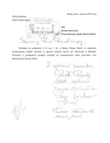 Marki, dnia 3 czerwca 2014 roku Dzialajac na podstawie § 41 ust. 1 lit. a Statutu Miasta Marki, w zalaczeniu przekazujemy projekt uchwaly w sprawie nadania nazwy sali sportowej w Markach. Wnosimy 0 przekazanie projektu uchwaly do zaopiniowania radcy prawnemu oraz Burmistrzowi Miasta Marki . '--J t I eli D LKrl ..... .,.. ., PROJEI<T UCHWALANR ... RADY MIASTA MARKI Z DNIA ... w sprawie nadania nazwy sali sportowej w Markach na podstawie art. 7 list. 1 pkt 10 oraz art. 18 list. 1 ustawy z dnia 8 marca 1990 roku 0 samorzqdzie gminnym (tekst jednolity Dz. U. z 2013 r., poz. 594 ze zm.) uchwala sie, co nastepuje: § 1. Sali sportowej , zlokalizowanej w Markach przy ul. Duzej 4, nadaje sie nastepujaca nazwe: .Hala Sportowo-Widowiskowa im. Bozeny Markiewicz w Markach" § 2. Wykonanie uchwaly powierza sie Burmistrzowi Miasta Marki. § 3. Uchwala wchodzi w zycie z dniem podjecia. K:_j sztof Kurzeja ;~;;y UZASADNIENIE Bozena Markiewicz (zd. Gniedziuk), mieszkanka Marek, nauczycielka wychowania fizycznego, trenerka, wybitna szczypiornistka urodzila sie 4 sierpnia 1961 roku w Warszawie. Sw6j pierwszy mecz w bialo-czerwonych barwach rozegrala jako szesnastolatka w kategorii juniorek. W karierze seniorskiej rozegrala w bialo -czerwonych barwach az 241 spotkan, co jest rekordem w historii polskiej pilki recznej . Imponuje rowniez znakomitym wynikiem bramkowym - 398 bramelc. Siedmiokrotnie uczestniczyla w Mistrzostwach Swiata grupy A i B. W roku 1985 wywalczyla wicemistrzostwo kraju, a w 1995 roku zdobyla Puc har Polski. Uwazana za jedna z najlepszych polskich pilkarek recznych lat 80. W karierze sportowej bronila barw AZS AWF Warszawa, Skry Warszawa, Via Weny Warszawa, Oslo Haugerud (Norwegia) i Rumelange (Luksemburg). Po zakonczeniu kariery sportowej zostala trenerka oraz nauczycielka wychowania fizycznego. Trenowala zawodniczki UKS Varsovia oraz przyczynila sie do powstania sekcji pilki recznej dziewczat w Mareckim Towarzystwie Sportowym Marcovia 2000. W latach 2000 - 2012 byla nauczycielem w Zespole Szkol Nr 1 im. Jana Pawla II w Markach, gdzie dala sie poznac jako wybitny pedagog, dobra kolezanka orazjak mowia 0 niej sami nauczyciele: "dobry duch szkoly". Zmarla po ciezkiej chorobie 12 stycznia 2014 roku . Spoczela na mareckim cmentarzu przy ul. Bandurskiego. Majac na uwadze wybitne osiagmecia Bozeny Markiewicz jako zawodniczki i reprezentantki Polski oraz Jej zaslugi dla lokalnej spolecznosci wnosimy 0 nadanie jej imienia hali sportowej przy ul. Duzej - jednemu z najwiekszych obiekt6w sportowych w powiecie wolominskim, miejscu trening6w oraz rozgrywania mecz6w, umilowanej przez Nia, pilki recznej . Wyrazamy nadzieje, ze bedzie to godny spos6b na uhonorowanie tak wybitnej Postaci i wpisania Jej w historie naszego miasta. --