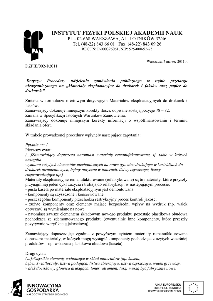 INSTYTUT FIZYKI POLSKIEJ AKADEMII NAUK PL - 02-668 WARSZAWA, AL. LOTNIKÓW 32/46 Tel. (48-22) 843 66 01 Fax. (48-22) 843 09 26 REGON: P-000326061, NIP: 525-000-92-75 Warszawa, 7 marzec 2011 r. DZPIE/002-I/2011 Dotyczy: Procedury udzielenia zamówienia publicznego w trybie przetargu nieograniczonego na „Materiały eksploatacyjne do drukarek i faksów oraz papier do drukarek.”. Zmiana w formularzu ofertowym dotyczącym Materiałów eksploatacyjnych do drukarek i faksów. Zamawiający dokonuje niniejszym korekty ilości: dopisane zostają pozycje 78 – 82. Zmiana w Specyfikacji Istotnych Warunków Zamówienia. Zamawiający dokonuje niniejszym korekty informacji o współfinansowaniu i terminu składania ofert. W trakcie prowadzonej procedury wpłynęły następujące zapytania: Pytanie nr: 1 Pierwszy cytat: (…)Zamawiający dopuszcza natomiast materiały remanufakturowane, tj. takie w których nastąpiła wymiana zużytych elementów mechanicznych na nowe (głowice drukujące w kartridżach do drukarek atramentowych, bębny optyczne w tonerach, listwy czyszczące, listwy rozprowadzające itp.) Materiały eksploatacyjne remanufakturowane (refabrykowane) są to materiały, które przyszły przynajmniej jeden cykl zużycia i trafiają do refabrykacji, w następującym procesie: - pusta kaseta po materiale eksploatacyjnym jest demontowana - komponenty są czyszczone i konserwowane - poszczególne komponenty przechodzą restrykcyjny proces kontroli jakości - zużyte komponenty oraz elementy mające bezpośredni wpływ na wydruk (np. wałek optyczny) są wymieniane na nowe - natomiast zawsze elementem składowym nowego produktu pozostaje plastikowa obudowa pochodząca ze zdemontowanego produktu (ewentualnie inne komponenty, które przeszły pozytywnie weryfikację jakościową) Zamawiający dopuszczając zgodnie z powyższym cytatem materiały remanufakturowane dopuszcza materiały, w których mogą wystąpić komponenty pochodzące z użytych wcześniej produktów – np. wskazana plastikowa obudowa (kaseta). Drugi cytat: (…)Wszystkie elementy wchodzące w skład materiałów (np. kaseta, bęben światłoczuły, listwa podająca, listwa zbierająca, listwa czyszcząca, wałek grzewczy, wałek dociskowy, głowica drukująca, toner, atrament, tusz) muszą być fabrycznie nowe, nieregenerowane, nierefabrykowane, nie wchodzące wcześniej (pierwotnie) w całości ani w części w skład innych materiałów (nieużywane). Muszą one posiadać znak firmowy producenta, etykiety zawierające numer katalogowy i termin jego ważności. Pod pojęciem ,,fabrycznie nowe” należy rozumieć materiały eksploatacyjne, które w swoim całym procesie produkcyjnym (za wyjątkiem kartonowego opakowania) są wytwarzane z elementów wytworzonych od podstaw, bez użycia w jakikolwiek sposób komponentów uzyskanych z innych produktów wcześniej użytkowanych (w szczególności dotyczy to obudowy W powyższym cytacie Zamawiający wyklucza możliwość oferowania materiałów remanufakturowanych (refabrykowanych), ponieważ nie akceptuje użycia w procesie produkcyjnym komponentów pochodzących z używanych wcześniej produktów, co jest podstawą procesu refabrykacji. Pierwszy akapit dopuszcza produkty remanufakturowane (właściwie – refabrykowane), drugi je wyklucza, proszę o informację, które wymaganie Zamawiającego jest obligatoryjne. Odpowiedzi: Ad 1) Zamawiający w SIWZ dopuszcza zamienniki fabrycznie nowe, wyprodukowane tylko z nowych elementów, spełniające wszystkie normy jakościowe i testy wymienione w SIWZ. Zamawiający dopuszcza materiały eksploatacyjne zamienne remanufakturowane, w tym wypadku Zamawiający dopuszcza użycie wyczyszczonej kasety tonera jako jedynej części niemechanicznej, spełniające wszystkie normy jakościowe i testy wymienione w SIWZ.