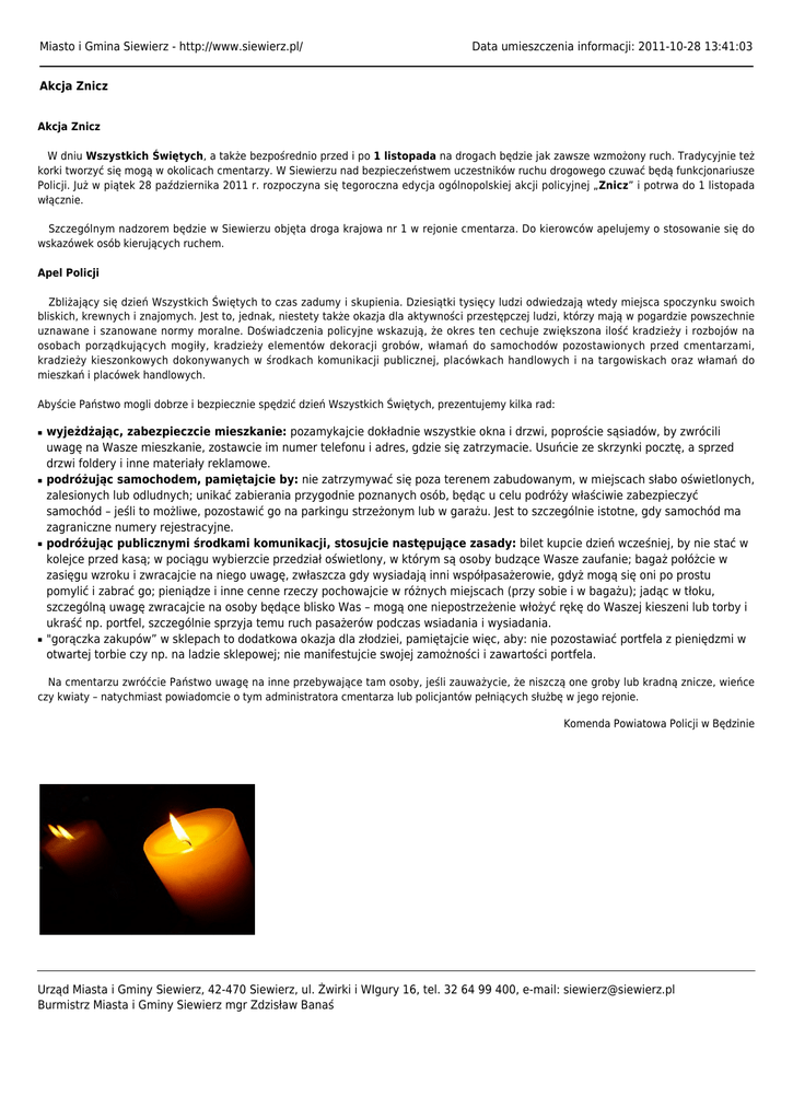 Miasto i Gmina Siewierz - http://www.siewierz.pl/ Data umieszczenia informacji: 2011-10-28 13:41:03 Akcja Znicz Akcja Znicz W dniu Wszystkich Świętych, a także bezpośrednio przed i po 1 listopada na drogach będzie jak zawsze wzmożony ruch. Tradycyjnie też korki tworzyć się mogą w okolicach cmentarzy. W Siewierzu nad bezpieczeństwem uczestników ruchu drogowego czuwać będą funkcjonariusze Policji. Już w piątek 28 października 2011 r. rozpoczyna się tegoroczna edycja ogólnopolskiej akcji policyjnej „Znicz” i potrwa do 1 listopada włącznie. Szczególnym nadzorem będzie w Siewierzu objęta droga krajowa nr 1 w rejonie cmentarza. Do kierowców apelujemy o stosowanie się do wskazówek osób kierujących ruchem. Apel Policji Zbliżający się dzień Wszystkich Świętych to czas zadumy i skupienia. Dziesiątki tysięcy ludzi odwiedzają wtedy miejsca spoczynku swoich bliskich, krewnych i znajomych. Jest to, jednak, niestety także okazja dla aktywności przestępczej ludzi, którzy mają w pogardzie powszechnie uznawane i szanowane normy moralne. Doświadczenia policyjne wskazują, że okres ten cechuje zwiększona ilość kradzieży i rozbojów na osobach porządkujących mogiły, kradzieży elementów dekoracji grobów, włamań do samochodów pozostawionych przed cmentarzami, kradzieży kieszonkowych dokonywanych w środkach komunikacji publicznej, placówkach handlowych i na targowiskach oraz włamań do mieszkań i placówek handlowych. Abyście Państwo mogli dobrze i bezpiecznie spędzić dzień Wszystkich Świętych, prezentujemy kilka rad: ■ ■ ■ ■ wyjeżdżając, zabezpieczcie mieszkanie: pozamykajcie dokładnie wszystkie okna i drzwi, poproście sąsiadów, by zwrócili uwagę na Wasze mieszkanie, zostawcie im numer telefonu i adres, gdzie się zatrzymacie. Usuńcie ze skrzynki pocztę, a sprzed drzwi foldery i inne materiały reklamowe. podróżując samochodem, pamiętajcie by: nie zatrzymywać się poza terenem zabudowanym, w miejscach słabo oświetlonych, zalesionych lub odludnych; unikać zabierania przygodnie poznanych osób, będąc u celu podróży właściwie zabezpieczyć samochód – jeśli to możliwe, pozostawić go na parkingu strzeżonym lub w garażu. Jest to szczególnie istotne, gdy samochód ma zagraniczne numery rejestracyjne. podróżując publicznymi środkami komunikacji, stosujcie następujące zasady: bilet kupcie dzień wcześniej, by nie stać w kolejce przed kasą; w pociągu wybierzcie przedział oświetlony, w którym są osoby budzące Wasze zaufanie; bagaż połóżcie w zasięgu wzroku i zwracajcie na niego uwagę, zwłaszcza gdy wysiadają inni współpasażerowie, gdyż mogą się oni po prostu pomylić i zabrać go; pieniądze i inne cenne rzeczy pochowajcie w różnych miejscach (przy sobie i w bagażu); jadąc w tłoku, szczególną uwagę zwracajcie na osoby będące blisko Was – mogą one niepostrzeżenie włożyć rękę do Waszej kieszeni lub torby i ukraść np. portfel, szczególnie sprzyja temu ruch pasażerów podczas wsiadania i wysiadania. "gorączka zakupów” w sklepach to dodatkowa okazja dla złodziei, pamiętajcie więc, aby: nie pozostawiać portfela z pieniędzmi w otwartej torbie czy np. na ladzie sklepowej; nie manifestujcie swojej zamożności i zawartości portfela. Na cmentarzu zwróćcie Państwo uwagę na inne przebywające tam osoby, jeśli zauważycie, że niszczą one groby lub kradną znicze, wieńce czy kwiaty – natychmiast powiadomcie o tym administratora cmentarza lub policjantów pełniących służbę w jego rejonie. Komenda Powiatowa Policji w Będzinie Urząd Miasta i Gminy Siewierz, 42-470 Siewierz, ul. Żwirki i WIgury 16, tel. 32 64 99 400, e-mail: [email protected] Burmistrz Miasta i Gminy Siewierz mgr Zdzisław Banaś