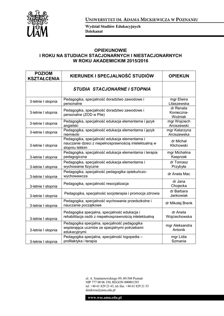 opiekunowie i roku na studiach stacjonarnych i niestacjonarnych w