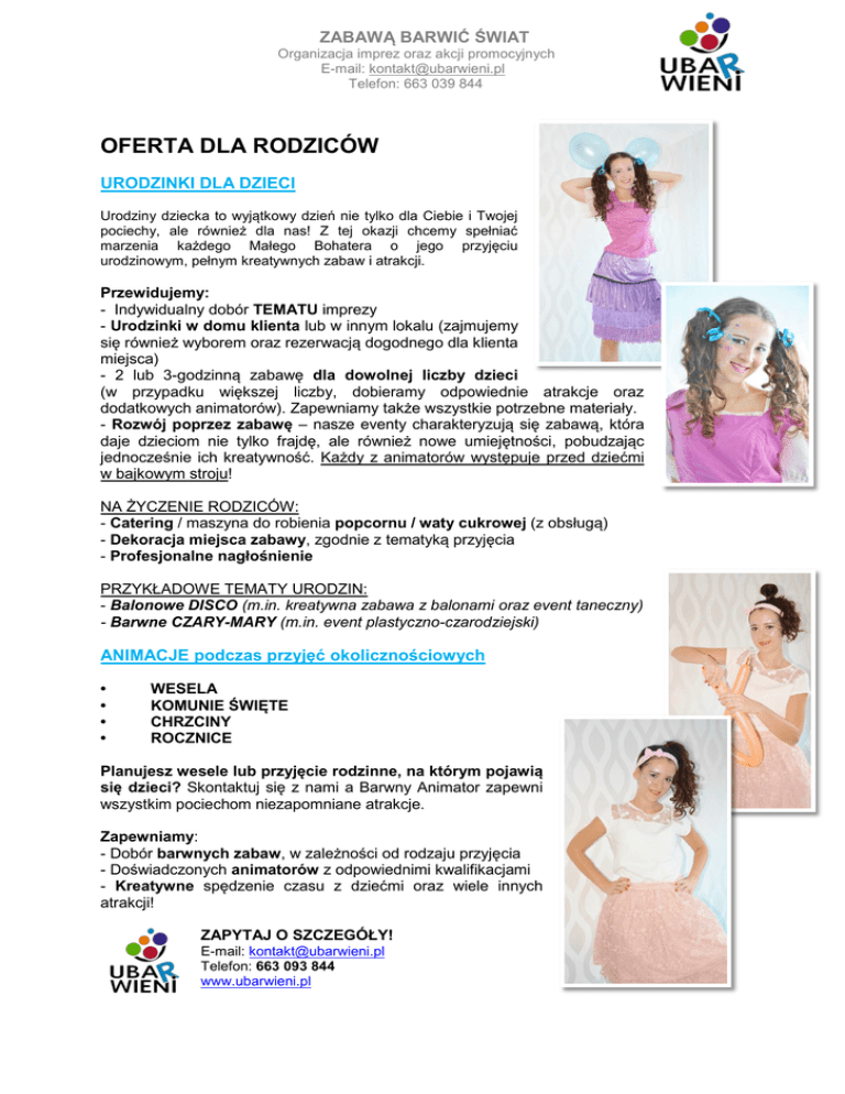 ZABAWĄ BARWIĆ ŚWIAT Organizacja imprez oraz akcji promocyjnych E-mail: [email protected] Telefon: 663 039 844 OFERTA DLA RODZICÓW URODZINKI DLA DZIECI Urodziny dziecka to wyjątkowy dzień nie tylko dla Ciebie i Twojej pociechy, ale również dla nas! Z tej okazji chcemy spełniać marzenia każdego Małego Bohatera o jego przyjęciu urodzinowym, pełnym kreatywnych zabaw i atrakcji. Przewidujemy: - Indywidualny dobór TEMATU imprezy - Urodzinki w domu klienta lub w innym lokalu (zajmujemy się również wyborem oraz rezerwacją dogodnego dla klienta miejsca) - 2 lub 3-godzinną zabawę dla dowolnej liczby dzieci (w przypadku większej liczby, dobieramy odpowiednie atrakcje oraz dodatkowych animatorów). Zapewniamy także wszystkie potrzebne materiały. - Rozwój poprzez zabawę – nasze eventy charakteryzują się zabawą, która daje dzieciom nie tylko frajdę, ale również nowe umiejętności, pobudzając jednocześnie ich kreatywność. Każdy z animatorów występuje przed dziećmi w bajkowym stroju! NA ŻYCZENIE RODZICÓW: - Catering / maszyna do robienia popcornu / waty cukrowej (z obsługą) - Dekoracja miejsca zabawy, zgodnie z tematyką przyjęcia - Profesjonalne nagłośnienie PRZYKŁADOWE TEMATY URODZIN: - Balonowe DISCO (m.in. kreatywna zabawa z balonami oraz event taneczny) - Barwne CZARY-MARY (m.in. event plastyczno-czarodziejski) ANIMACJE podczas przyjęć okolicznościowych • • • • WESELA KOMUNIE ŚWIĘTE CHRZCINY ROCZNICE Planujesz wesele lub przyjęcie rodzinne, na którym pojawią się dzieci? Skontaktuj się z nami a Barwny Animator zapewni wszystkim pociechom niezapomniane atrakcje. Zapewniamy: - Dobór barwnych zabaw, w zależności od rodzaju przyjęcia - Doświadczonych animatorów z odpowiednimi kwalifikacjami - Kreatywne spędzenie czasu z dziećmi oraz wiele innych atrakcji! ZAPYTAJ O SZCZEGÓŁY! E-mail: [email protected] Telefon: 663 093 844 www.ubarwieni.pl