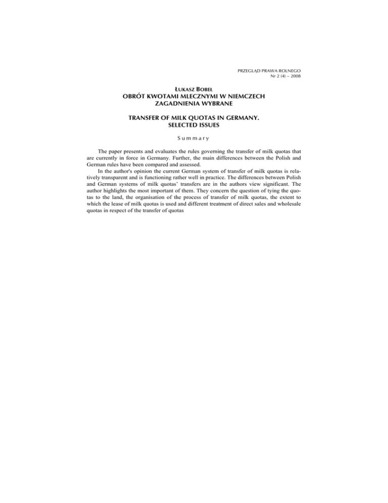 PRZEGLĄD PRAWA ROLNEGO Nr 2 (4) – 2008 ŁUKASZ BOBEŁ OBRÓT KWOTAMI MLECZNYMI W NIEMCZECH ZAGADNIENIA WYBRANE TRANSFER OF MILK QUOTAS IN GERMANY. SELECTED ISSUES Summary The paper presents and evaluates the rules governing the transfer of milk quotas that are currently in force in Germany. Further, the main differences between the Polish and German rules have been compared and assessed. In the author's opinion the current German system of transfer of milk quotas is relatively transparent and is functioning rather well in practice. The differences between Polish and German systems of milk quotas’ transfers are in the authors view significant. The author highlights the most important of them. They concern the question of tying the quotas to the land, the organisation of the process of transfer of milk quotas, the extent to which the lease of milk quotas is used and different treatment of direct sales and wholesale quotas in respect of the transfer of quotas