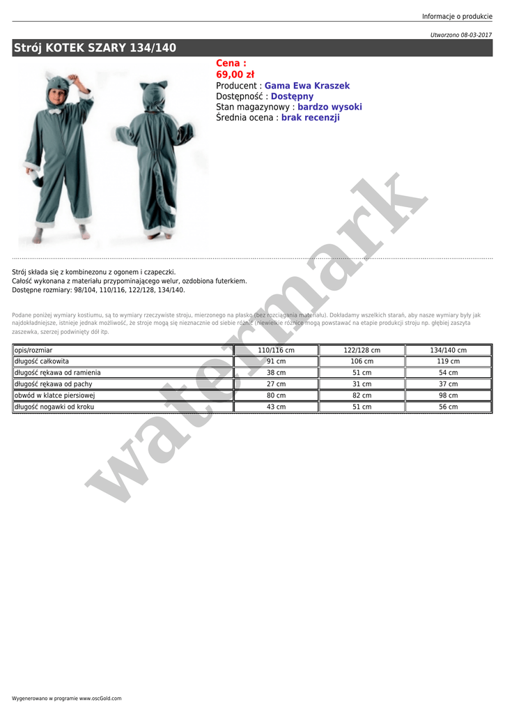 Informacje o produkcie Utworzono 08-03-2017 Strój KOTEK SZARY 134/140 Cena : 69,00 zł er m ar k Producent : Gama Ewa Kraszek Dostępność : Dostępny Stan magazynowy : bardzo wysoki Średnia ocena : brak recenzji Strój składa się z kombinezonu z ogonem i czapeczki. Całość wykonana z materiału przypominającego welur, ozdobiona futerkiem. Dostępne rozmiary: 98/104, 110/116, 122/128, 134/140. Podane poniżej wymiary kostiumu, są to wymiary rzeczywiste stroju, mierzonego na płasko (bez rozciągania materiału). Dokładamy wszelkich starań, aby nasze wymiary były jak najdokładniejsze, istnieje jednak możliwość, że stroje mogą się nieznacznie od siebie różnić (niewielkie różnice mogą powstawać na etapie produkcji stroju np. głębiej zaszyta zaszewka, szerzej podwinięty dół itp. opis/rozmiar długość całkowita długość rękawa od ramienia długość rękawa od pachy obwód w klatce piersiowej w at długość nogawki od kroku Wygenerowano w programie www.oscGold.com 110/116 cm 122/128 cm 134/140 cm 91 cm 106 cm 119 cm 38 cm 51 cm 54 cm 27 cm 31 cm 37 cm 80 cm 82 cm 98 cm 43 cm 51 cm 56 cm