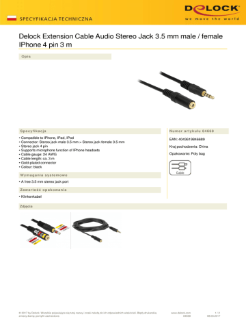 Delock Extension Cable Audio Stereo Jack 3.5 mm male / female IPhone 4 pin 3 m Opis Specyfikacja • Compatible to IPhone, IPad, IPod • Connector: Stereo jack male 3.5 mm > Stereo jack female 3.5 mm • Stereo jack 4 pin • Supports microphone function of IPhone headsets • Cable gauge: 24 AWG • Cable length: ca. 3 m • Gold-plated connector • Colour: black Numer artykułu 84668 EAN: 4043619846689 Kraj pochodzenia: China Opakowanie: Poly bag Wymagania systemowe • A free 3.5 mm stereo jack port Zawartość opakowania • Klinkenkabel Zdjęcia © 2017 by Delock. Wszelkie pojawiające się tutaj nazwy i znaki należą do ich odpowiednich właścicieli. Błędy drukarskie, zmiany & pomyłki zastrzeżone. www.delock.com 84668 1/2 08.03.2017 Interface złącze 1: 1 x 3-pinowy, stereofoniczny jack męski 3,5 mm złącze 2: 1 x 4-pinowe żeńskie złącze jack stereo 3,5 mm Physical characteristics Kolor przewodu: czarny Conductor gauge: 24 AWG Length: 3m © 2017 by Delock. Wszelkie pojawiające się tutaj nazwy i znaki należą do ich odpowiednich właścicieli. Błędy drukarskie, zmiany & pomyłki zastrzeżone. Powered by TCPDF (www.tcpdf.org) www.delock.com 84668 2/2 08.03.2017