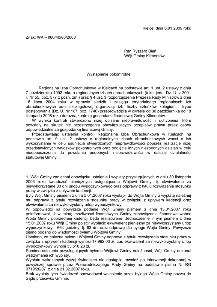 Kielce, dnia 6.01.2009 roku Znak: WK – 060/40/86/2008 Pan Ryszard Bień Wójt Gminy Klimontów Wystąpienie pokontrolne Regionalna Izba Obrachunkowa w Kielcach na podstawie art. 1 ust. 2 ustawy z dnia 7 października 1992 roku o regionalnych izbach obrachunkowych (tekst jedn. Dz. U. z 2001 r. Nr 55, poz. 577 z późn. zm.) oraz § 4 ust. 3 rozporządzenia Prezesa Rady Ministrów z dnia 16 lipca 2004 roku w sprawie siedzib i zasięgu terytorialnego regionalnych izb obrachunkowych oraz szczegółowej organizacji izb, liczby członków kolegium i trybu postępowania (Dz. U. Nr 167, poz. 1746) przeprowadziła w okresie od 30 października do 18 listopada 2008 roku doraźną kontrolę gospodarki finansowej Gminy Klimontów. W wyniku kontroli stwierdzono niżej opisane nieprawidłowości i uchybienia, które powstały na skutek nie przestrzegania obowiązujących przepisów prawa przez osoby odpowiedzialne za gospodarkę finansową Gminy. Przedstawiając ustalenia kontroli Regionalna Izba Obrachunkowa w Kielcach na podstawie art. 9 ust. 2 ustawy o regionalnych izbach obrachunkowych wnosi o ich wykorzystanie w celu usunięcia stwierdzonych nieprawidłowości poprzez realizację niżej przedstawionych wniosków pokontrolnych oraz podjęcie innych niezbędnych działań w celu niedopuszczenia do powstania podobnych nieprawidłowości w dalszej działalności statutowej Gminy. 1. Wójt Gminy zaniechał obowiązku ustalenia i wypłaty przysługujących w dniu 30 listopada 2006 roku świadczeń pieniężnych ustępującemu Wójtowi Gminy, tj. ekwiwalentu za niewykorzystane 83 dni urlopu wypoczynkowego oraz odprawy z tytułu rozwiązania stosunku pracy w związku z upływem kadencji. Były Wójt Gminy pismem z dnia 5.01.2007 roku wystąpił do Wójta Gminy o wypłatę należnej mu odprawy z tytułu rozwiązania stosunku pracy w związku z upływem kadencji oraz ekwiwalentu za niewykorzystany urlop wypoczynkowy. W odpowiedzi na powyższe podanie Wójt Gminy pismem z dnia 15.01.2007 roku poinformował, iż w miarę możliwości finansowych Gminy zobowiązania finansowe wobec Wójta Gminy poprzedniej kadencji będą realizowane. Jednocześnie innym pismem z dnia 15.01.2007 roku Wójt Gminy polecił wypłacić ekwiwalent pieniężny za niewykorzystany urlop wypoczynkowy - 664 godziny, tj. 83 dni oraz odprawę dla byłego Wójta Gminy. Powyższe pismo podano do wiadomości byłemu Wójtowi Gminy. Ustalono, że należna byłemu Wójtowi Gminy odprawa z tytułu rozwiązania stosunku pracy w związku z upływem kadencji wynosi 17.982,00 zł, zaś ekwiwalent za niewykorzystany urlop wypoczynkowy wynosi 33.516,23 zł. Pomimo ustalenia przysługujących byłemu Wójtowi Gminy należności, Wójt Gminy dokonał wstrzymania ich wypłaty. Wypłata wskazanych wyżej świadczeń nie nastąpiła również po interwencji dokonanej w powyższej sprawie przez Przewodniczącego Rady Gminy na podstawie pisma Nr RG 0719/20/07 z dnia 21.02.2007 roku. Brak wypłaty tych świadczeń spowodował wniesienie przez byłego Wójta Gminy pozwu do Sądu przeciwko Gminie. 2 W dniu 11 kwietnia 2007 roku Sąd Rejonowy w Sandomierzu Wydział IV Pracy po rozpoznaniu sprawy z powództwa byłego Wójta o ekwiwalent za niewykorzystany urlop wypoczynkowy i odprawę pieniężną, wydał wyrok Sygn. Akt IVP 25/07, którym zasądził od Urzędu Gminy na rzecz Powoda kwotę 51.497,40 zł wraz z odsetkami w wysokości 11,50% w stosunku rocznym od 30 listopada 2006 roku. W świetle powyższych ustaleń, zaniechanie przez Wójta Gminy wypłaty przysługującej byłemu Wójtowi Gminy odprawy z tytułu rozwiązania stosunku pracy w związku z upływem kadencji oraz ekwiwalentu za niewykorzystany urlop spowodowało konieczność zapłaty łącznie kwoty 9.019,89 zł tytułem odsetek w wysokości 3.154,30 zł i kosztów egzekucyjnych w wysokości 5.865,59 zł. Odpowiedzialność za stwierdzoną nieprawidłowość ponosi Wójt Gminy. Stwierdzona nieprawidłowość może stanowić naruszenie dyscypliny finansów publicznych w rozumieniu art. 16 ust. 1 ustawy z dnia 14 grudnia 2004 roku o odpowiedzialności za naruszenie dyscypliny finansów publicznych (Dz. U. z 2005 r. Nr 14, poz. 114 ze zm.), polegające na niewykonaniu zobowiązania Urzędu Gminy, którego skutkiem była zapłata odsetek i opłat. Odpowiedzialność za naruszenie dyscypliny finansów publicznych może ponosić Wójt Gminy Pan Ryszard Bień. Wniosek pokontrolny Nr 1 Przestrzegać terminów wypłaty wynagrodzeń, stosownie do art. 85 ustawy z dnia 26 czerwca 1974 roku Kodeks pracy (tekst jedn. Dz. U. z 1998 r. Nr 21, poz. 94 z późn. zm.), nie dopuszczając do sytuacji, w której pracownik może dochodzić należności na drodze sądowej. 2. W miesiącu marcu 2007 roku Skarbnik Gminy dokonała obliczenia przysługującego pracownikom Urzędu Gminy dodatkowego wynagrodzenia rocznego za 2006 rok z uwzględnieniem wynagrodzenia byłego Wójta w wysokości 7.787,19 zł brutto. Jednakże Wójt Gminy wstrzymał wypłatę dodatkowego wynagrodzenia rocznego dla byłego Wójta Gminy, co narusza art. 5 ust. 2 ustawy z dnia 12 grudnia 1997 roku dodatkowym wynagrodzeniu rocznym dla pracowników jednostek państwowej sfery budżetowej (Dz. U. Nr 16 poz. 1080 z późn. zm.), zgodnie z którym wynagrodzenie roczne wypłaca się nie później niż w ciągu pierwszych trzech miesięcy roku kalendarzowego następującego po roku, za który przysługuje to wynagrodzenie. W dniu 16 maja 2007 roku Sąd Rejonowy w Sandomierzu Wydział IV Pracy po rozpoznaniu sprawy z powództwa byłego Wójta Gminy o wynagrodzenie, wydał wyrok Sygn. akt IVP 63/07, którym zasądził od Urzędu Gminy na rzecz Powoda kwotę 7.787,19 zł, tytułem dodatkowego wynagrodzenia rocznego wraz z odsetkami w wysokości 11,50% w stosunku rocznym od 29 listopada 2006 roku. Na podstawie powyższego wyroku dnia 08.06.2007 roku z konta Urzędu Gminy dokonano przelewu na konto byłego Wójta Gminy kwoty 5.048,48 zł, tytułem wypłaty do