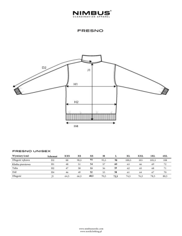 fresno fresno unisex Wymiary (cm) Schemat XXS XS Długość rękawa D2 Klatka piersiowa Talia Dół H4 46 49 Długość J1 64,5 66,5 88 90,5 H1 48 51 H2 47 50 XS 93 95,5 53 56 54 52 68,5 M 57 55 70,5 www.nimbusnordic.com www.nordiclothing.pl L XL XXL 103 3XL 105,5 4XL 98 100,5 63 66 69 72 59 62 65 68 71 60 58 72,5 108 61 64 67 70 74,5 76,5 78,5 80,5