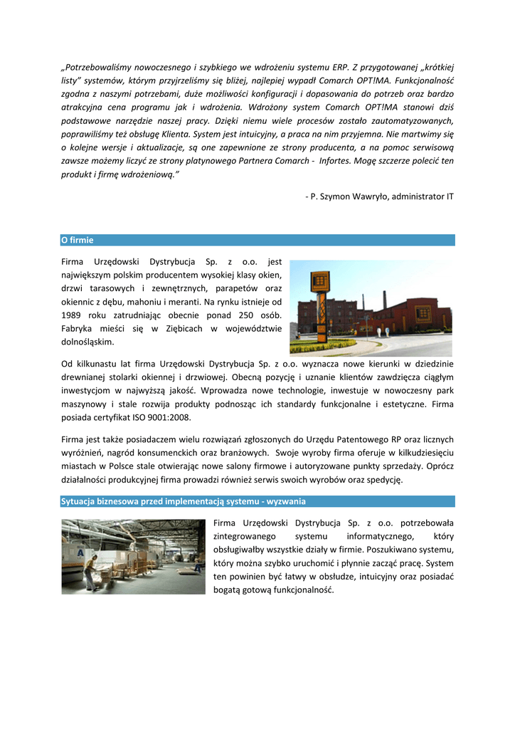 „Potrzebowaliśmy nowoczesnego i szybkiego we wdrożeniu systemu ERP. Z przygotowanej „krótkiej listy” systemów, którym przyjrzeliśmy się bliżej, najlepiej wypadł Comarch OPT!MA. Funkcjonalność zgodna z naszymi potrzebami, duże możliwości konfiguracji i dopasowania do potrzeb oraz bardzo atrakcyjna cena programu jak i wdrożenia. Wdrożony system Comarch OPT!MA stanowi dziś podstawowe narzędzie naszej pracy. Dzięki niemu wiele procesów zostało zautomatyzowanych, poprawiliśmy też obsługę Klienta. System jest intuicyjny, a praca na nim przyjemna. Nie martwimy się o kolejne wersje i aktualizacje, są one zapewnione ze strony producenta, a na pomoc serwisową zawsze możemy liczyć ze strony platynowego Partnera Comarch - Infortes. Mogę szczerze polecić ten produkt i firmę wdrożeniową.” - P. Szymon Wawryło, administrator IT O firmie Firma Urzędowski Dystrybucja Sp. z o.o. jest największym polskim producentem wysokiej klasy okien, drzwi tarasowych i zewnętrznych, parapetów oraz okiennic z dębu, mahoniu i meranti. Na rynku istnieje od 1989 roku zatrudniając obecnie ponad 250 osób. Fabryka mieści się w Ziębicach w województwie dolnośląskim. Od kilkunastu lat firma Urzędowski Dystrybucja Sp. z o.o. wyznacza nowe kierunki w dziedzinie drewnianej stolarki okiennej i drzwiowej. Obecną pozycję i uznanie klientów zawdzięcza ciągłym inwestycjom w najwyższą jakość. Wprowadza nowe technologie, inwestuje w nowoczesny park maszynowy i stale rozwija produkty podnosząc ich standardy funkcjonalne i estetyczne. Firma posiada certyfikat ISO 9001:2008. Firma jest także posiadaczem wielu rozwiązań zgłoszonych do Urzędu Patentowego RP oraz licznych wyróżnień, nagród konsumenckich oraz branżowych. Swoje wyroby firma oferuje w kilkudziesięciu miastach w Polsce stale otwierając nowe salony firmowe i autoryzowane punkty sprzedaży. Oprócz działalności produkcyjnej firma prowadzi również serwis swoich wyrobów oraz spedycję. Sytuacja biznesowa przed implementacją systemu - wyzwania Firma Urzędowski Dystrybucja Sp. z o.o. potrzebowała zintegrowanego systemu informatycznego, który obsługiwałby wszystkie działy w firmie. Poszukiwano systemu, który można szybko uruchomić i płynnie zacząć pracę. System ten powinien być łatwy w obsłudze, intuicyjny oraz posiadać bogatą gotową funkcjonalność. Bez takiego rozwiązania przygotowanie potrzebnych informacji, raportów, kalkulacji zabierałoby dużo czasu, a dane nie zawsze byłyby bieżące. Zdecydowano więc na wdrożenie systemu Comarch OPT!MA aby możliwe było zapanowanie nad wszystkimi procesami w firmie, a w szczególności obsługa magazynu, zakupów, sprzedaży, obszaru finansowo-księgowego oraz kadrowo-płacowego. Przepływ informacji powinien być płynny, a dane wprowadzane w działach handlowych dostępne z poziomu księgowego by zautomatyzować wiele czynności. Rozwiązanie Comarch OPT!MA to system modułowy, zintegrowany, spełniający wymagania firmy i dający możliwości rozwoju w przyszłości. Do wdrożenia wybrano firmę Infortes z Wrocławia Platynowego Partnera Comarch. Zdecydowano się na system Comarch OPT!MA, ze względu na: • • • • • • Pełną integralność systemu, budowę modułową Doskonałe dopasowanie systemu do polskich realiów i modelu prowadzenia przedsiębiorstwa Dbałość producenta o aktualność i ciągłą zgodność systemu z bieżącymi przepisami Intuicyjność i łatwość obsługi Szerokie możliwości rozbudowy systemu Możliwość korzystania ze wsparcia Partnera i bieżącej obsługi serwisowej Wdrożenie rozpoczęło się od analizy przedwdrożeniowej, w ramach której zostały określone dokładne potrzeby firmy, sposób konfiguracji systemu i model pracy w systemie po jego wdrożeniu. Zostały wdrożone takie moduły jak: • • • • • • Kasa/Bank Faktury Handel Księga Handlowa Płace i Kadry Środki Trwałe Po zakończonej parametryzacji systemu firma Infortes dokładnie przeszkoliła pracowników przygotowując ich do samodzielnej pracy na systemie. Korzyści Wdrożenie systemu Comarch OPT!MA w firmie Urzędowski Dystrybucja Sp. z o.o. z całą pewnością usprawniło pracę wszystkim pracownikom. Została znacznie poprawiona obsługa Klienta dzięki o ponad 10% szybszej realizacji zamówień. Gospodarka materiałowa i ewidencja towarów na magazynie jest teraz uporządkowana, usprawniono obecnie przyjęcia, wydania towarów oraz cykliczne inwentaryzacje. Śledząc na bieżąco stany magazynowe zostały zoptymalizowane zamówienia potrzebnych surowców. Każdego dnia, można wykonywać raporty i zestawienia magazynowe, sprzedażowe z bieżących danych dzięki czemu można szybciej podejmować ważne decyzje. Wiele korzyści z wdrożenia Comarch OPT!MA odnotował także dział księgowy. Dekretacja dokumentów odbywa się automatycznie, można szybko przygotować odpowiednie raporty na potrzeby rachunkowości i podatków. Dzięki możliwości automatycznego generowania przelewów z systemu FK oraz KP do systemów bankowych zaobserwowano o ok. 60% oszczędności czasu. Ciągła zgodność programu z obowiązującymi przepisami zapewnia zgodność rozliczeń firmy z pracownikami, urzędem skarbowym czy ZUS. Cały pakiet kompleksowo wspomaga działalność naszej firmy. Dane Klienta: Urzędowski Dystrybucja Sp. z o.o. ul. Kolarska 12 B 53-013 Wrocław www.urzedowski.pl Firma wdrażająca: Infortes Sp. z o.o. ul. Legnicka 52 54-204 Wrocław Infortes Sp. z o.o. ul. Bohaterów Westerplatte 9 65-034 Zielona Góra www.infortes.pl