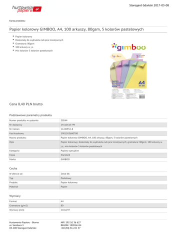Starogard Gdański 2017-03-08 Karta produktu: Papier kolorowy GIMBOO, A4, 100 arkuszy, 80gsm, 5 kolorów pastelowych Papier kolorowy Doskonały do wydruków lub prac kreatywnych Gramatura: 80gsm 100 arkuszy w j.s. Mix kolorów 5 kolorów pastelowych Cena 8,40 PLN brutto Podstawowe parametry produktu Numer produktu w systemie 30544 Nr dostawcy 14110115-99 Nr Celcen 14-00932-8 Kod kreskowy 5901503680780 Nazwa produktu Papier kolorowy GIMBOO, A4, 100 arkuszy, 80gsm, 5 kolorów pastelowych Opis Papier kolorowy; doskonały do wydruków lub prac kreatywnych; gramatura: 80gsm; 100 arkuszy w j.s.; mix kolorów 5 kolorów pastelowych Kategoria Papiery specjalne Klasa Standard Marka GIMBOO Cecha W ofercie od 2016-06 Typ Pastelowy Produkt Papier kolorowy Materiał Papier Wymiary Format A4 Gramatura (g/m2) 80 Wymiary (mm) 210x297 Hurtowania Papieru - Borma ul. Sambora 3 83-200 Starogard Gdański NIP: 592 10 36 627 REGON: 190916154 +48 (58) 56 221 37 Starogard Gdański 2017-03-08 Karta katalogowa produktu cd. Papier kolorowy GIMBOO, A4, 100 arkuszy, 80gsm, 5 kolorów pastelowych Wspólny słownik zamówień CPV 30197600-2 Papier i tektura gotowe Certyfikaty Nowy produkt w ofercie Standard Hit Standard Ilość Ilość arkuszy 100 Kolor Kolor Mix kolorów Serdecznie zapraszamy do współpracy Hurtowania Papieru - Borma zespół. Hurtowania Papieru - Borma ul. Sambora 3 83-200 Starogard Gdański NIP: 592 10 36 627 REGON: 190916154 +48 (58) 56 221 37