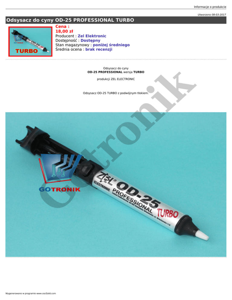 Informacje o produkcie Utworzono 08-03-2017 Odsysacz do cyny OD-25 PROFESSIONAL TURBO Cena : 18,00 zł Producent : Zel Elektronic Dostępność : Dostępny Stan magazynowy : poniżej średniego Średnia ocena : brak recenzji Odsysacz do cyny OD-25 PROFESSIONAL wersja TURBO on ik produkcji ZEL ELECTRONIC G ot r Odsysacz OD-25 TURBO z podwójnym tłokiem. Wygenerowano w programie www.oscGold.com