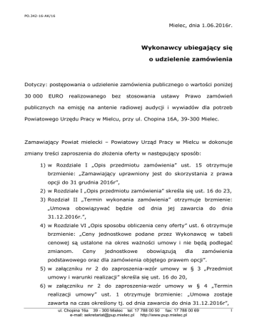 PO.342-16-AK/16 Mielec, dnia 1.06.2016r. Wykonawcy ubiegający się o udzielenie zamówienia Dotyczy: postępowania o udzielenie zamówienia publicznego o wartości poniżej 30 000 EURO realizowanego bez stosowania ustawy Prawo zamówień publicznych na emisję na antenie radiowej audycji i wywiadów dla potrzeb Powiatowego Urzędu Pracy w Mielcu, przy ul. Chopina 16A, 39-300 Mielec. Zamawiający Powiat mielecki – Powiatowy Urząd Pracy w Mielcu w dokonuje zmiany treści zaproszenia do złożenia oferty w następujący sposób: 1) w Rozdziale I „Opis przedmiotu zamówienia” ust. 15 otrzymuje brzmienie: „Zamawiający uprawniony jest do skorzystania z prawa opcji do 31 grudnia 2016r”, 2) w Rozdziale I „Opis przedmiotu zamówienia” skreśla się ust. 16 do 23, 3) Rozdział II „Termin wykonania zamówienia” otrzymuje brzmienie: „Umowa obowiązywać będzie od dnia jej zawarcia do dnia 31.12.2016r.”, 4) w Rozdziale VI „Opis sposobu obliczenia ceny oferty” ust. 6 otrzymuje brzmienie: „Ceny jednostkowe podane przez Wykonawcę w tabeli cenowej są ustalone na okres ważności umowy i nie będą podlegać zmianom. Ceny jednostkowe obowiązują dla zamówienia podstawowego oraz dla zamówienia objętego prawem opcji”. 5) w załączniku nr 2 do zaproszenia-wzór umowy w § 3 „Przedmiot umowy i warunki realizacji” skreśla się ust. 16 do 20, 6) w załączniku nr 2 do zaproszenia-wzór umowy w § 4 „Termin realizacji umowy” ust. 1 otrzymuje brzmienie: „Umowa zostaje zawarta na czas określony tj. od dnia zawarcia do dnia 31.12.2016r”, ul. Chopina 16a 39 - 300 Mielec tel: 17 788 00 50 fax: 17 788 00 69 e-mail: [email protected] http://www.pup.mielec.pl 1 PO.342-16-AK/16 7) w załączniku nr 2 do zaproszenia-wzór umowy w § 4 „Termin realizacji umowy” ust. 2 otrzymuje brzmienie: „Zamawiający uprawniony jest do skorzystania z prawa opcji do 31.12.2016r”, 8) w załączniku nr 2 do zaproszenia-wzór umowy w § 6 „Wynagrodzenie” ust. 1 otrzymuje brzmienie: „Maksymalne wynagrodzenie Wykonawcy z tytułu realizacji przedmiotu umowy wynosić będzie: ……………… PLN brutto, (słownie: ………………………), w tym: 1) wartość zamówienia podstawowego zostaje określona na kwotę ………………… …. PLN brutto, (słownie: ………….…….………..……), 2) wartość zamówień objętych prawem wynosić będzie maksymalnie: ………. PLN brutto, (słownie: …………………...………)”, 9) w załączniku nr 2 do zaproszenia-wzór umowy w § 6 „Wynagrodzenie” skreśla się ust. 2, 10) w załączniku nr 2 do zaproszenia-wzór umowy w § 6 „Wynagrodzenie” ust. 6 (wg. nowej numeracji) otrzymuje brzmienie: „Strony ustalają, że w okresie trwania Umowy ceny jednostkowe wynikające z oferty Wykonawcy nie ulegną zmianie”, 11) w załączniku nr 2 do zaproszenia-wzór umowy w § 11 „Postanowienia końcowe” ust. 5 otrzymuje brzmienie: „Formy aneksu nie wymagają zmiany danych adresowych, osób do kontaktów zmiany te nastąpią na podstawie jednostronnego, pisemnego powiadomienia”. Jednolity tekst zaproszenia do złożenia oferty po uwzględnieniu wprowadzonych zmian stanowi załącznik do niniejszego pisma. Jednocześnie Zamawiający wydłuża termin składania ofert do dnia 03.06.2016r do godz. 10.00. Podpisał: Stanisław Stachowicz Dyrektor PUP w Mielcu ul. Chopina 16a 39 - 300 Mielec tel: 17 788 00 50 fax: 17 788 00 69 e-mail: [email protected] http://www.pup.mielec.pl 2