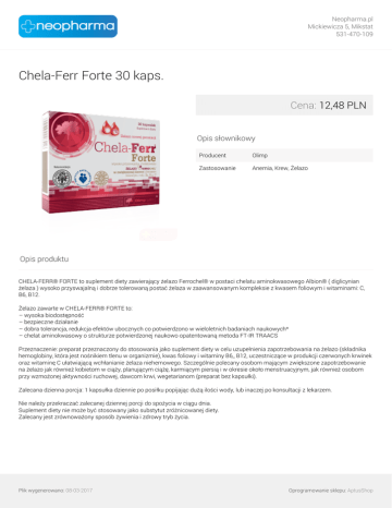 Neopharma.pl Mickiewicza 5, Mikstat 531-470-109 Chela-Ferr Forte 30 kaps. Cena: 12,48 PLN Opis słownikowy Producent Olimp Zastosowanie Anemia, Krew, Żelazo Opis produktu CHELA-FERR® FORTE to suplement diety zawierający żelazo Ferrochel® w postaci chelatu aminokwasowego Albion® ( diglicynian żelaza ) wysoko przyswajalną i dobrze tolerowaną postać żelaza w zaawansowanym kompleksie z kwasem foliowym i witaminami: C, B6, B12. Żelazo zawarte w CHELA-FERR® FORTE to: – wysoka biodostępność – bezpieczne działanie – dobra tolerancja, redukcja efektów ubocznych co potwierdzono w wieloletnich badaniach naukowych* – chelat aminokwasowy o strukturze potwierdzonej naukowo opatentowaną metoda FT-IR TRAACS Przeznaczenie: preparat przeznaczony do stosowania jako suplement diety w celu uzupełnienia zapotrzebowania na żelazo (składnika hemoglobiny, która jest nośnikiem tlenu w organizmie), kwas foliowy i witaminy B6,, B12, uczestniczące w produkcji czerwonych krwinek oraz witaminę C ułatwiającą wchłanianie żelaza niehemowego. Szczególnie polecany osobom mającym zwiększone zapotrzebowanie na żelazo jak również kobietom w ciąży, planującym ciążę, karmiącym piersią i w okresie około menstruacyjnym, jak również osobom przy wzmożonej aktywności ruchowej, dawcom krwi, wegetarianom (preparat bez kapsułki). Zalecana dzienna porcja: 1 kapsułka dziennie po posiłku popijając dużą ilości wody, lub inaczej po konsultacji z lekarzem. Nie należy przekraczać zalecanej dziennej porcji do spożycia w ciągu dnia. Suplement diety nie może być stosowany jako substytut zróżnicowanej diety. Zalecany jest zrównoważony sposób żywienia i zdrowy tryb życia. Plik wygenerowano: 08-03-2017 Powered by TCPDF (www.tcpdf.org) Oprogramowanie sklepu: AptusShop